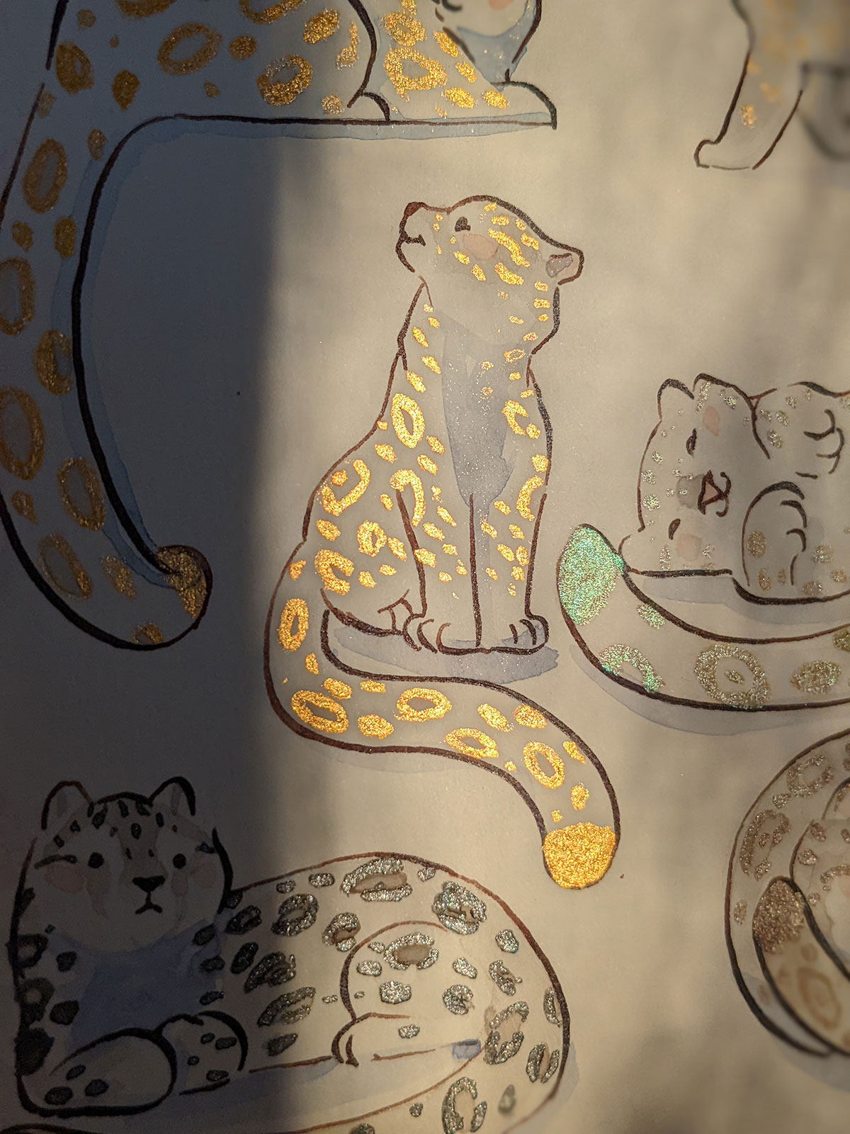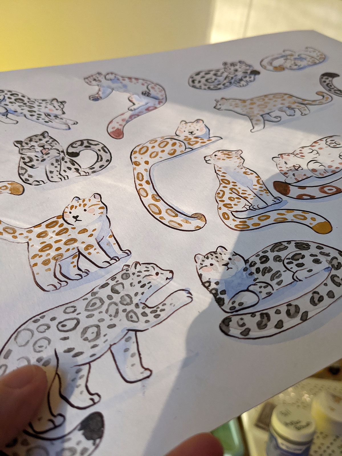 Original watercolor of 17 snow leopards painted with sparkling handmade watercolors. It’s about 22 x 31 cm / 9 x 12 inches on 350 g/m² heavy watercolor paper.