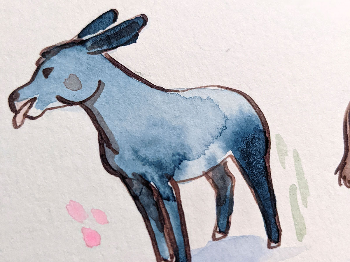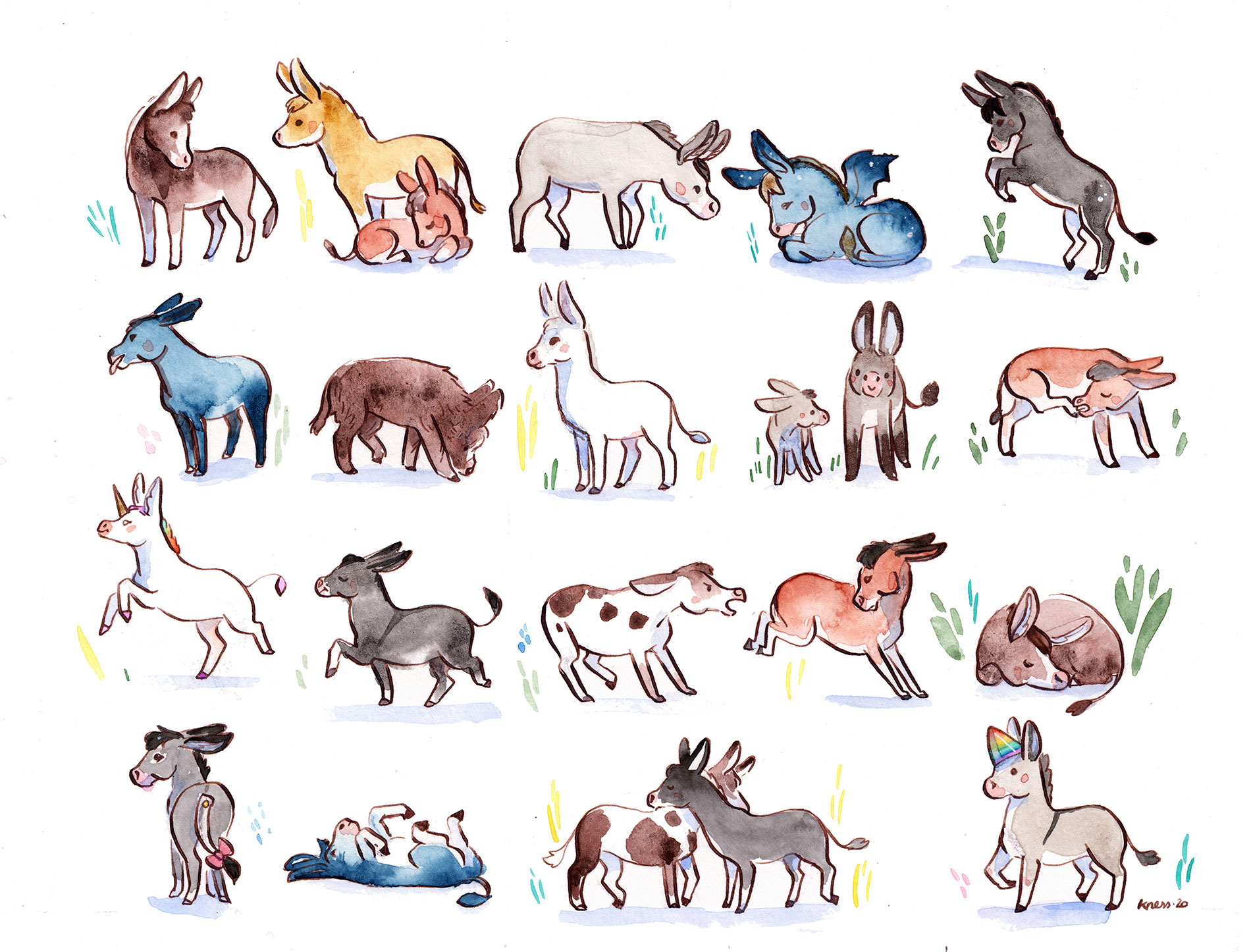 Original watercolor painting of 22 adorable donkeys. Each one is a character and they all have their strong personality. Strong headed, cute and sweet, you’ll find one or more very special donkeys in there.