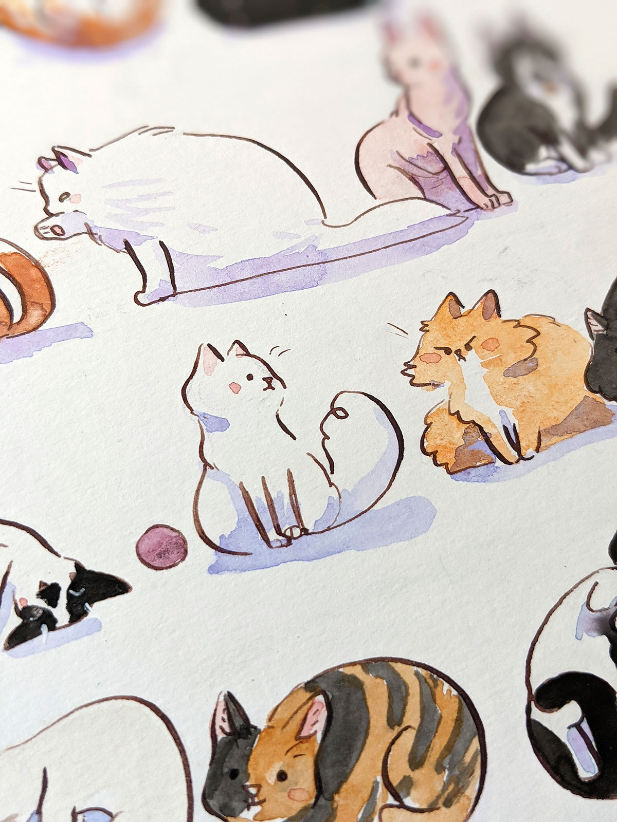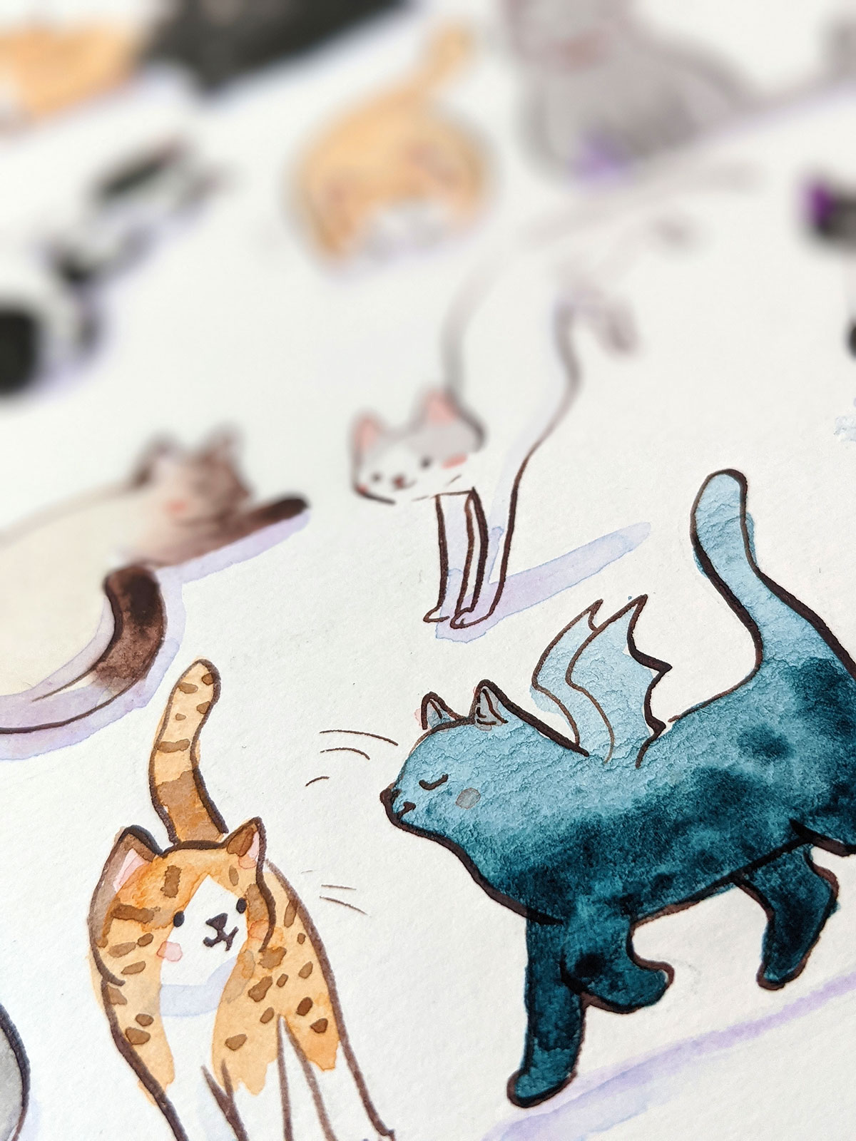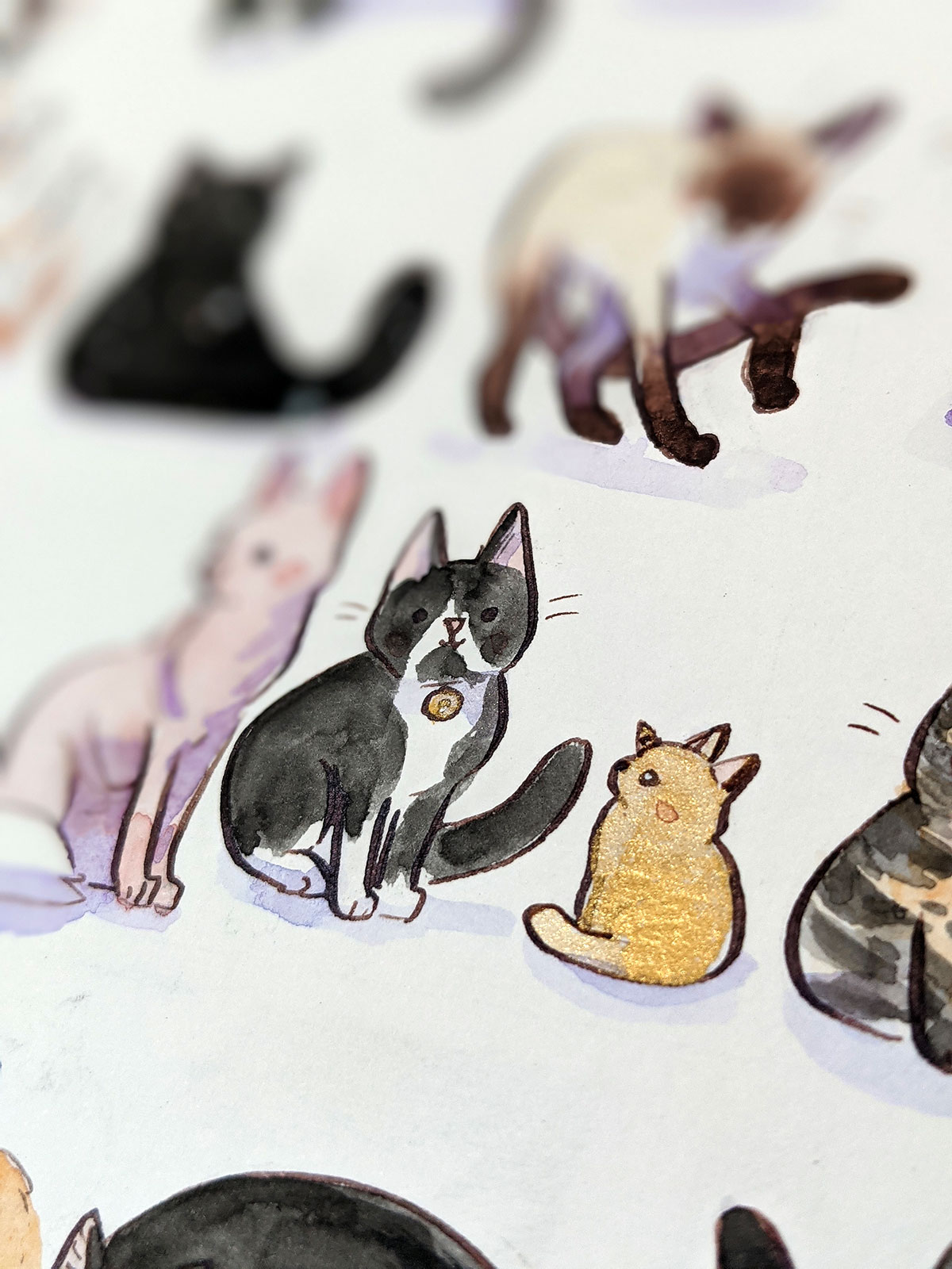 45 cute cats original watercolor painting. Hand drawn, inked and painted with handcrafted watercolors on heavy paper. Some paints are sparkling and cannot be printed.