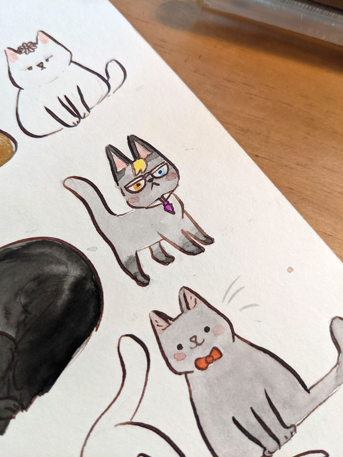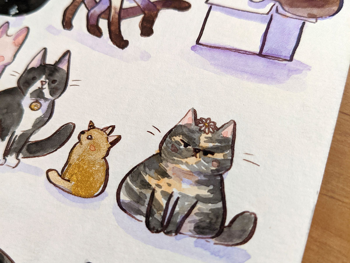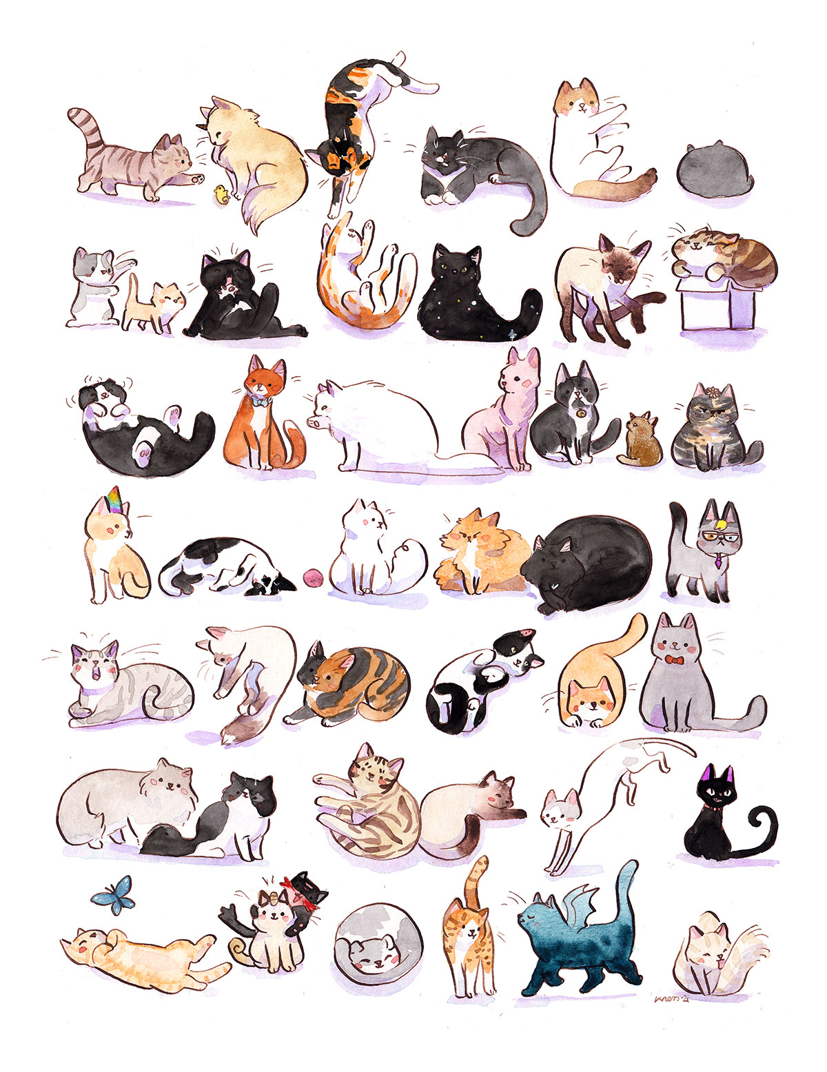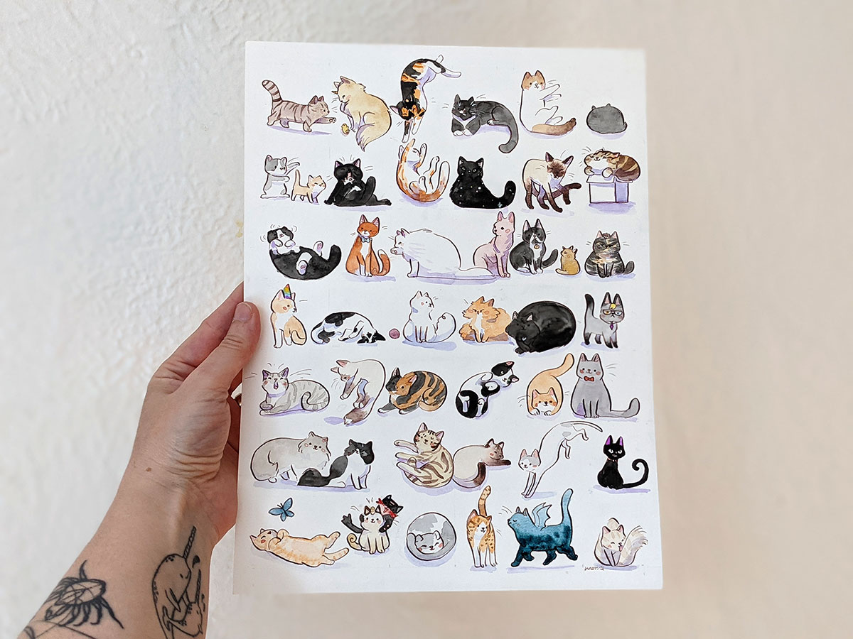 45 cute cats original watercolor painting. Hand drawn, inked and painted with handcrafted watercolors on heavy paper. Some paints are sparkling and cannot be printed.