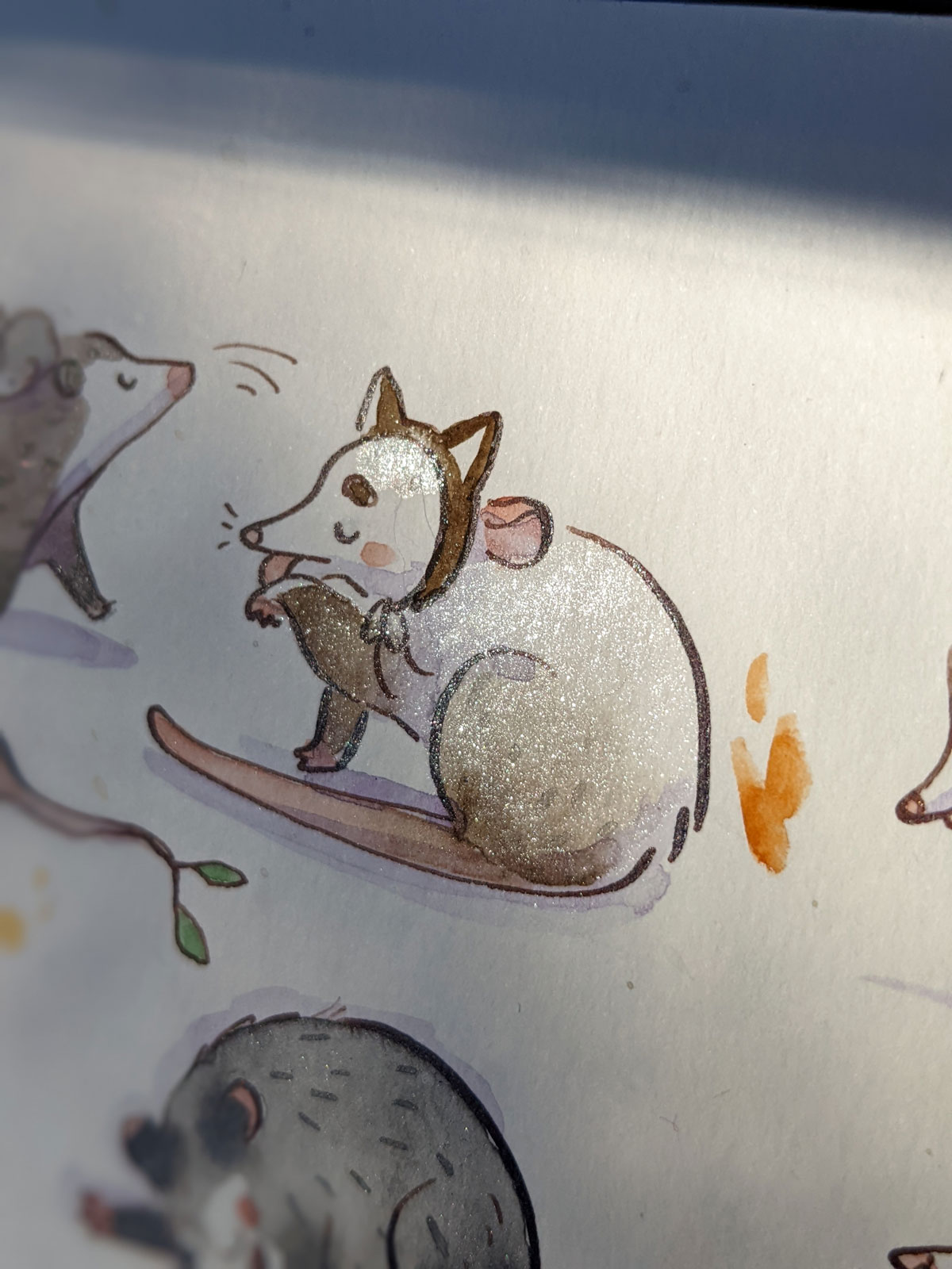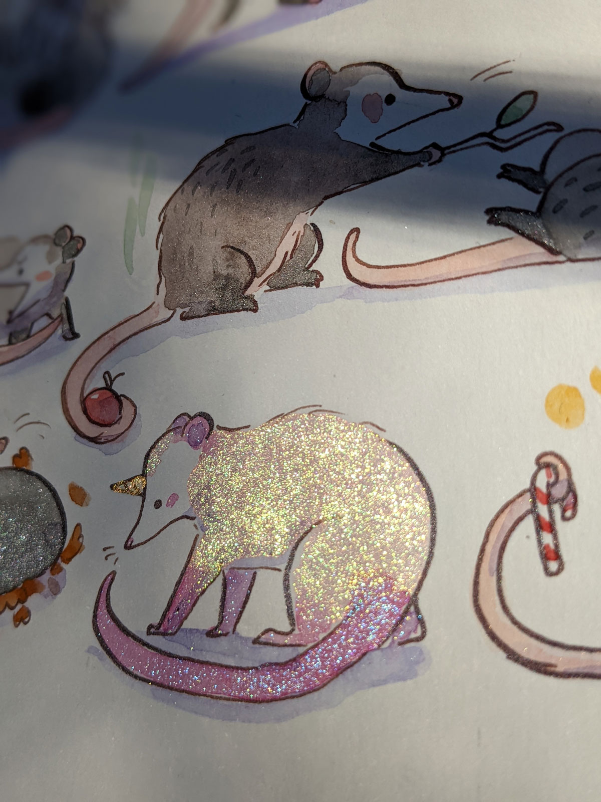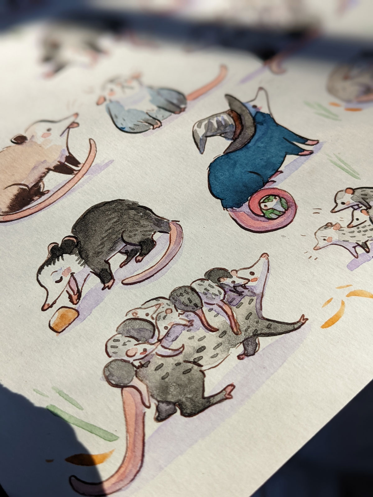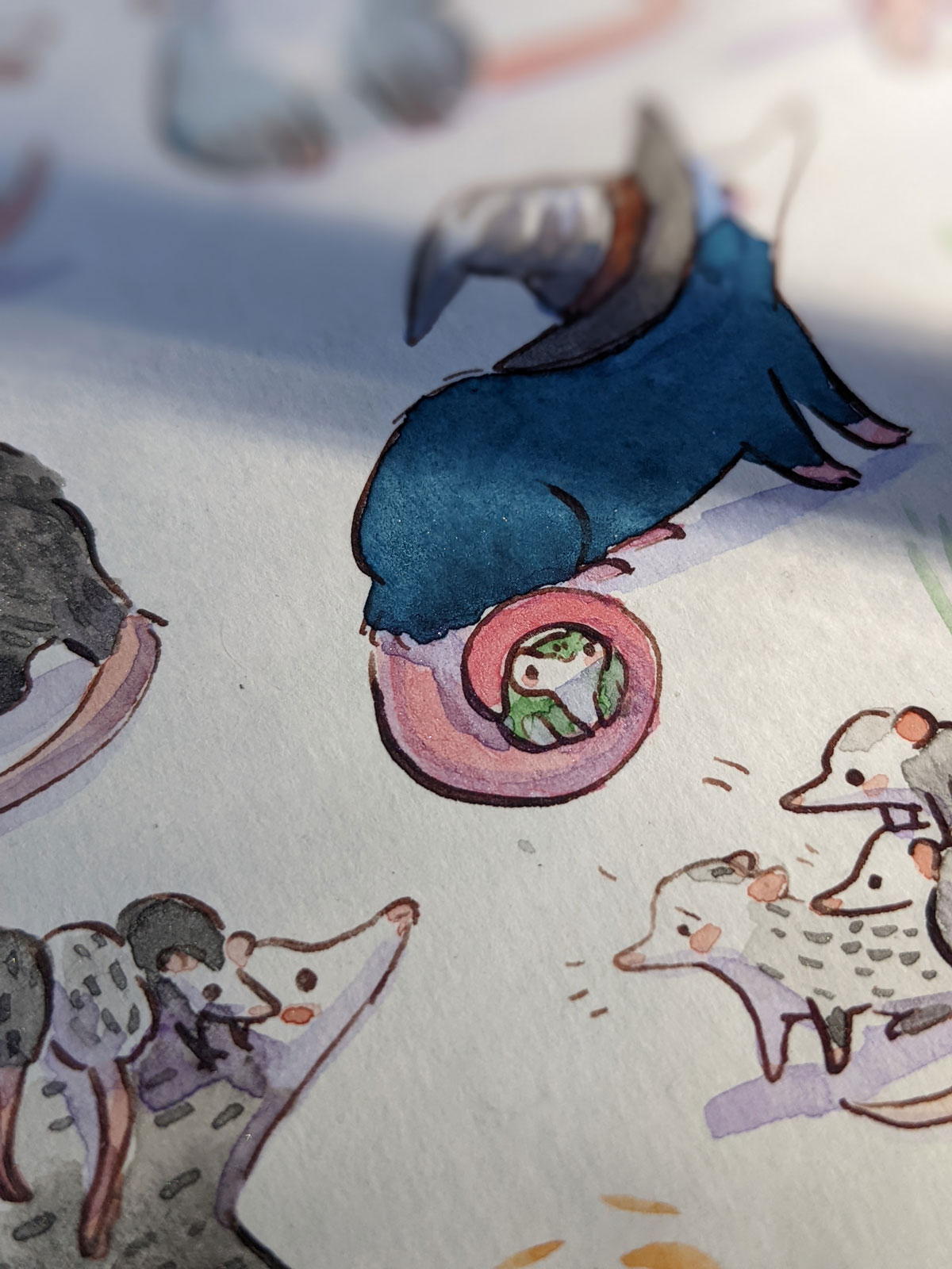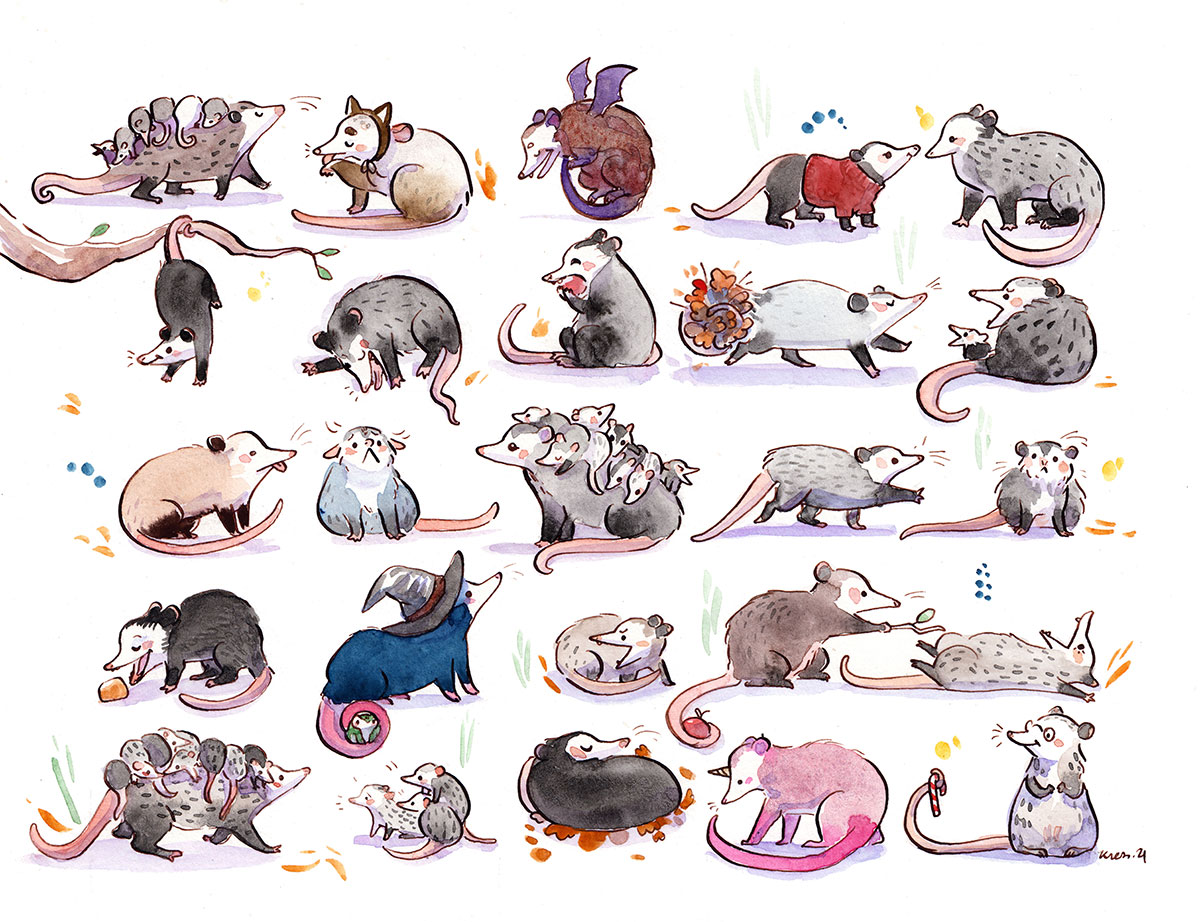 Original watercolor of 49 opossums and a frog; about 22 x 31 cm / 9 x 12 inches on 350 g/m² heavy watercolor paper.