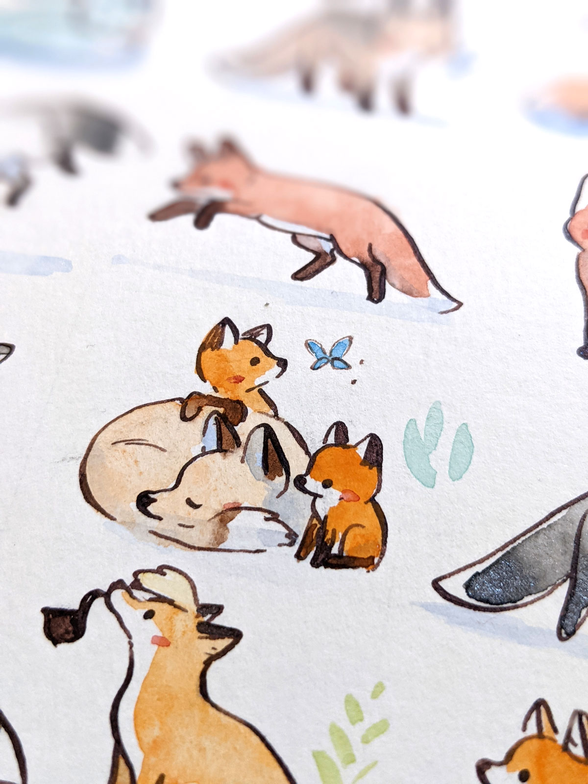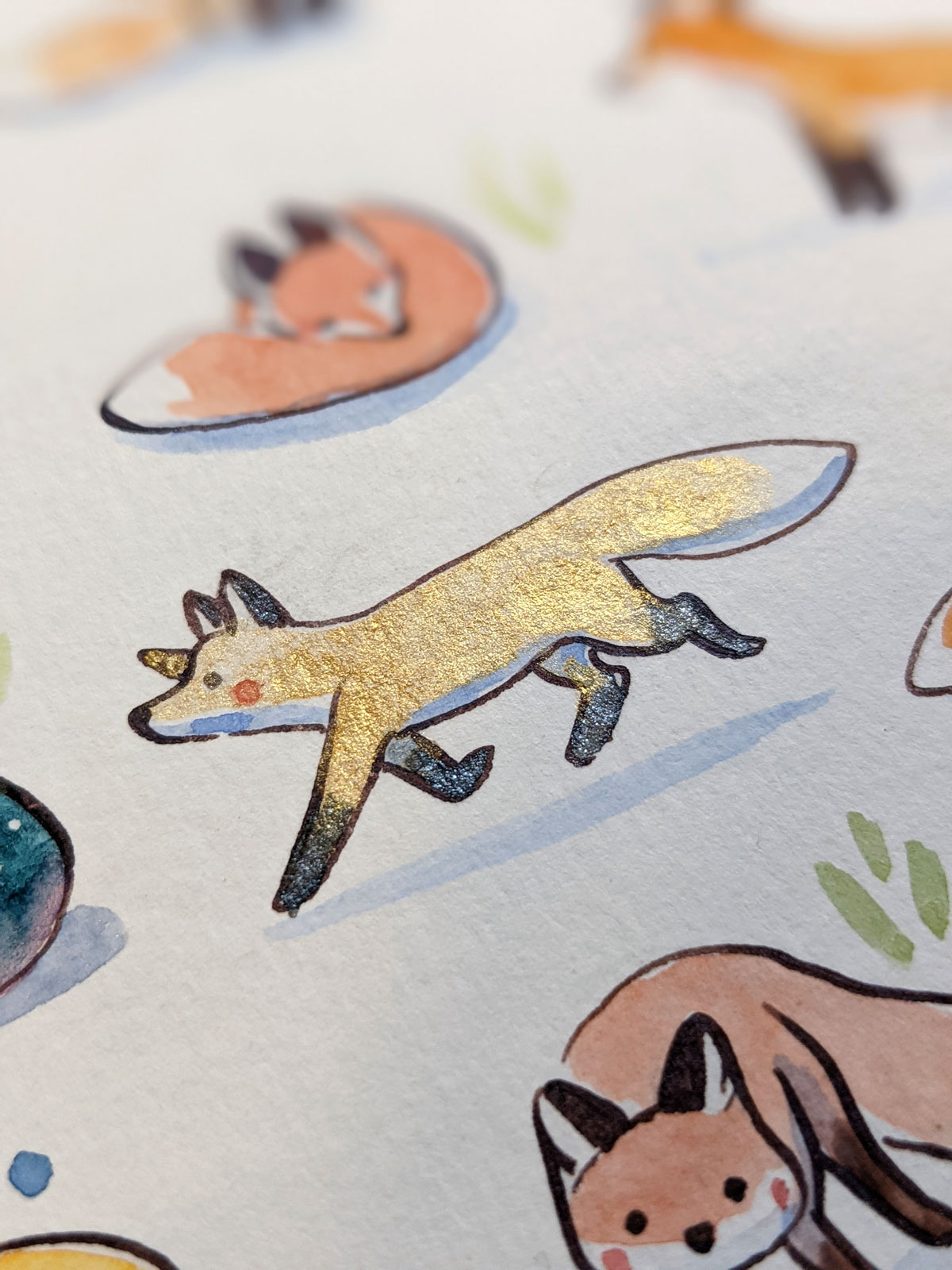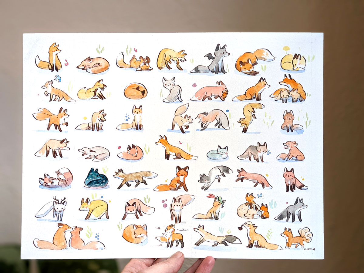 Original painting, about 22.9 x 31 cm. The 55 foxes are painted on heavy paper with handmade watercolors. Some paints are sparkly and cannot be printed and only visible on the original artwork.