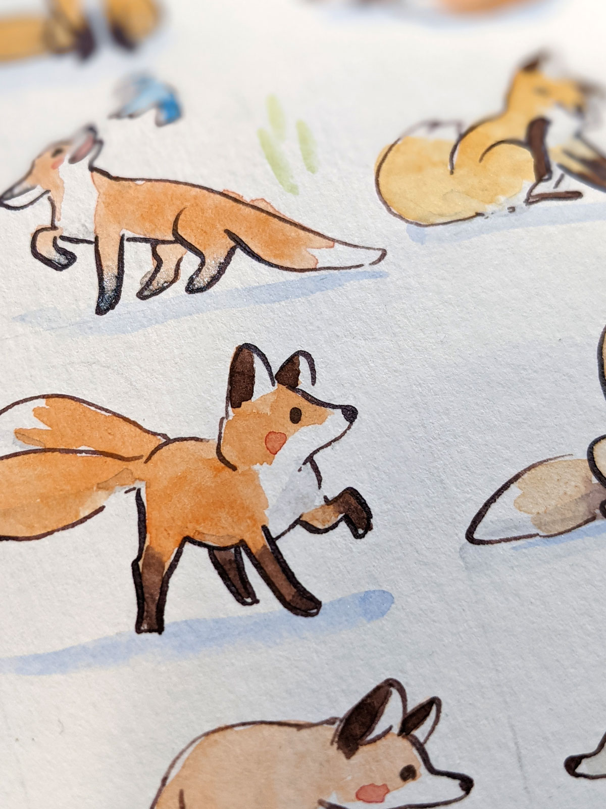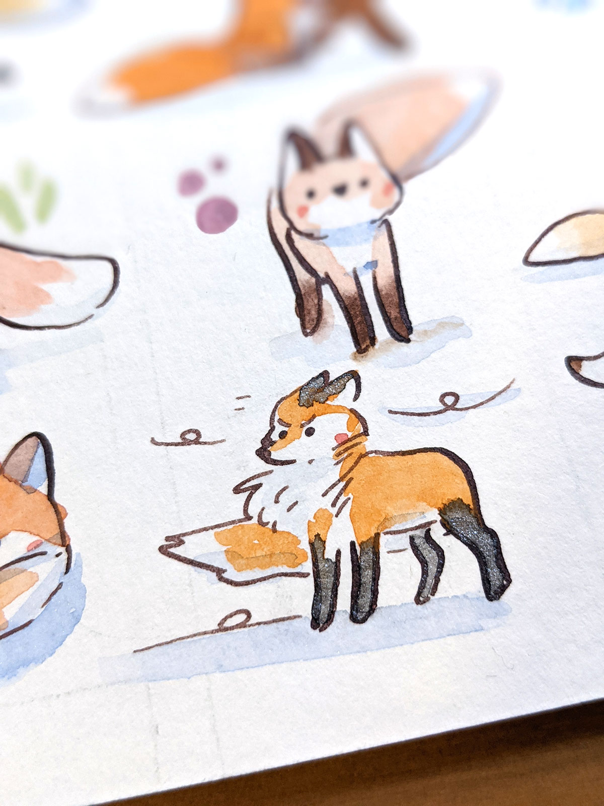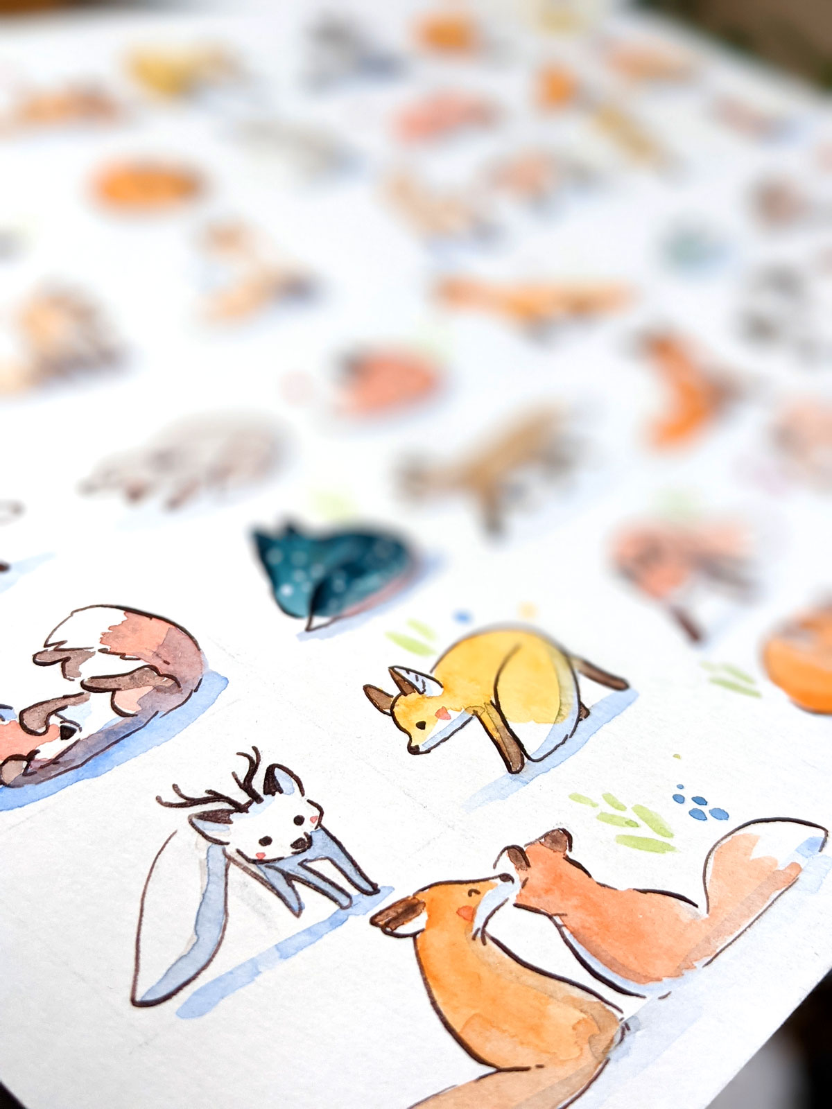 Original painting, about 22.9 x 31 cm. The 55 foxes are painted on heavy paper with handmade watercolors. Some paints are sparkly and cannot be printed and only visible on the original artwork.