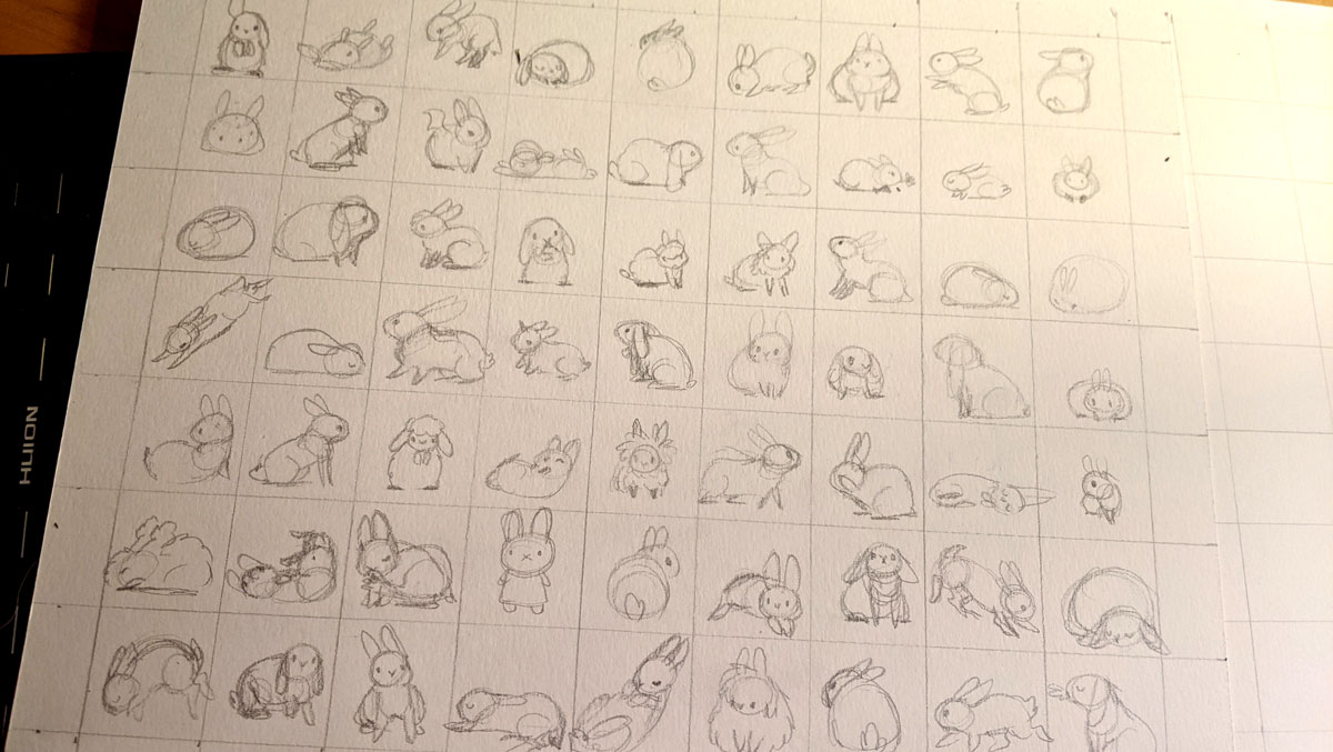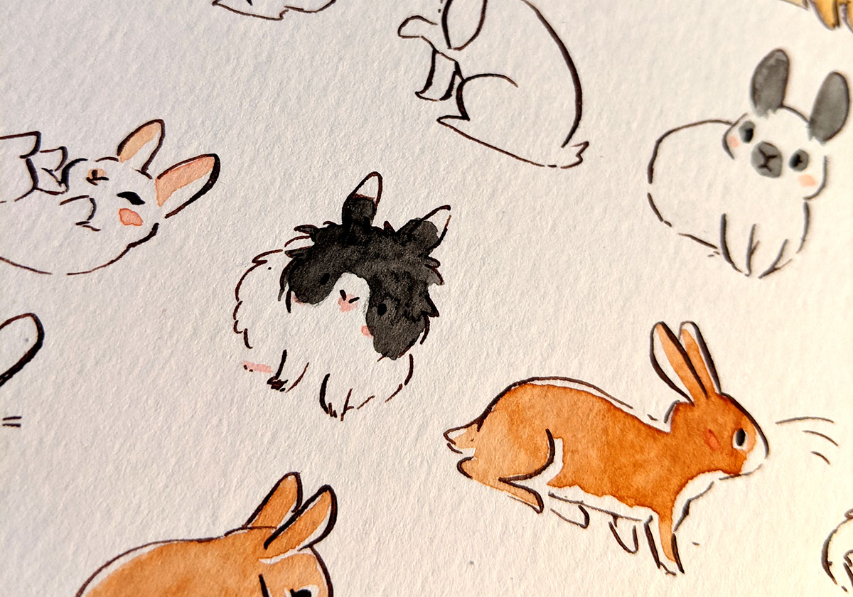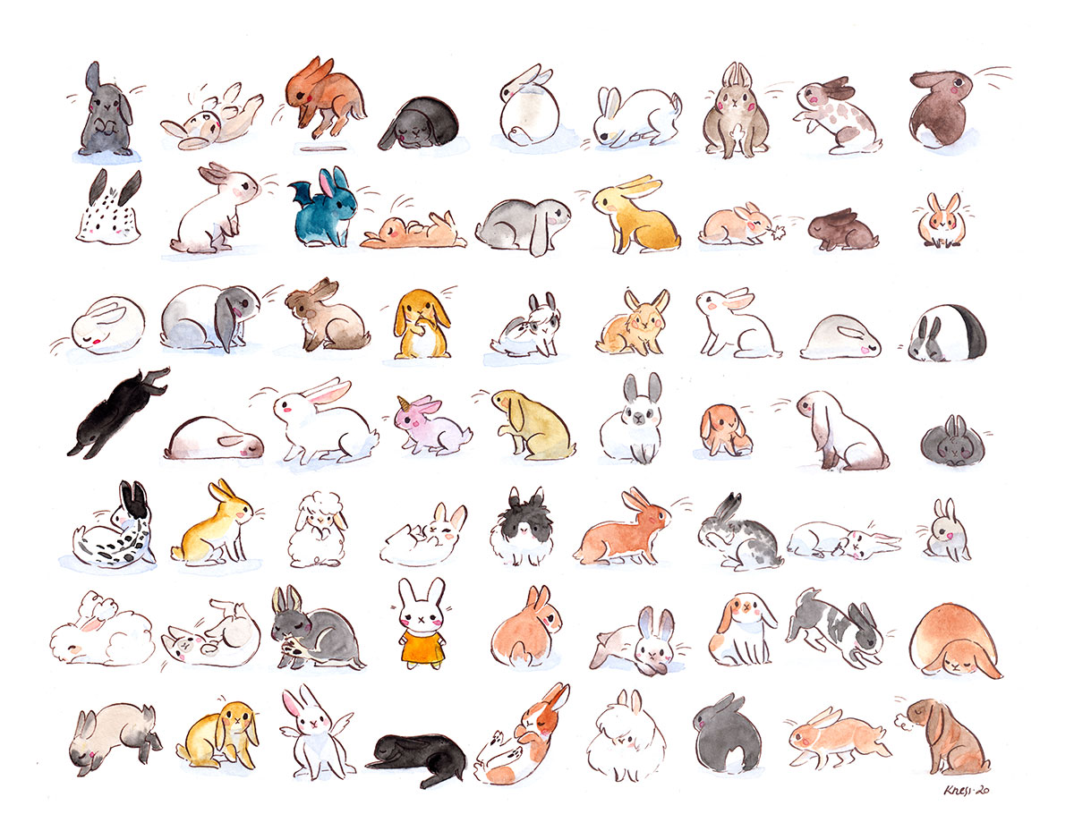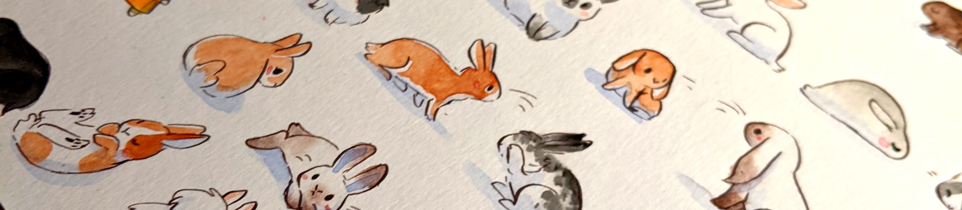 Original watercolor painting of 63 bunnies. This listing is for the painting only, no commercial or reproduction rights are included, and no scann or digital file will be provided. This painting is about 21 x 31 cm, on heavy watercolor paper, I used archival ink and White Nights watercolors, as well as Le Pigmentarium handcrafted watercolors.
