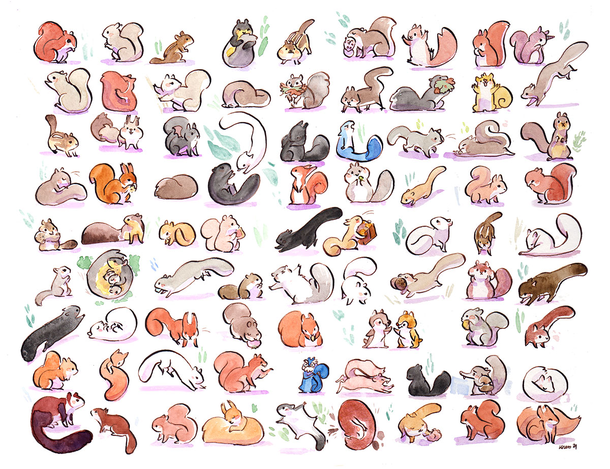 9 x 12 inches, original watercolor painting with 84 squirrels. Painted with handcrafted watercolors including sparkling paints.