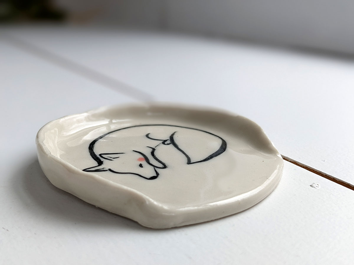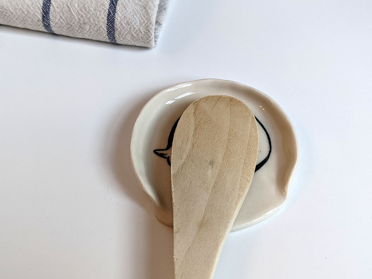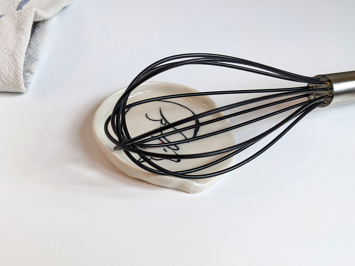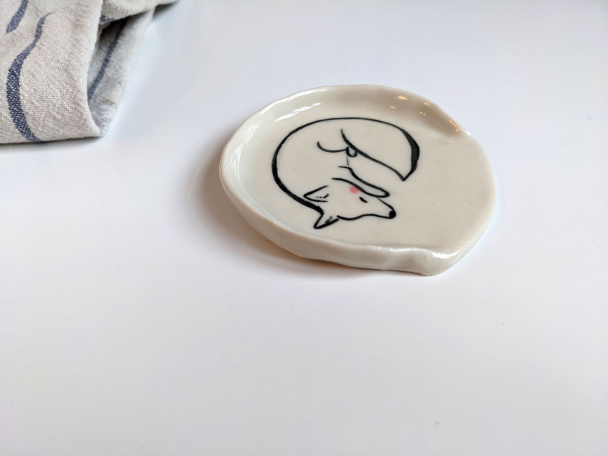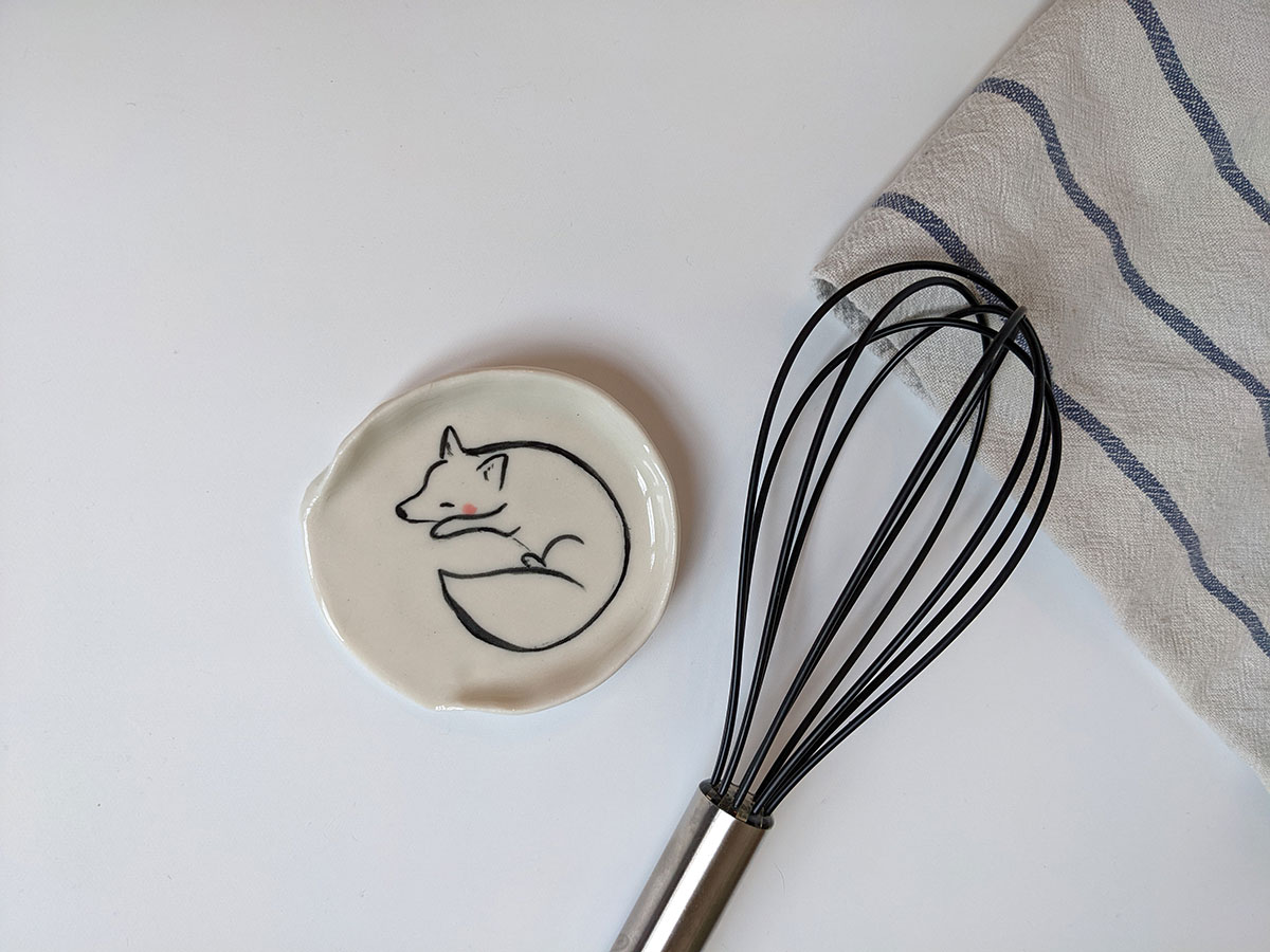 Small porcelain spoon rest, handmade in Montréal, with a hand drawn arctic fox.