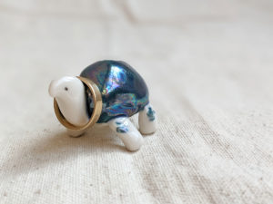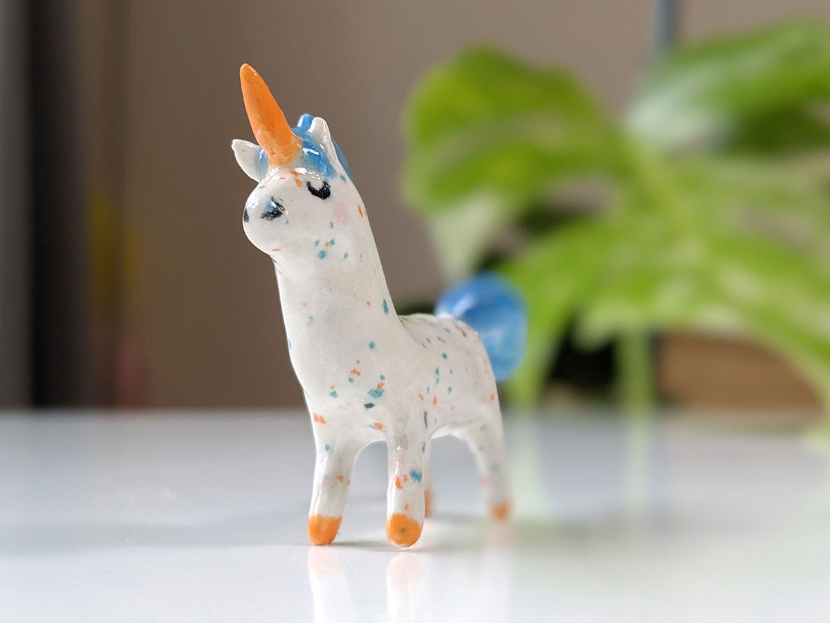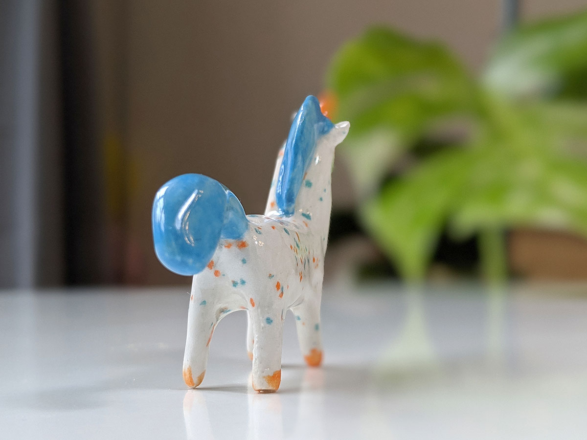 Small sprinkled ceramic unicorn with bright blue mane, yellow-orange horn and hooves. This unique miniature is handsculpted with love. It will bring you joy as it sits on your desk or keeps company to your best plant friends. About 7 cm in height and length.