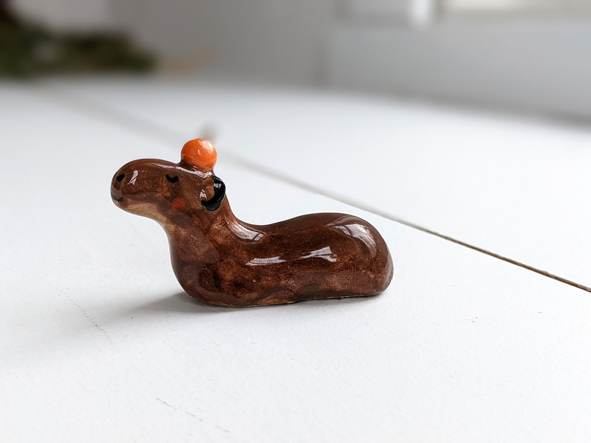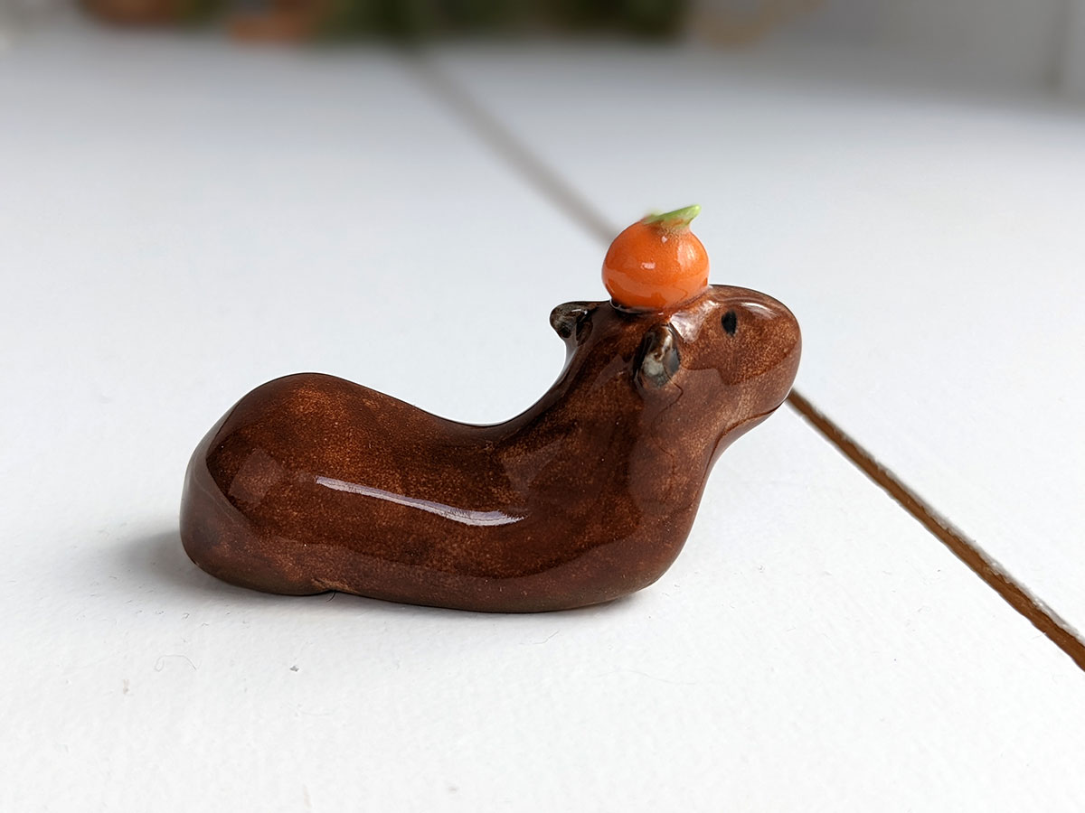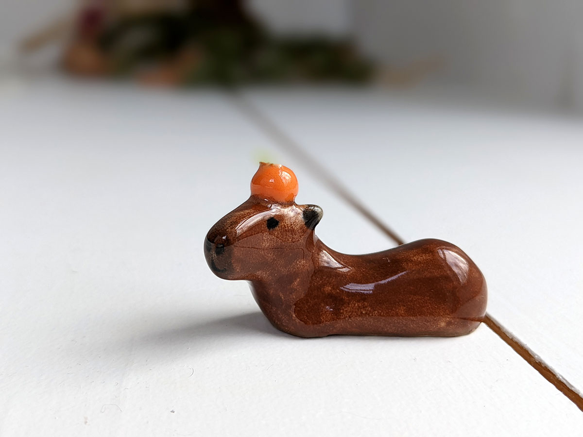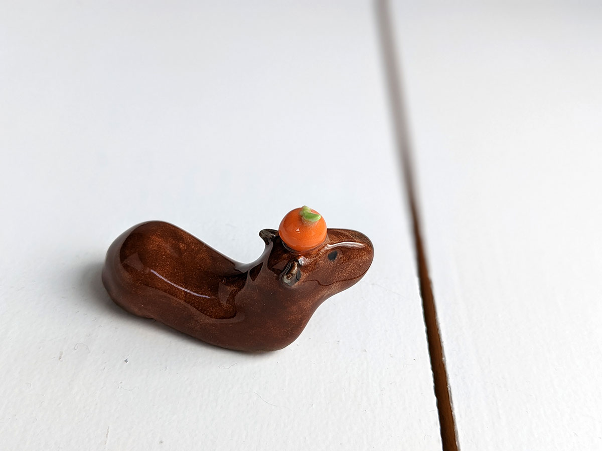 Capybara carrying an orange on their head. About 5 cm long.