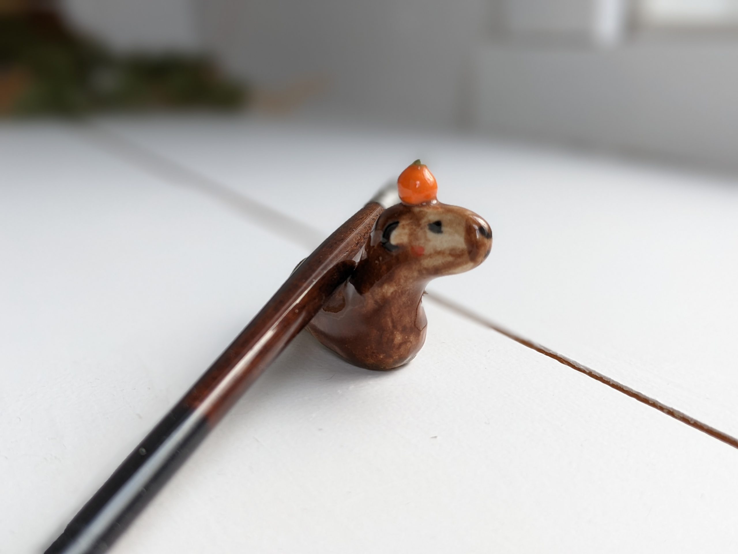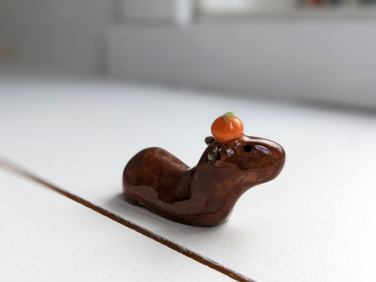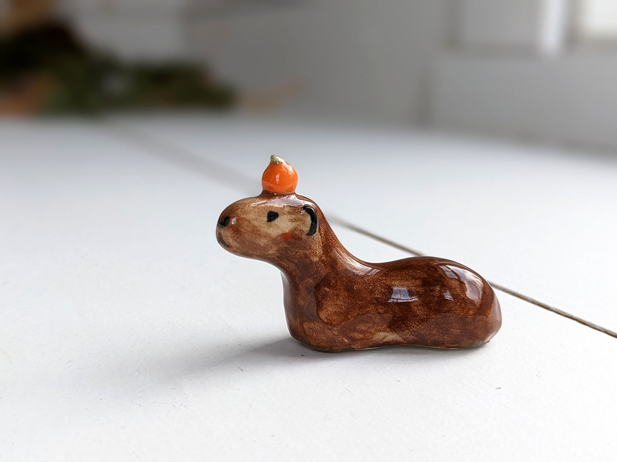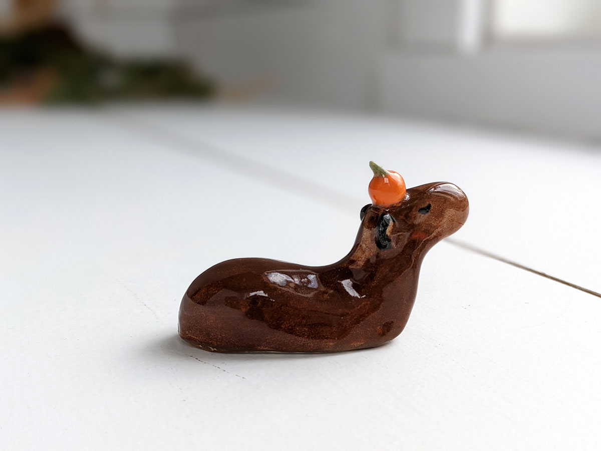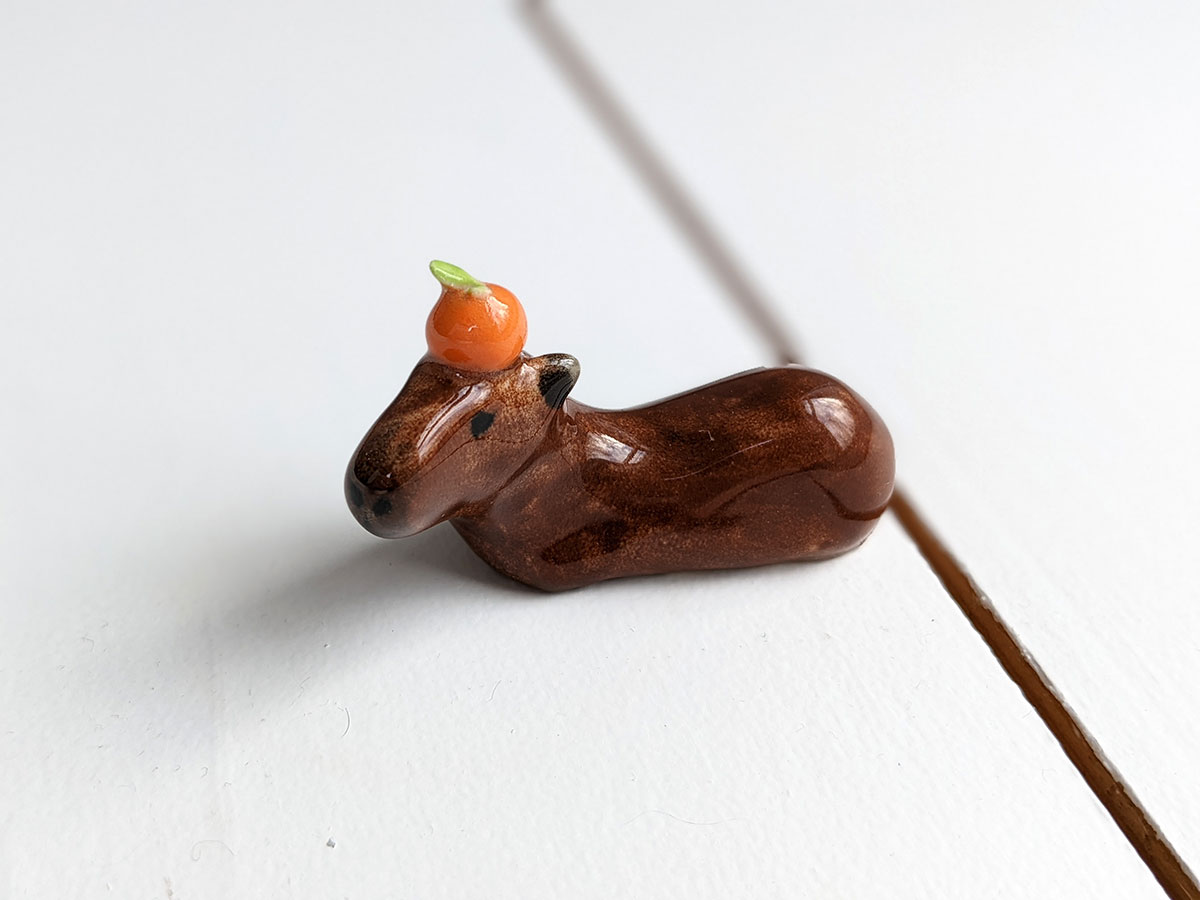 Capybara carrying an orange on their head. About 5 cm long.