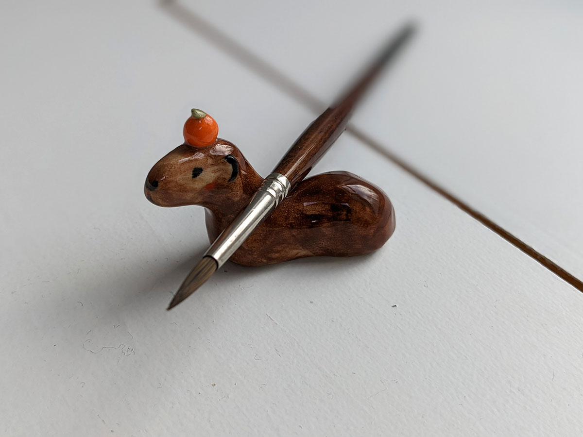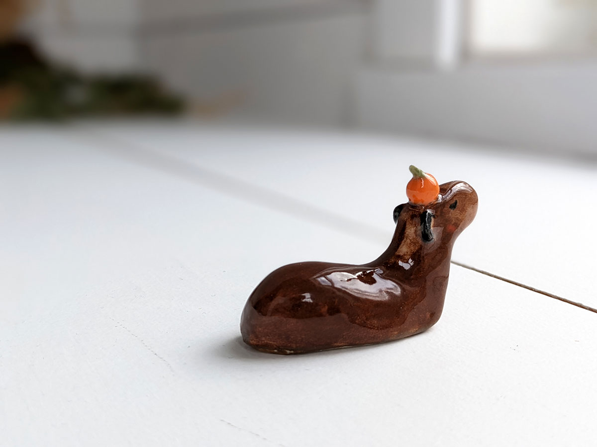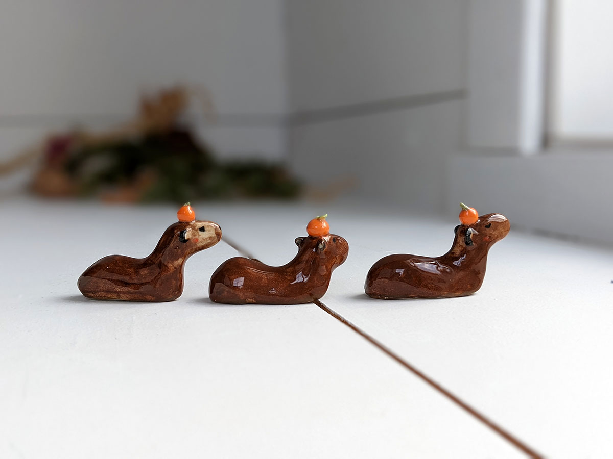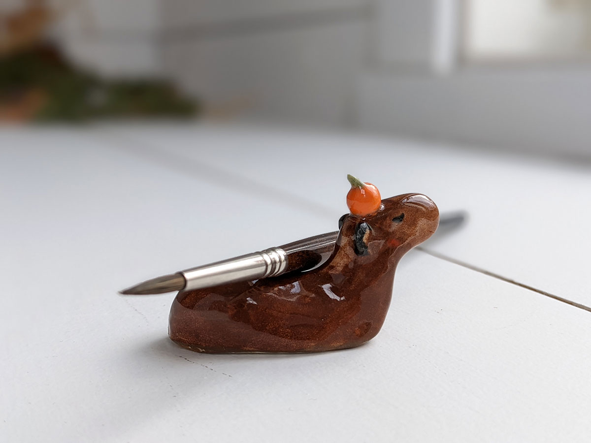 Capybara carrying an orange on their head. About 5 cm long.