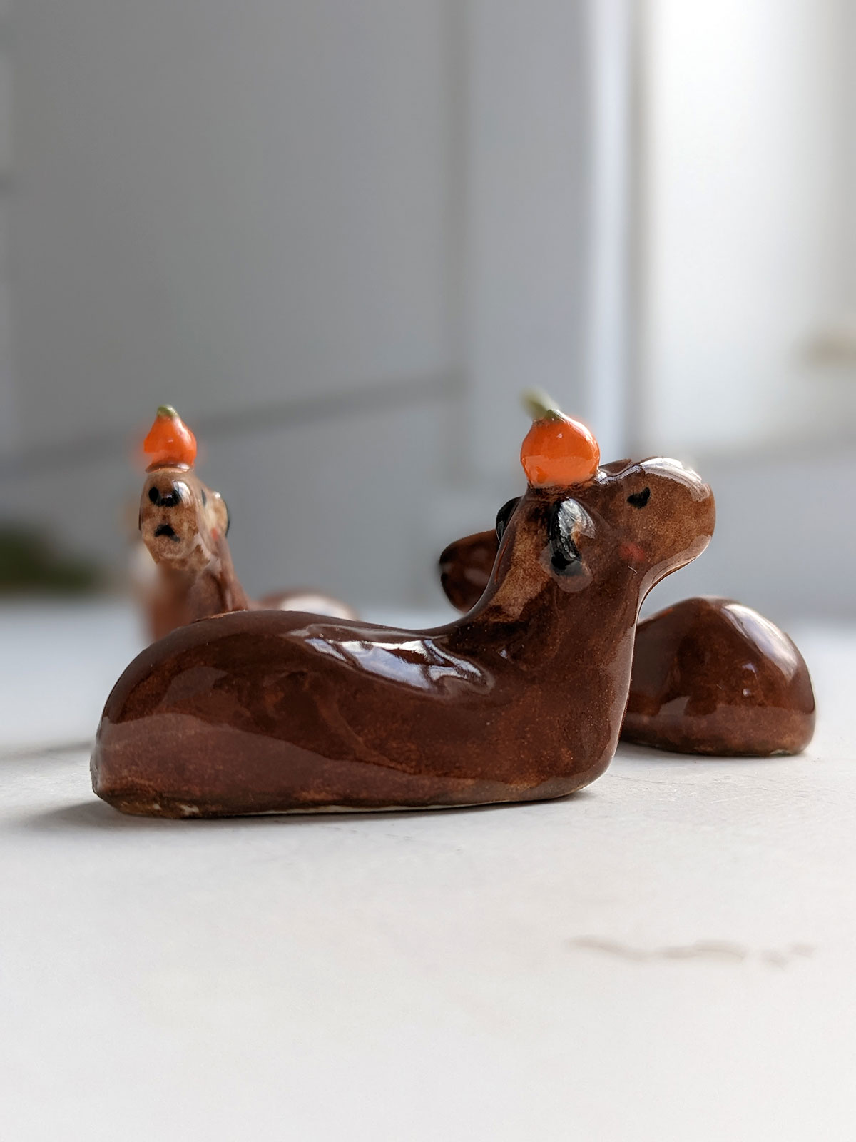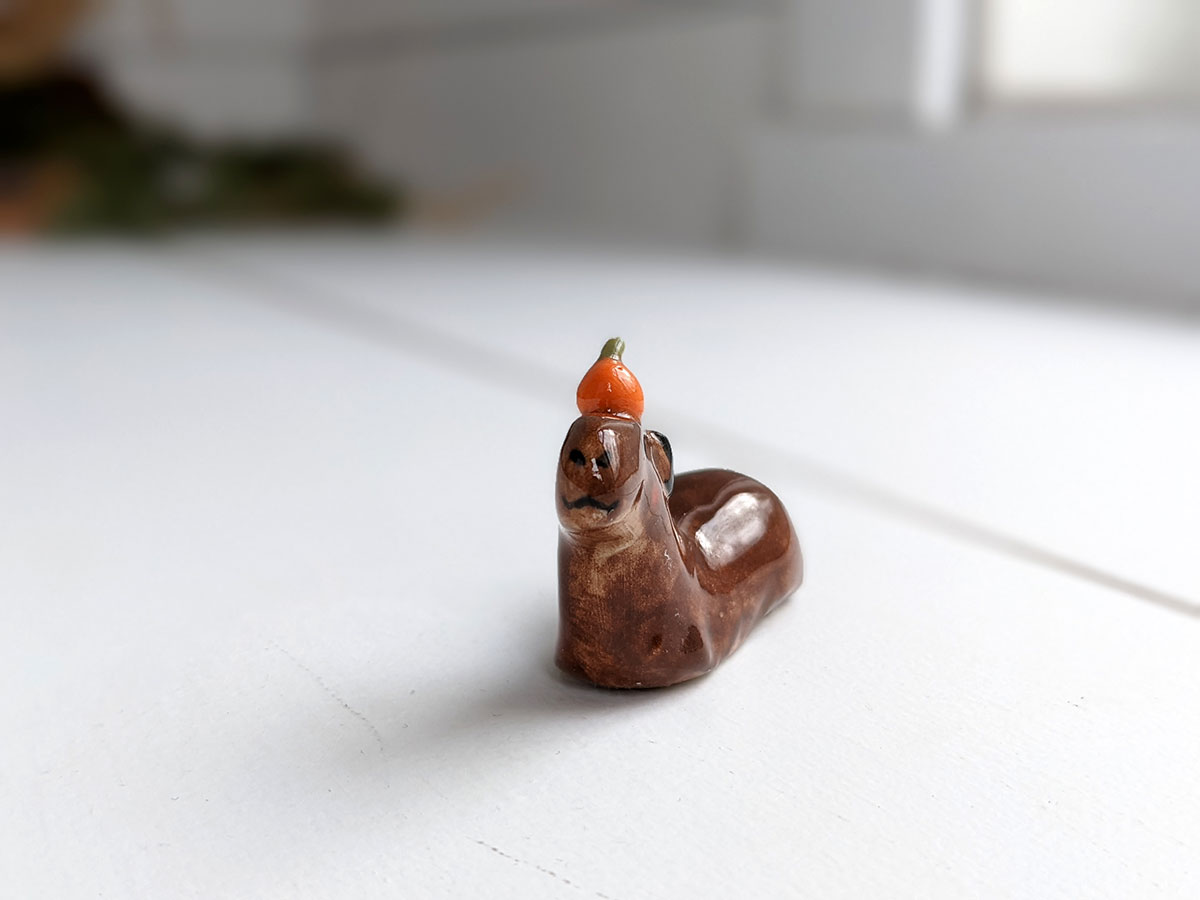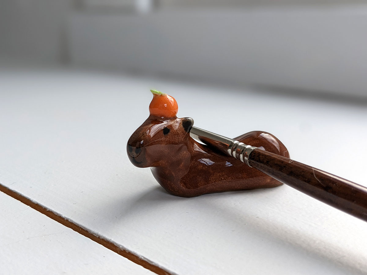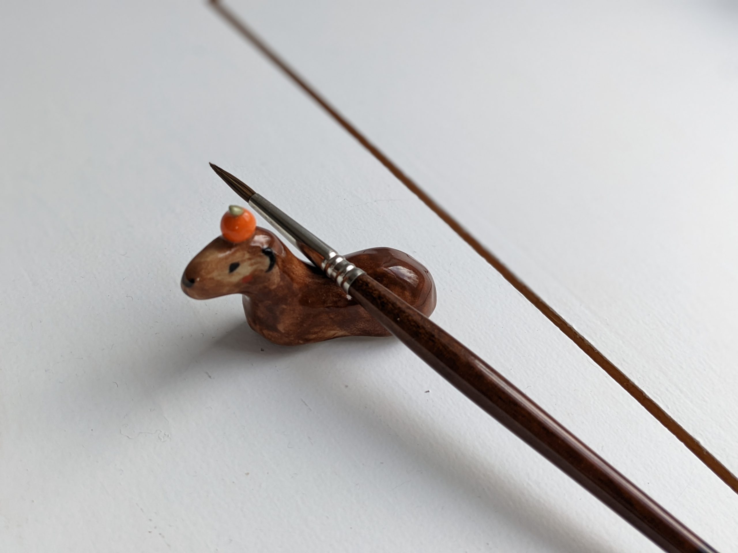 Capybara carrying an orange on their head. About 5 cm long.