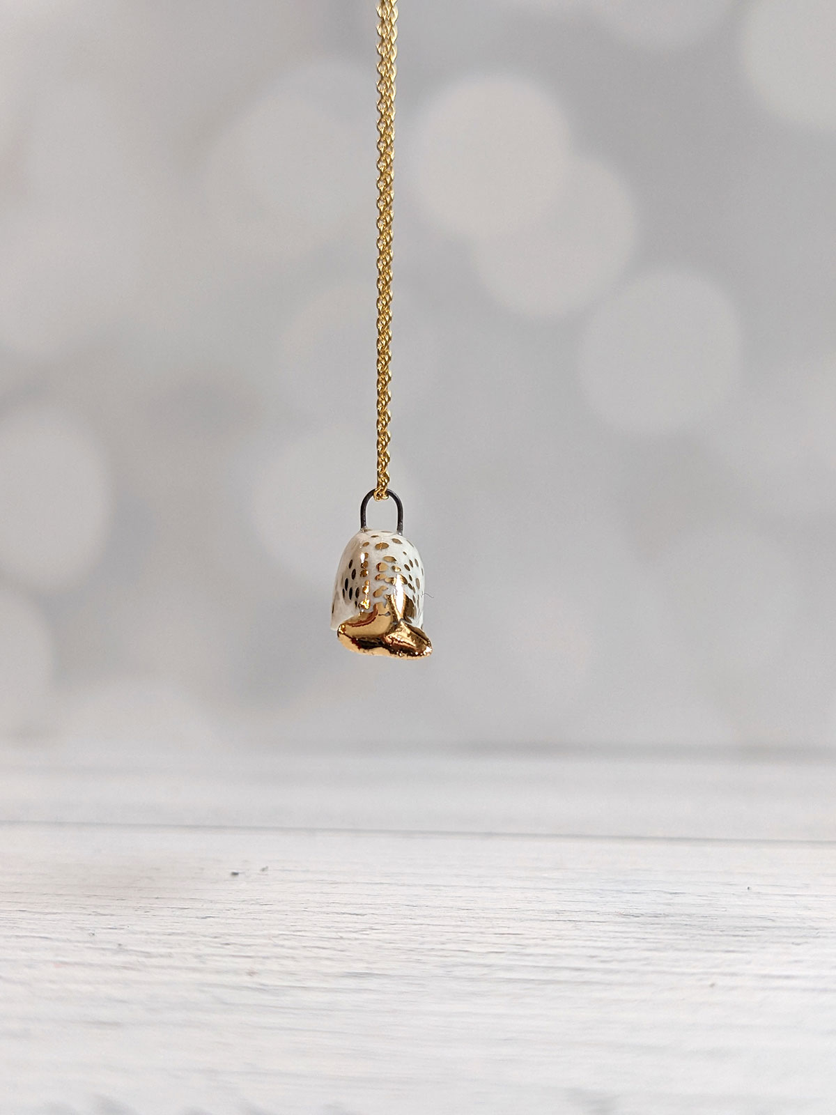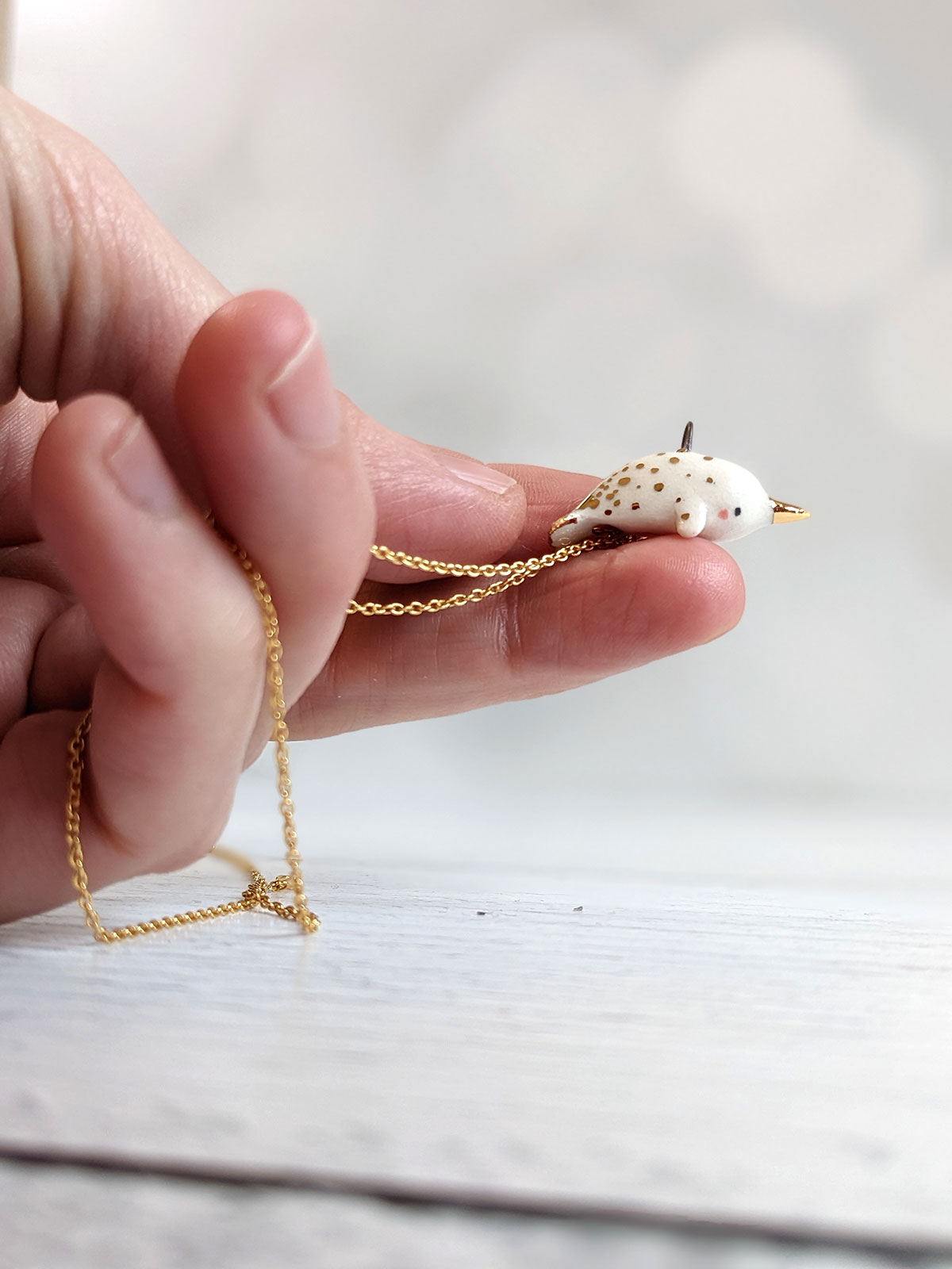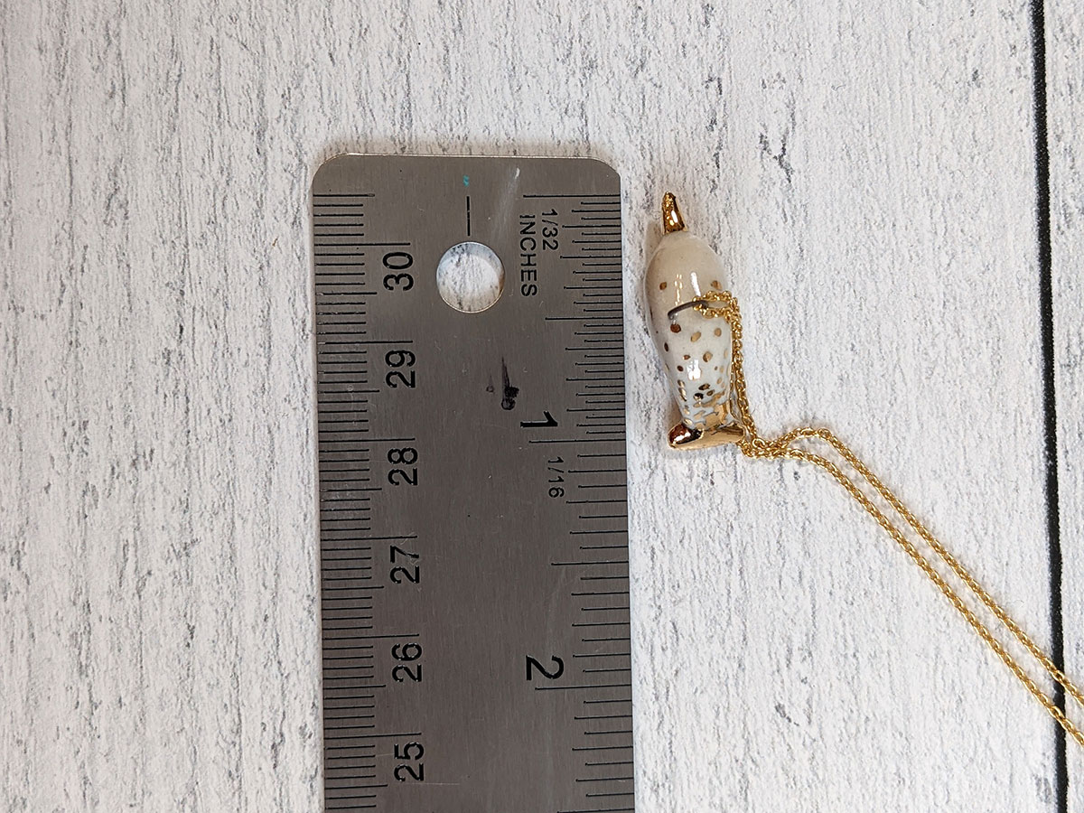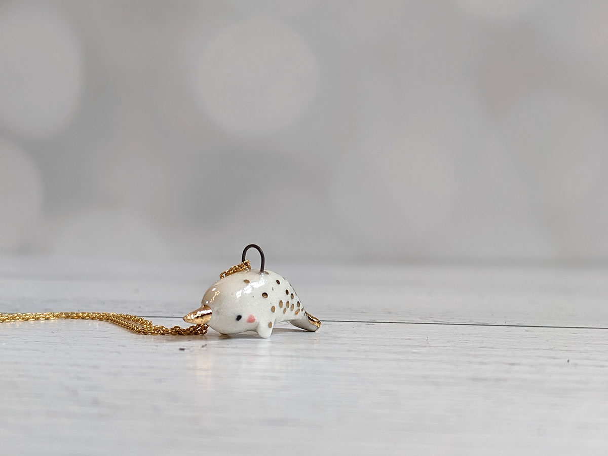 Tiny ceramic narwhal pendent, white porcelain, with gold highlights, it’s about 2 cm long. Unique piece of porcelain jewelry, it comes in a custom box.