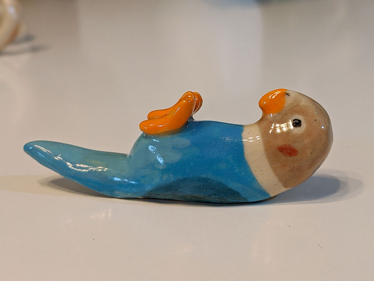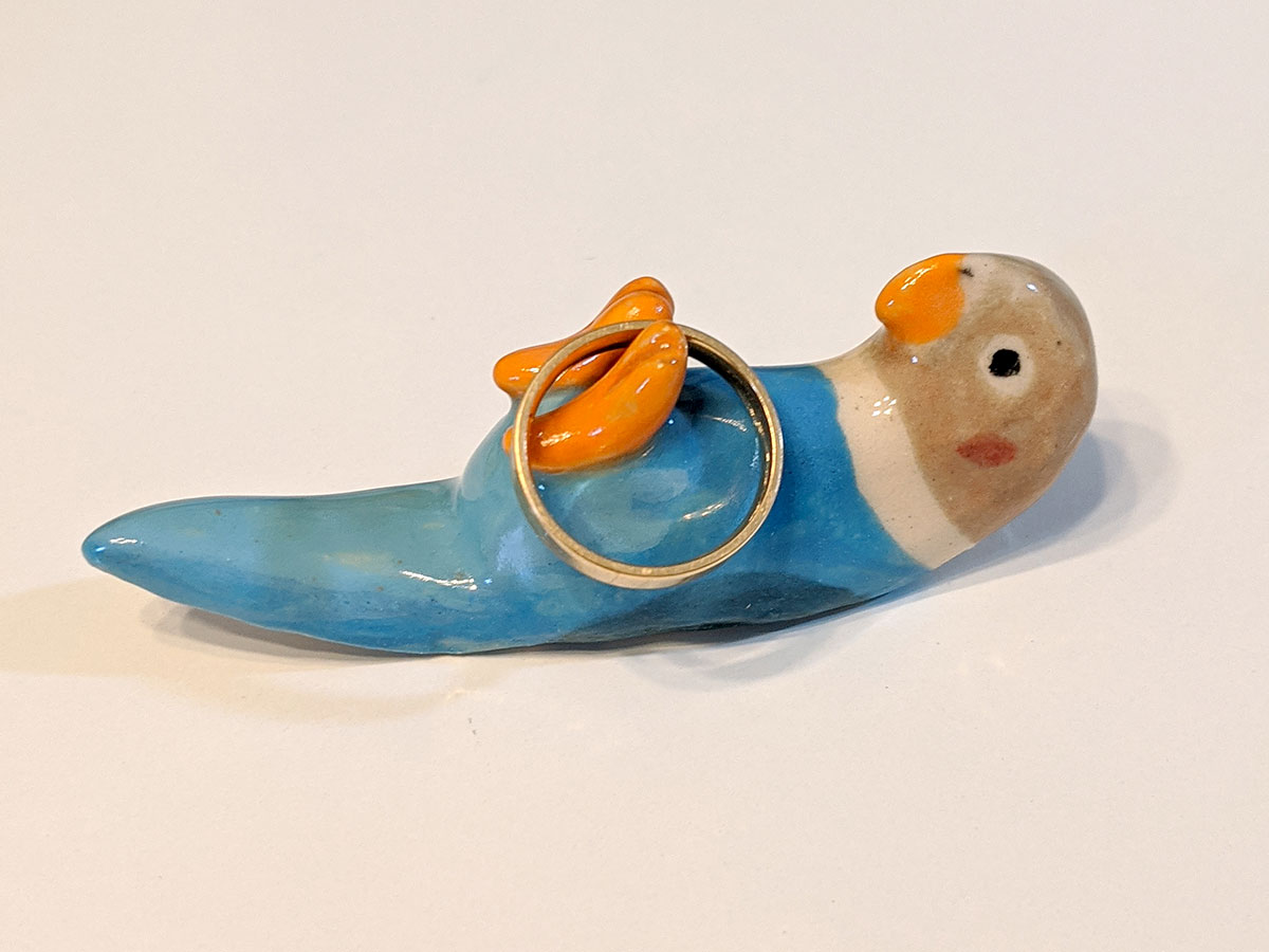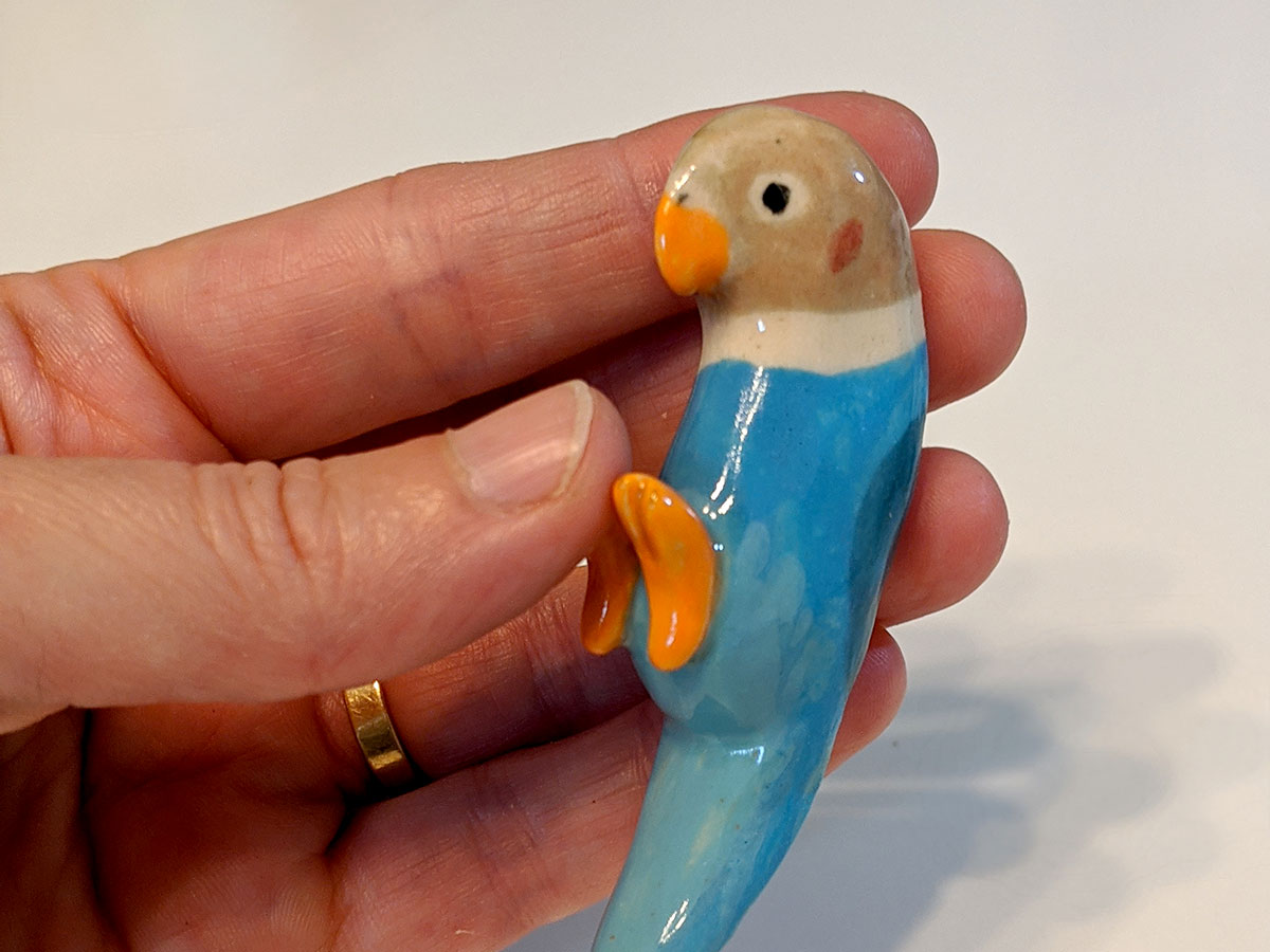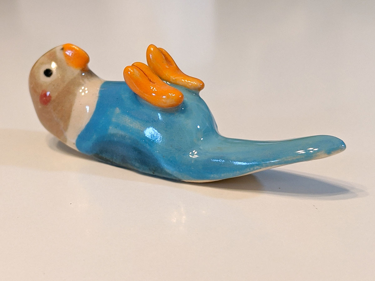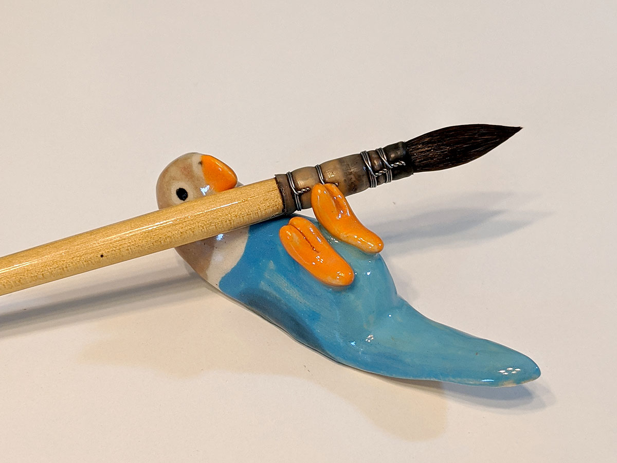 Small bird brush holder made out of clay and glazes. It will not stain, you can use any brush, chopsticks, knifes with it. About 5 cm long, handcrafted in Montréal.