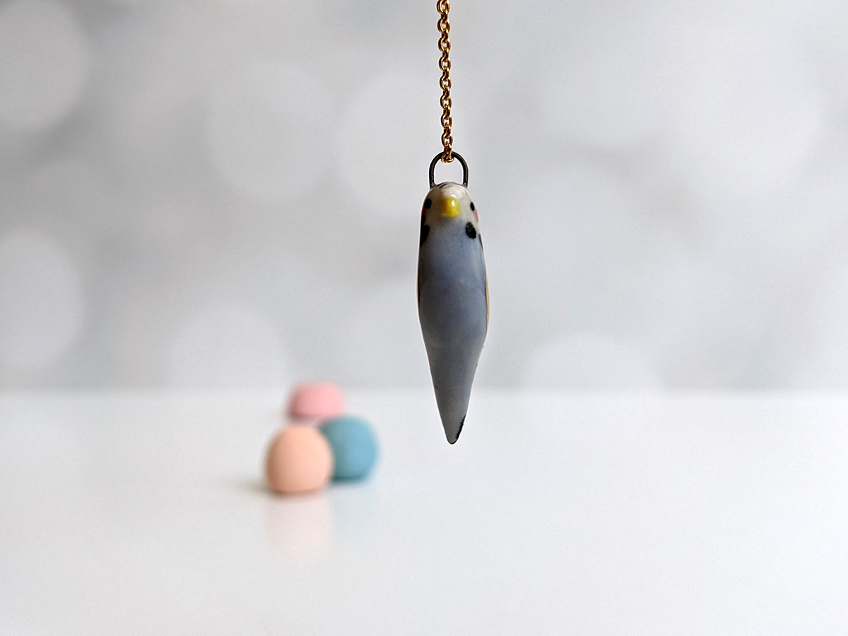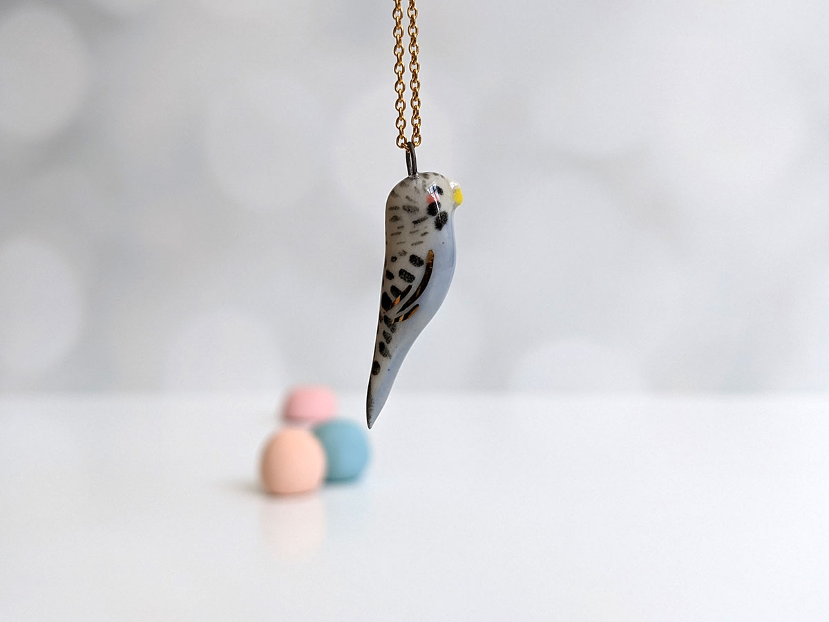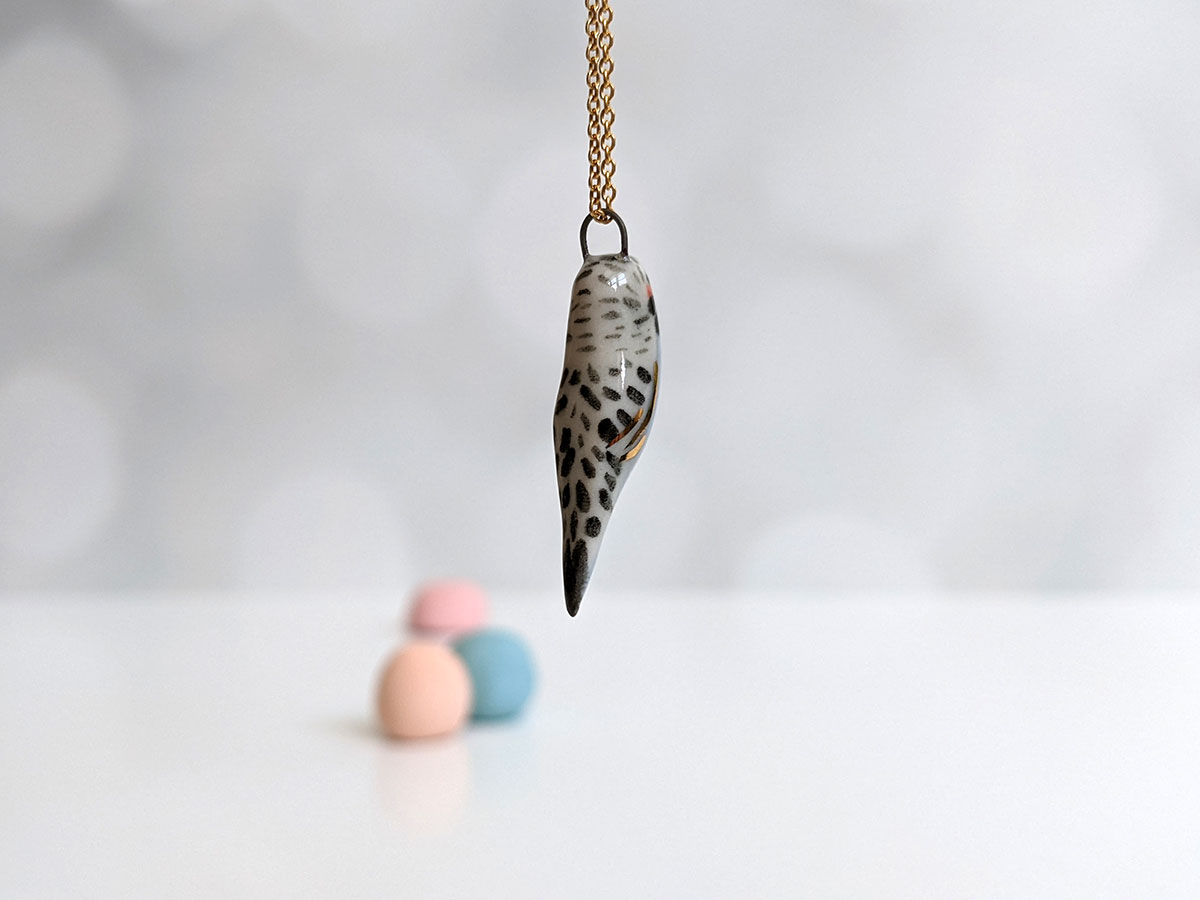 Small ceramics budgie pendant in white and bleue with red little cheeks, gold highlights. This small parakeet is sculpted and painted in Montréal, this is a one of a kind piece. Each pendant is different and what you see is what you get.