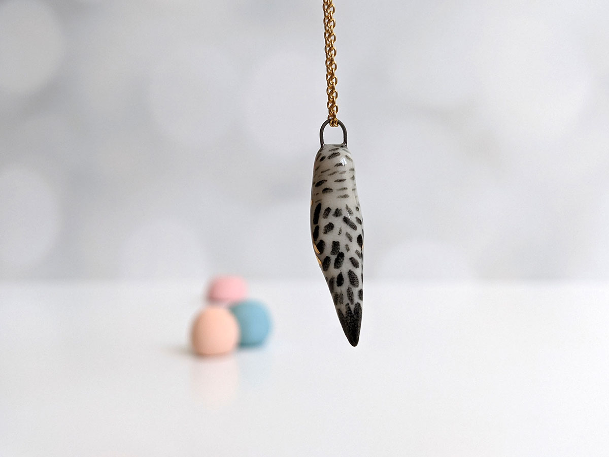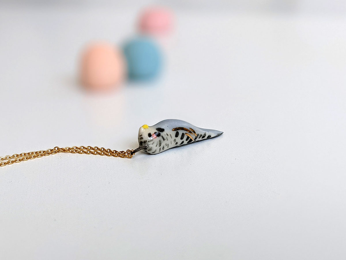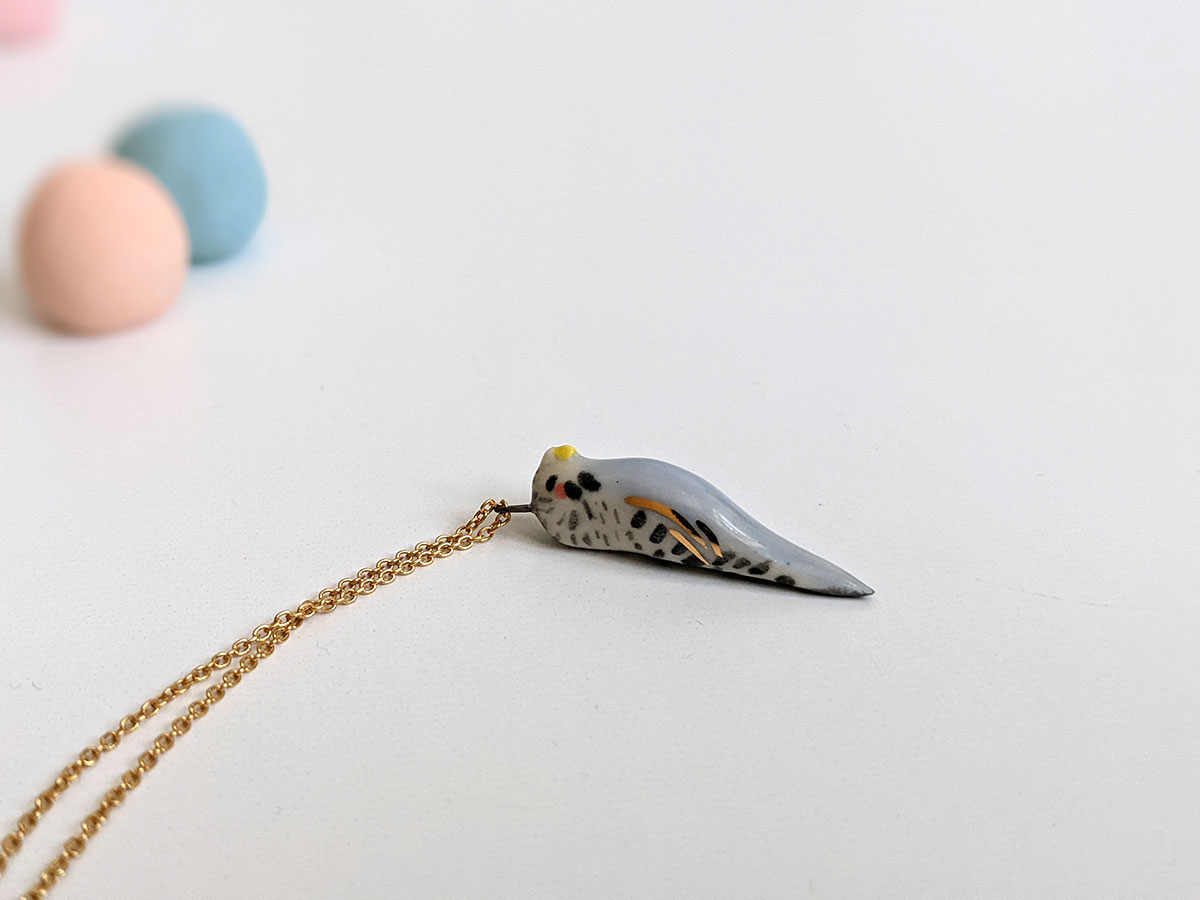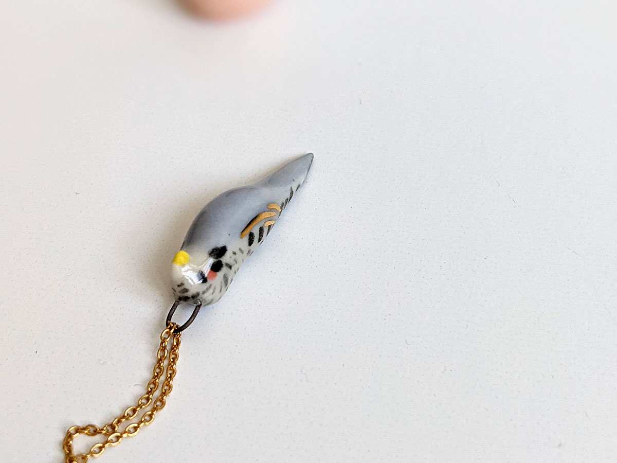 Small ceramics budgie pendant in white and bleue with red little cheeks, gold highlights. This small parakeet is sculpted and painted in Montréal, this is a one of a kind piece. Each pendant is different and what you see is what you get.