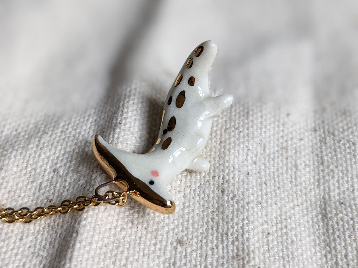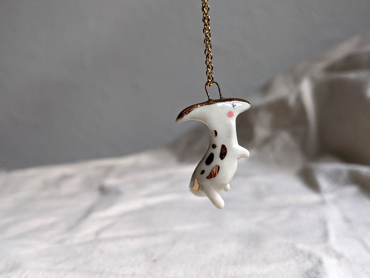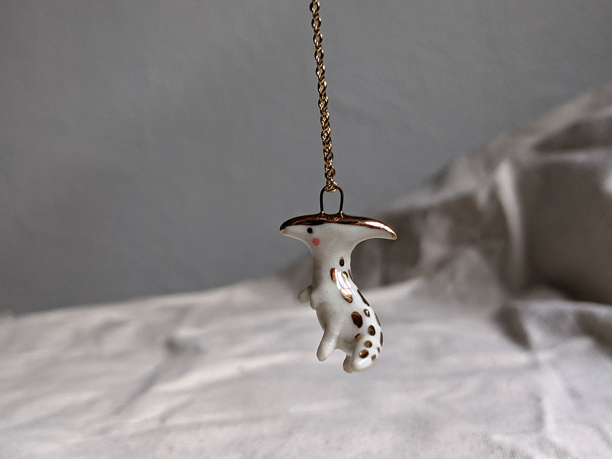 Small ceramics cute parasaurolophus pendant with gold highlights. Sculpted and painted in Montréal, this is a one of a kind piece. Each pendant is different and what you see is what you get 🙂