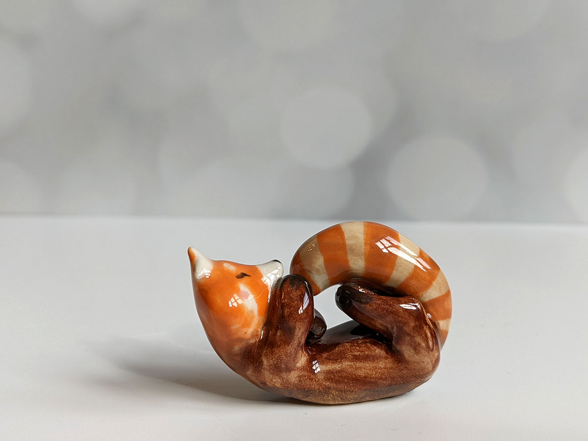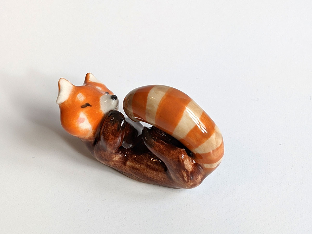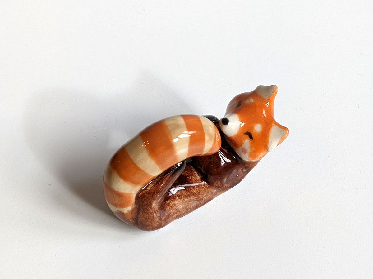 Small red panda figurine. One of a kind piece of ceramics, handcrafted in Montréal. This little guy comes in an illustrated box.