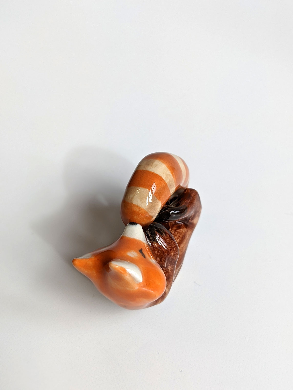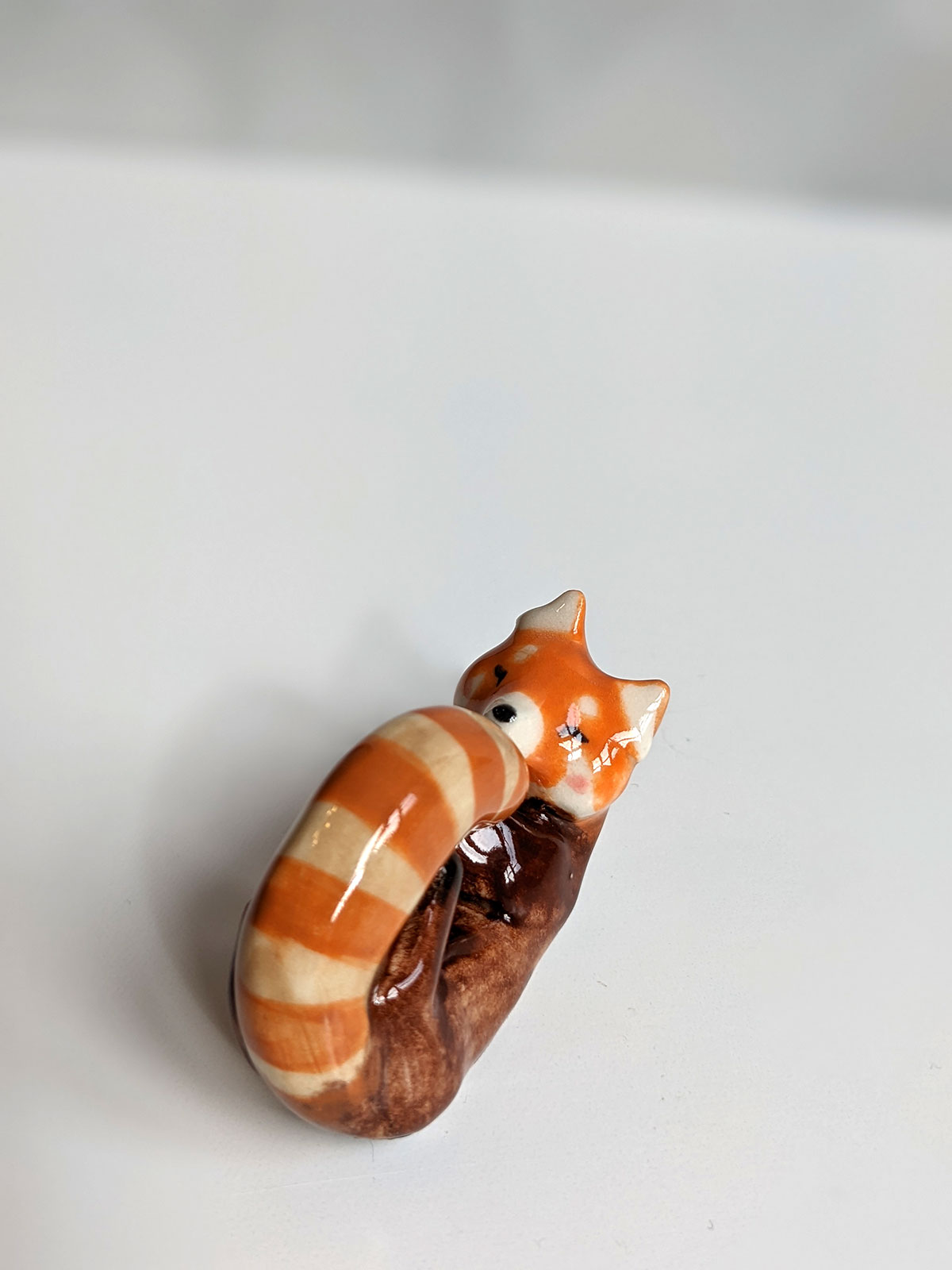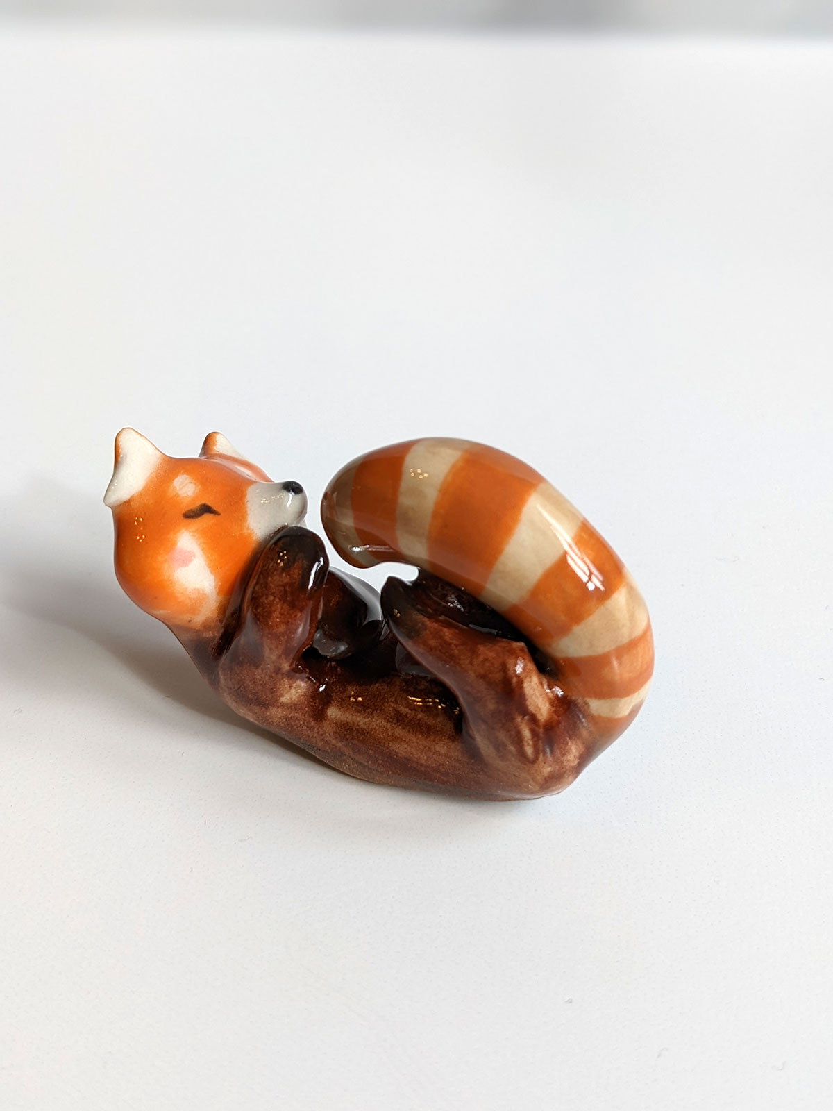 Small red panda figurine. One of a kind piece of ceramics, handcrafted in Montréal. This little guy comes in an illustrated box.