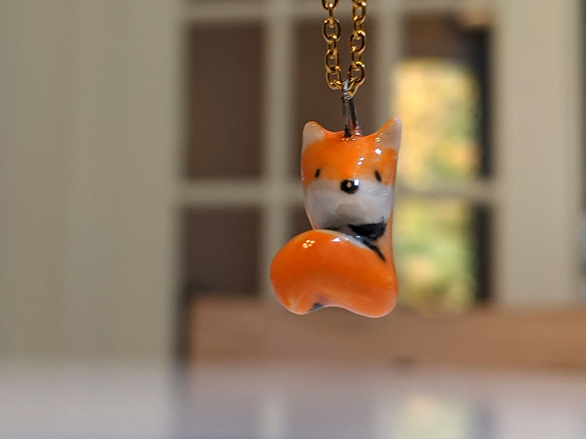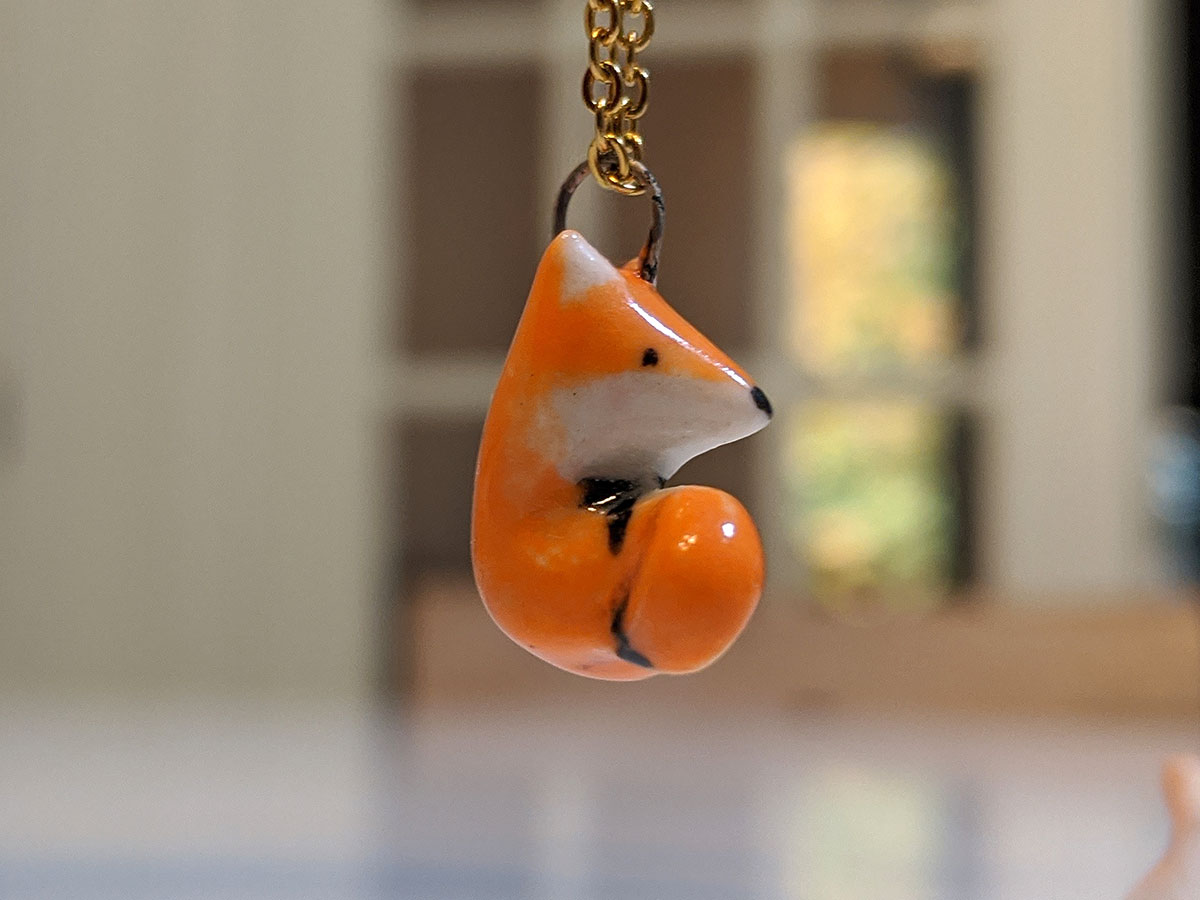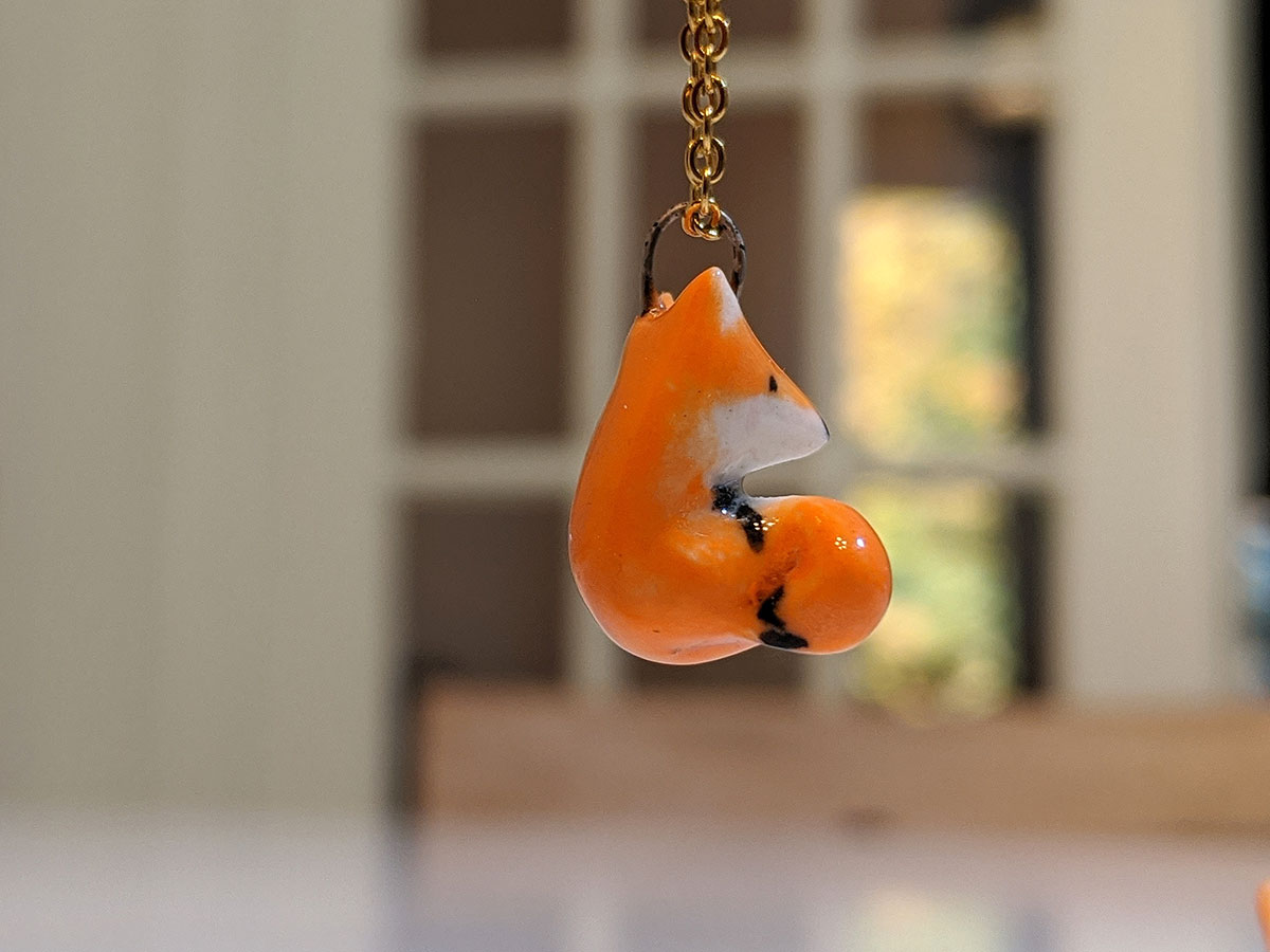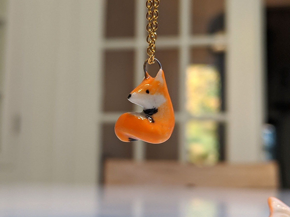 Small ceramics fox pendant, wrapped in their bushy tail. Sculpted and painted in Montréal, this is a one of a kind piece. Each pendant is different and what you see is what you get 🙂