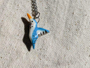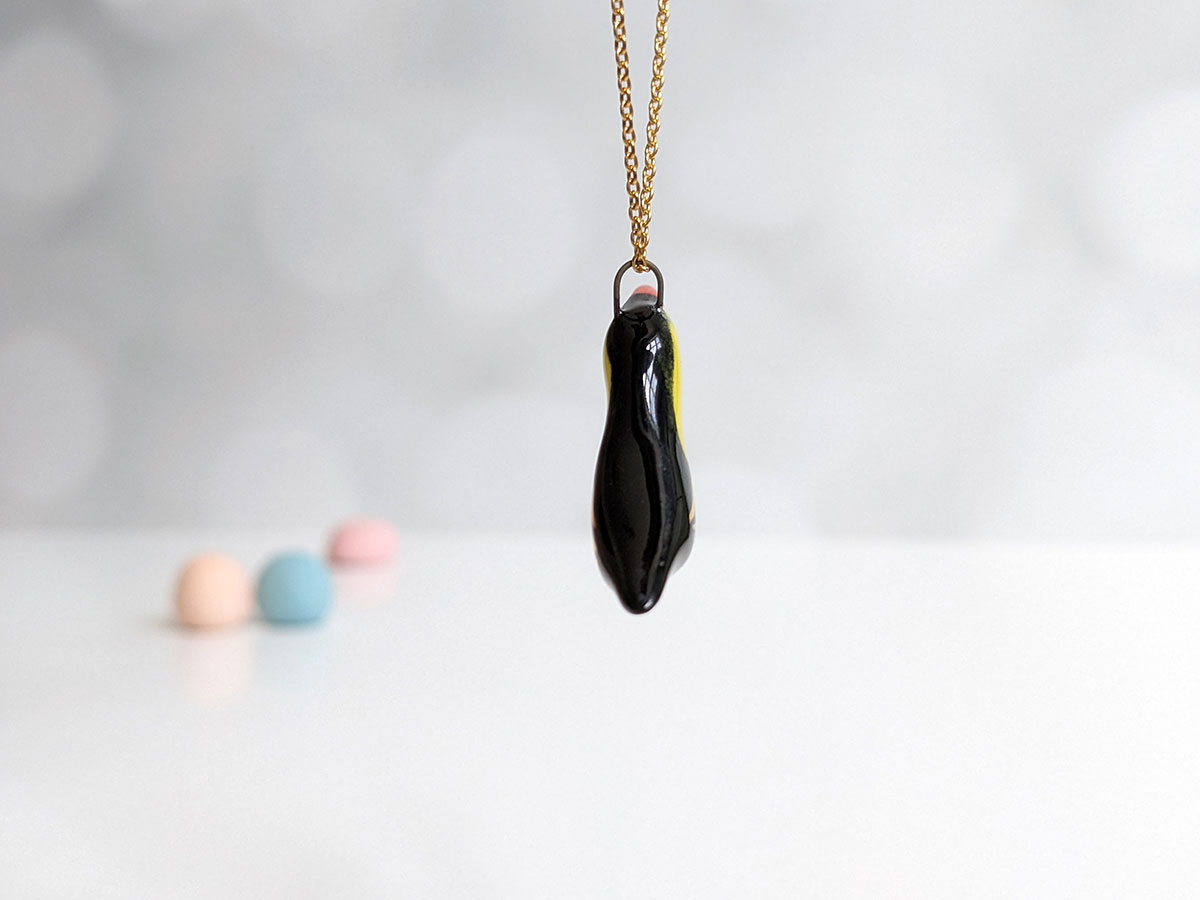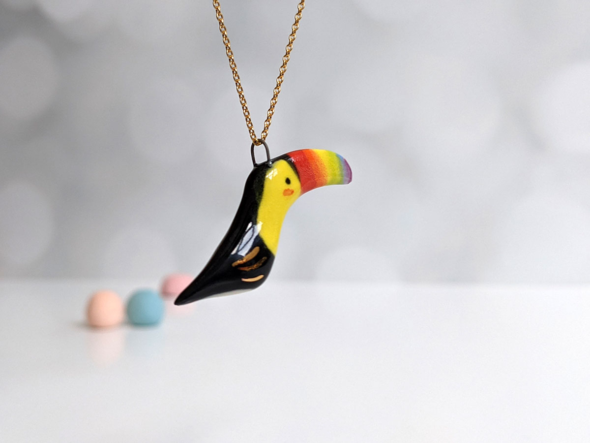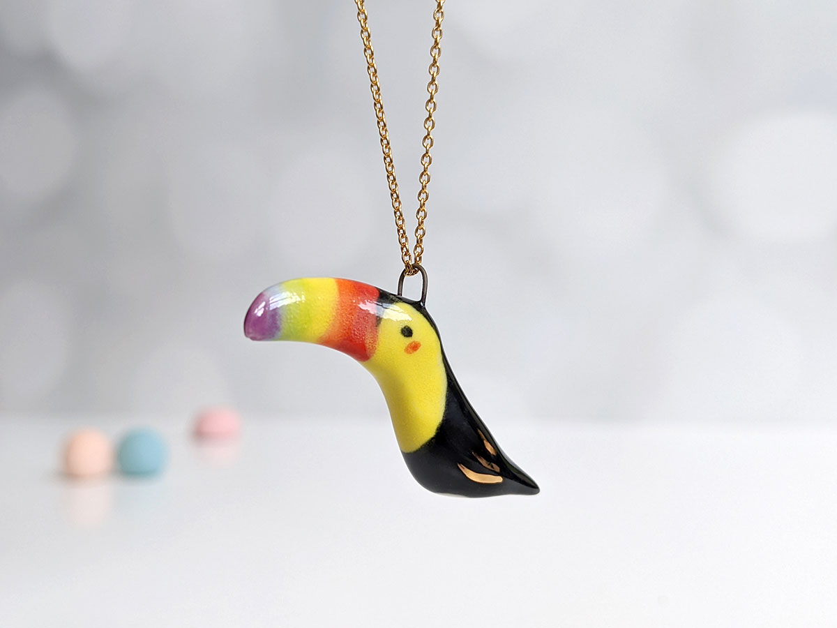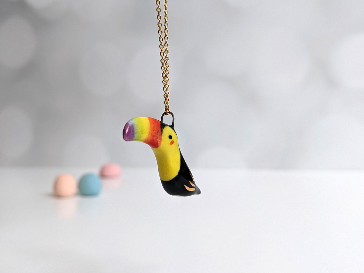 Small ceramics tucan pendant. Sculpted and painted in Montréal, this is a one of a kind piece. Each pendant is different and what you see is what you get 🙂