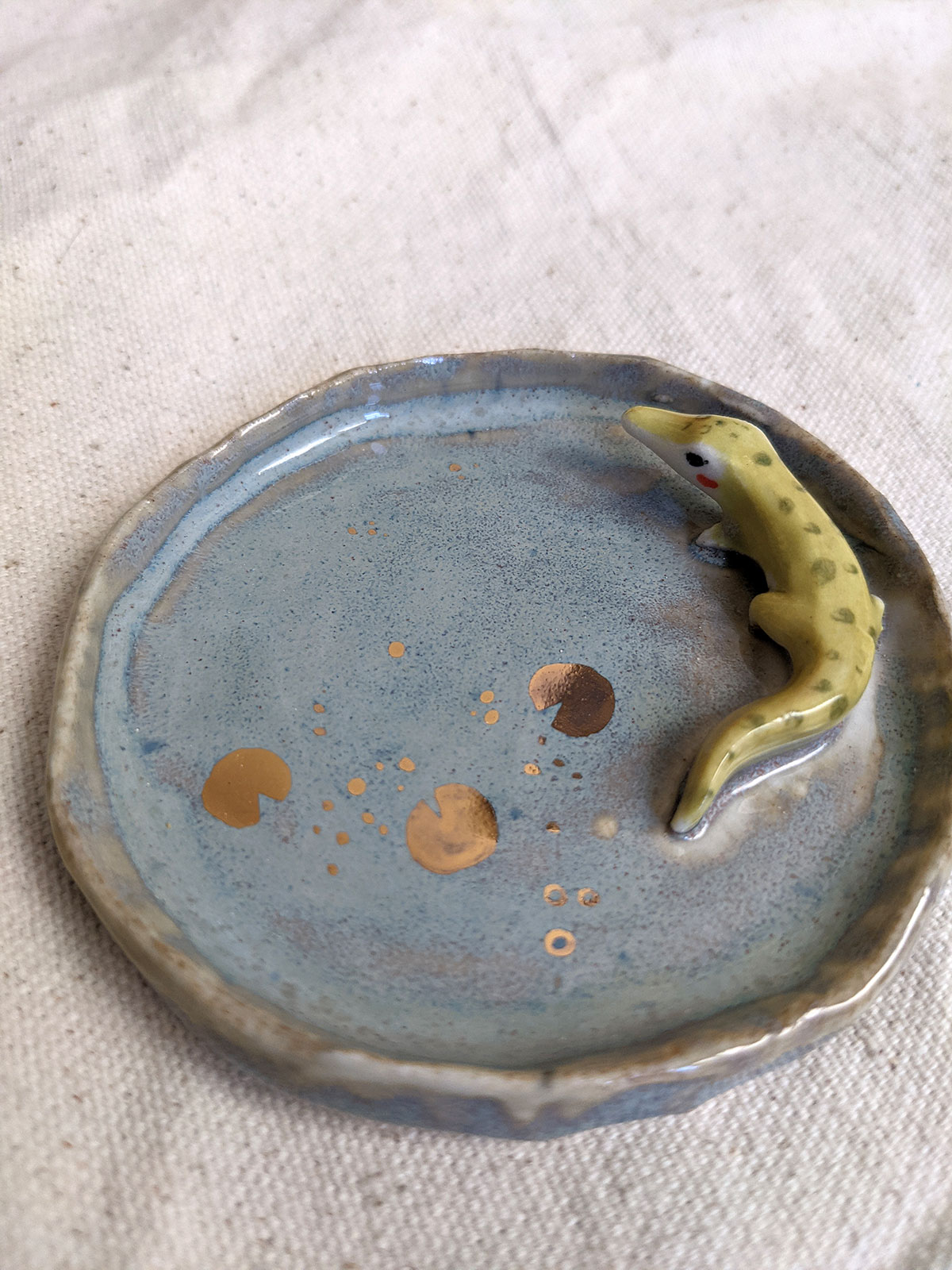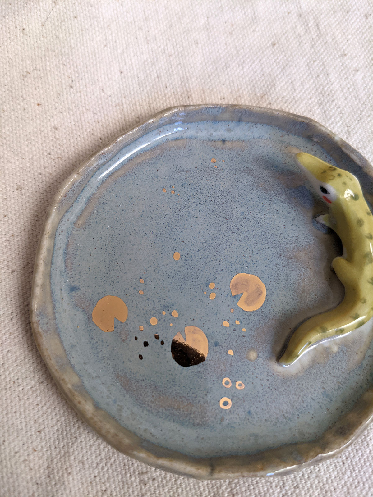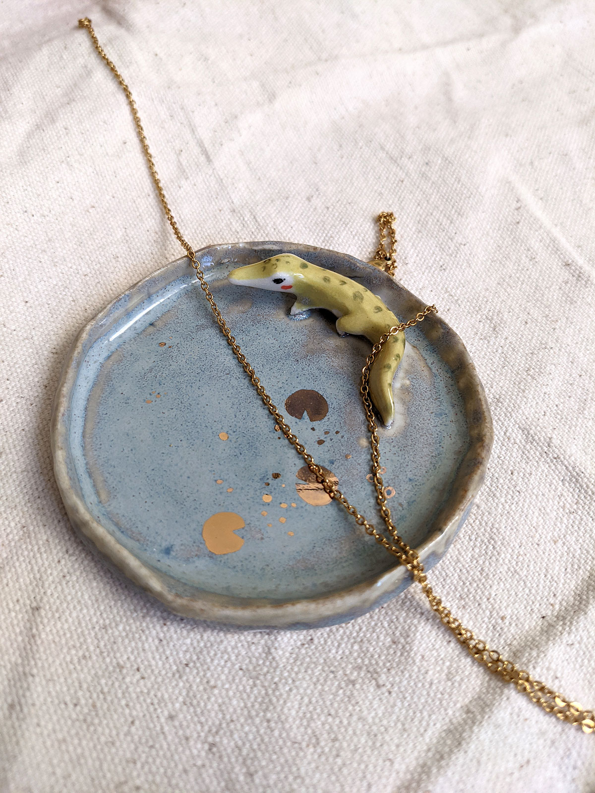 Petite coupelle d’environ 6-7 cm de large, ornée de nénuphars d’or et d’un petit crocodile. Cette coupelle de porcelaine est sculptée à la main et entièrement fabriquée à Montréal. Pièce unique, fait main au Québec garanti !