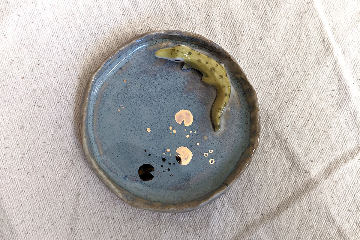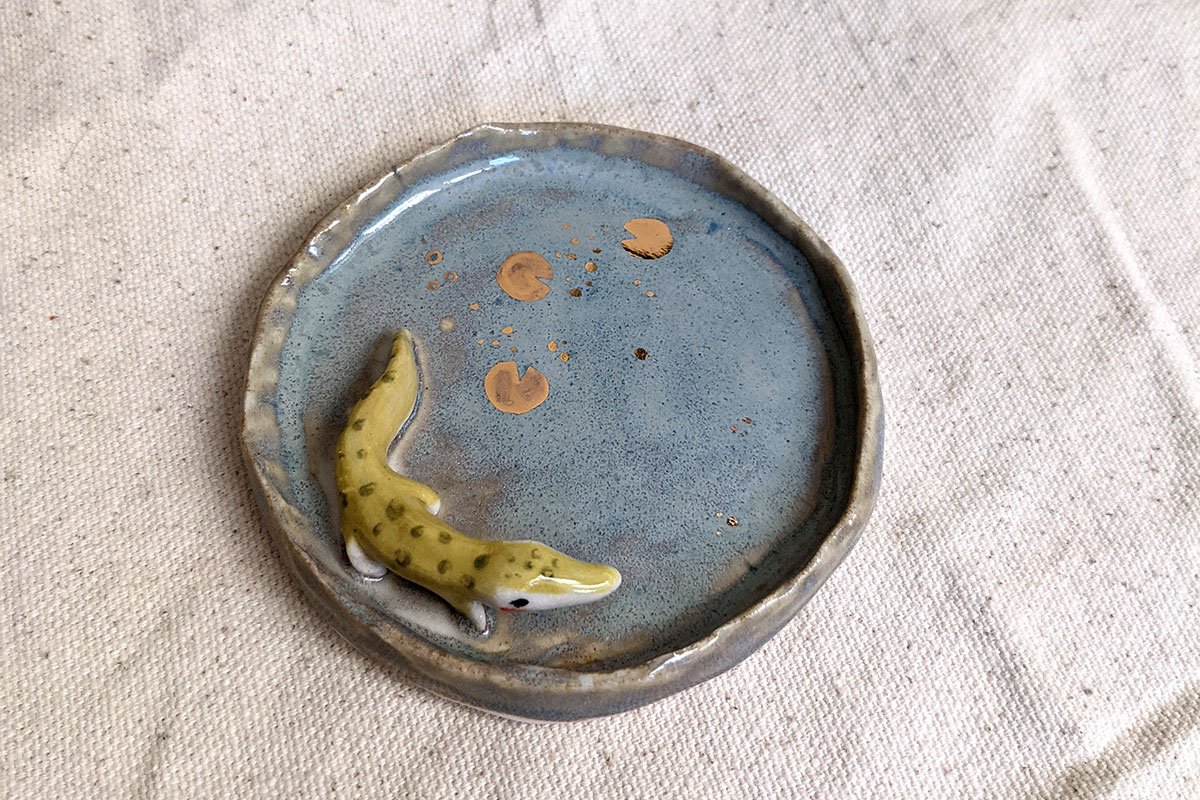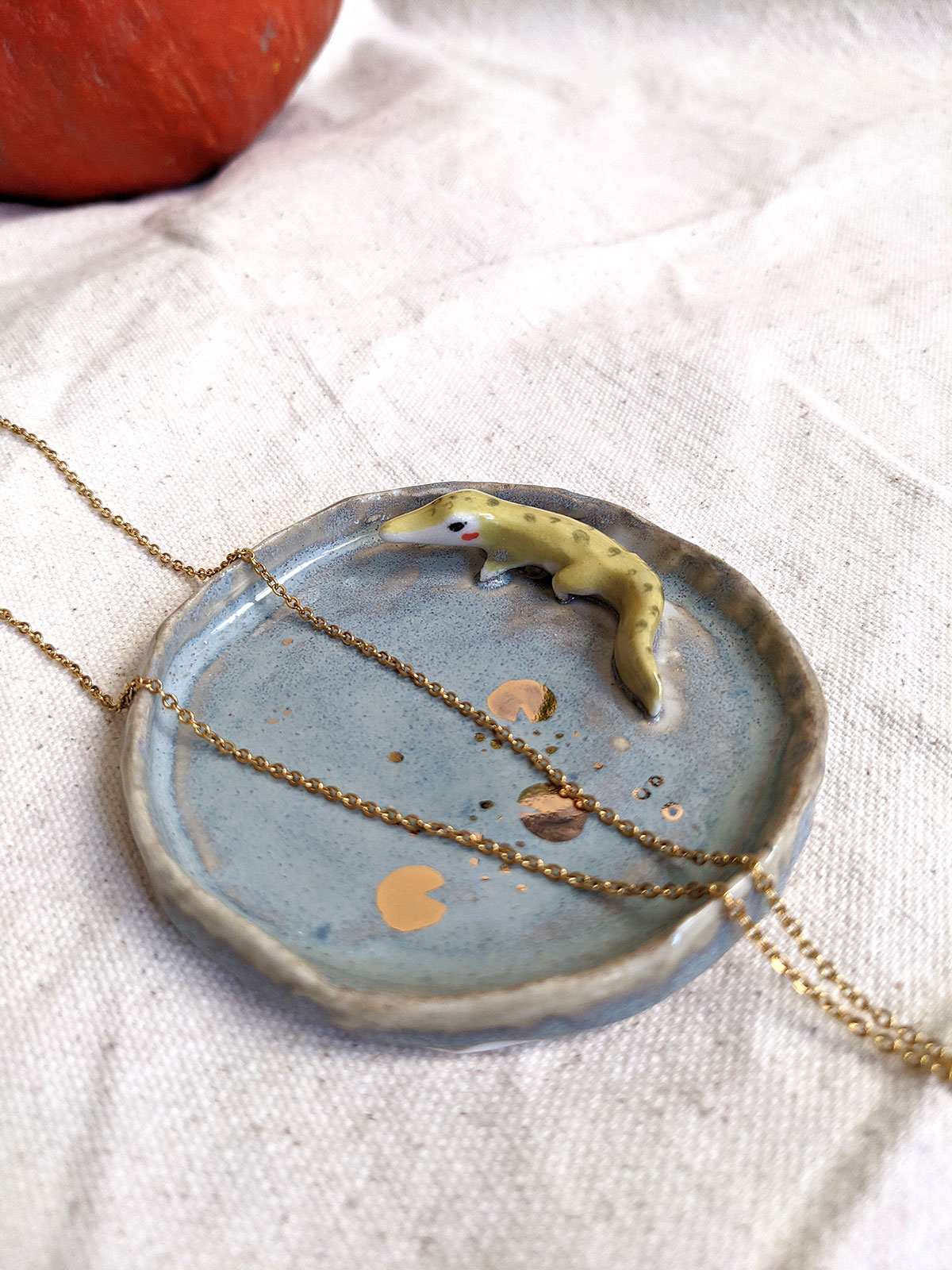 Petite coupelle d’environ 6-7 cm de large, ornée de nénuphars d’or et d’un petit crocodile. Cette coupelle de porcelaine est sculptée à la main et entièrement fabriquée à Montréal. Pièce unique, fait main au Québec garanti !