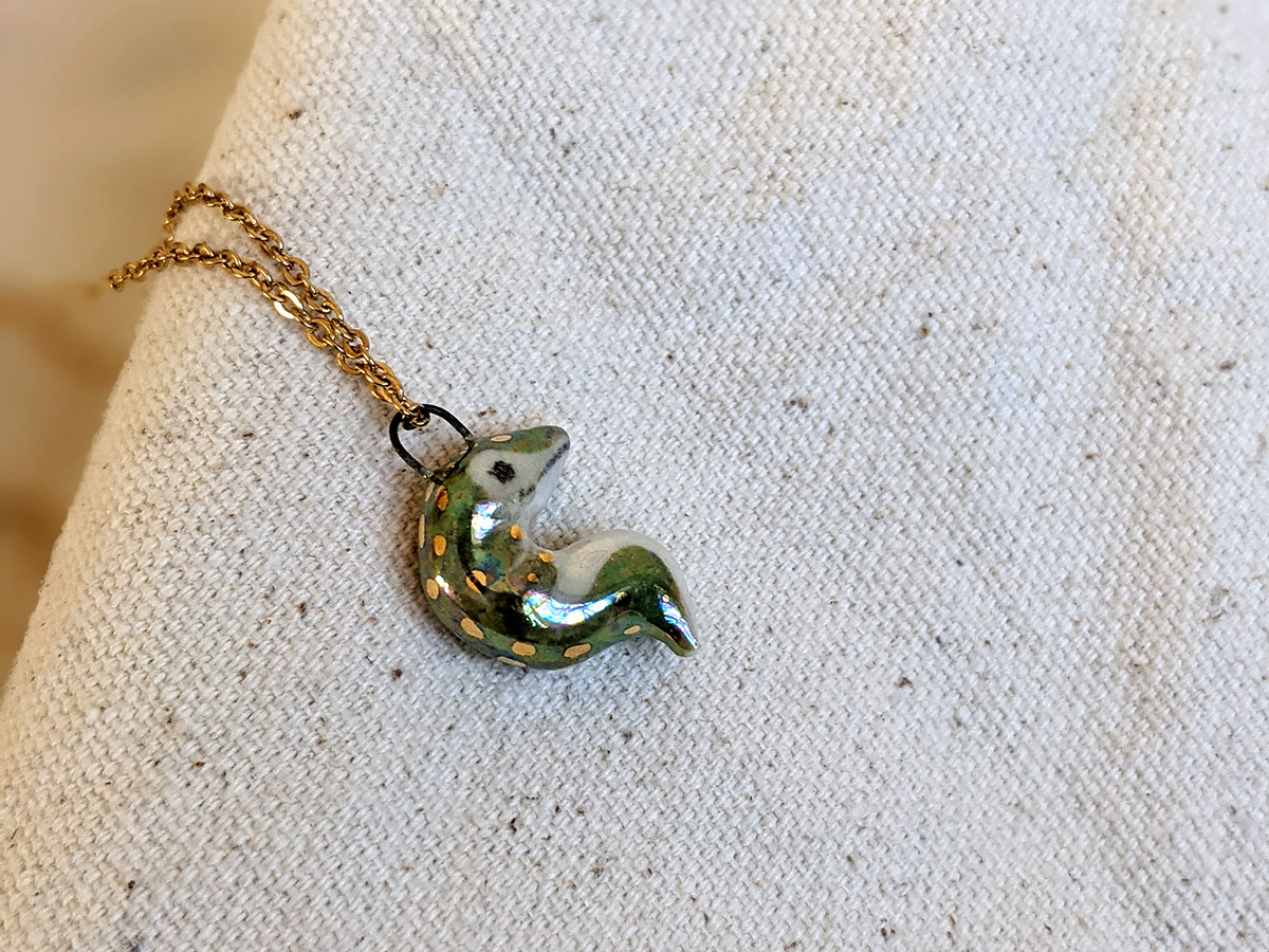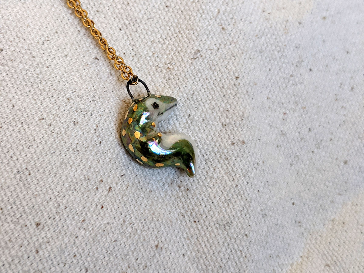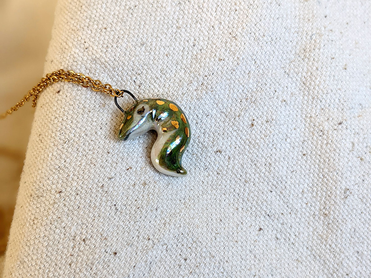 Tiny crocodile pendant with a nice green shine with pearl and gold. One of a kind, this little pendant comes in an illustrated box. Chain sold separately.