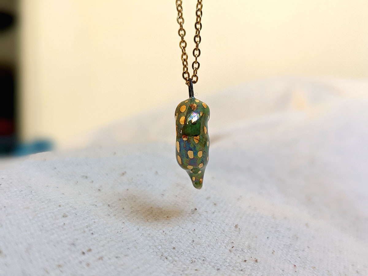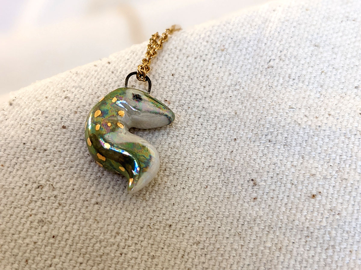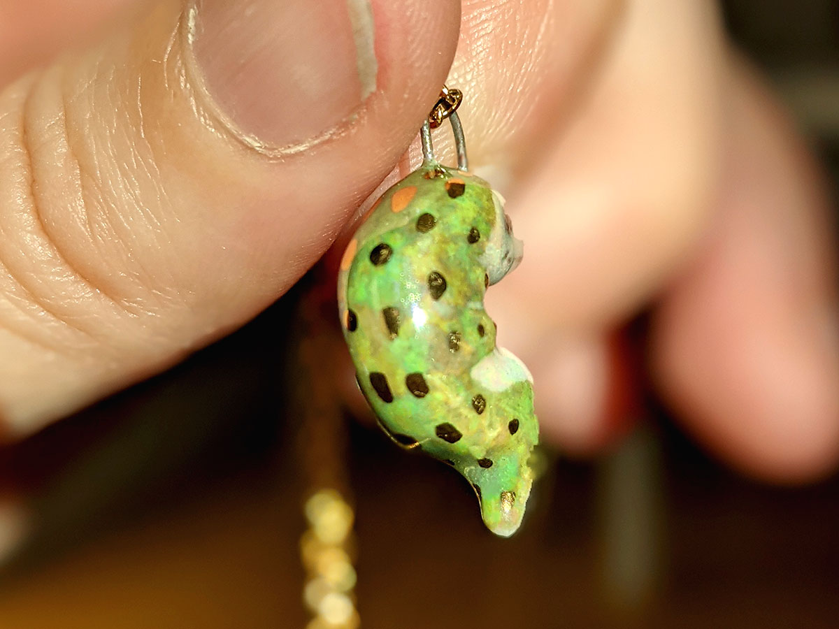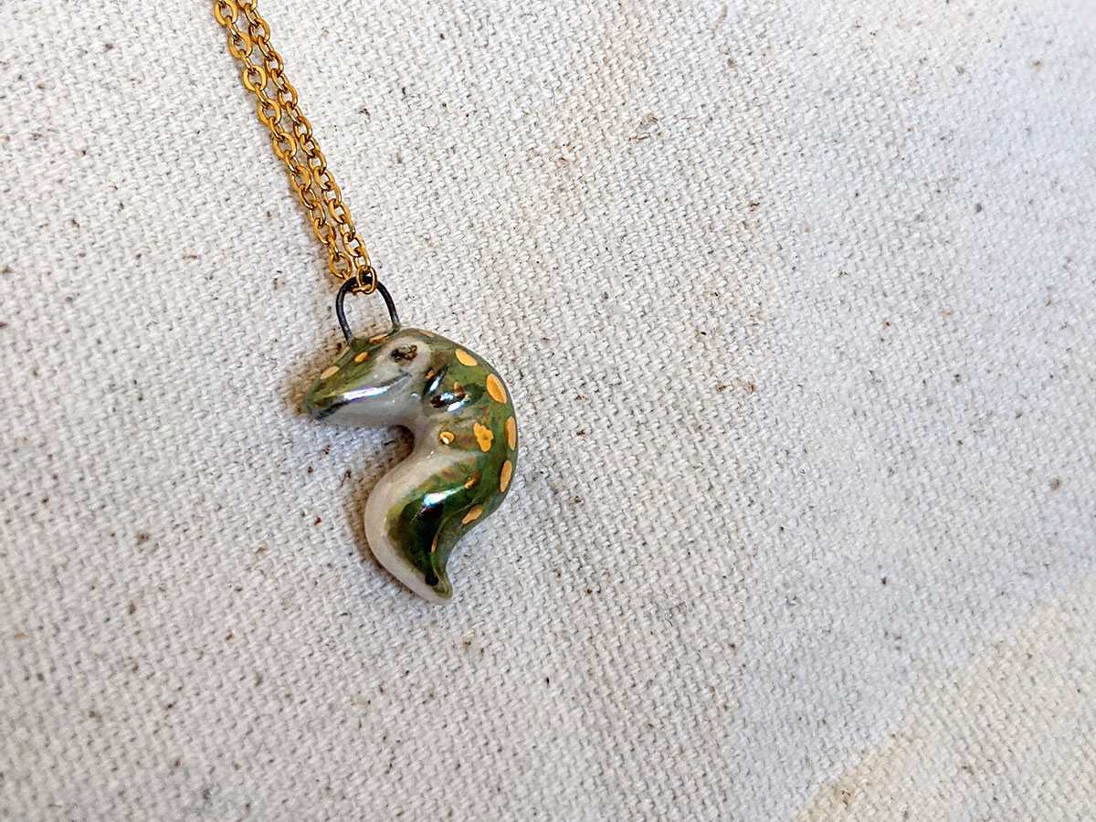 Tiny crocodile pendant with a nice green shine with pearl and gold. One of a kind, this little pendant comes in an illustrated box. Chain sold separately.
