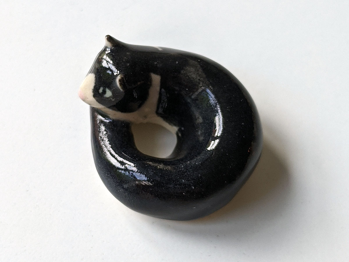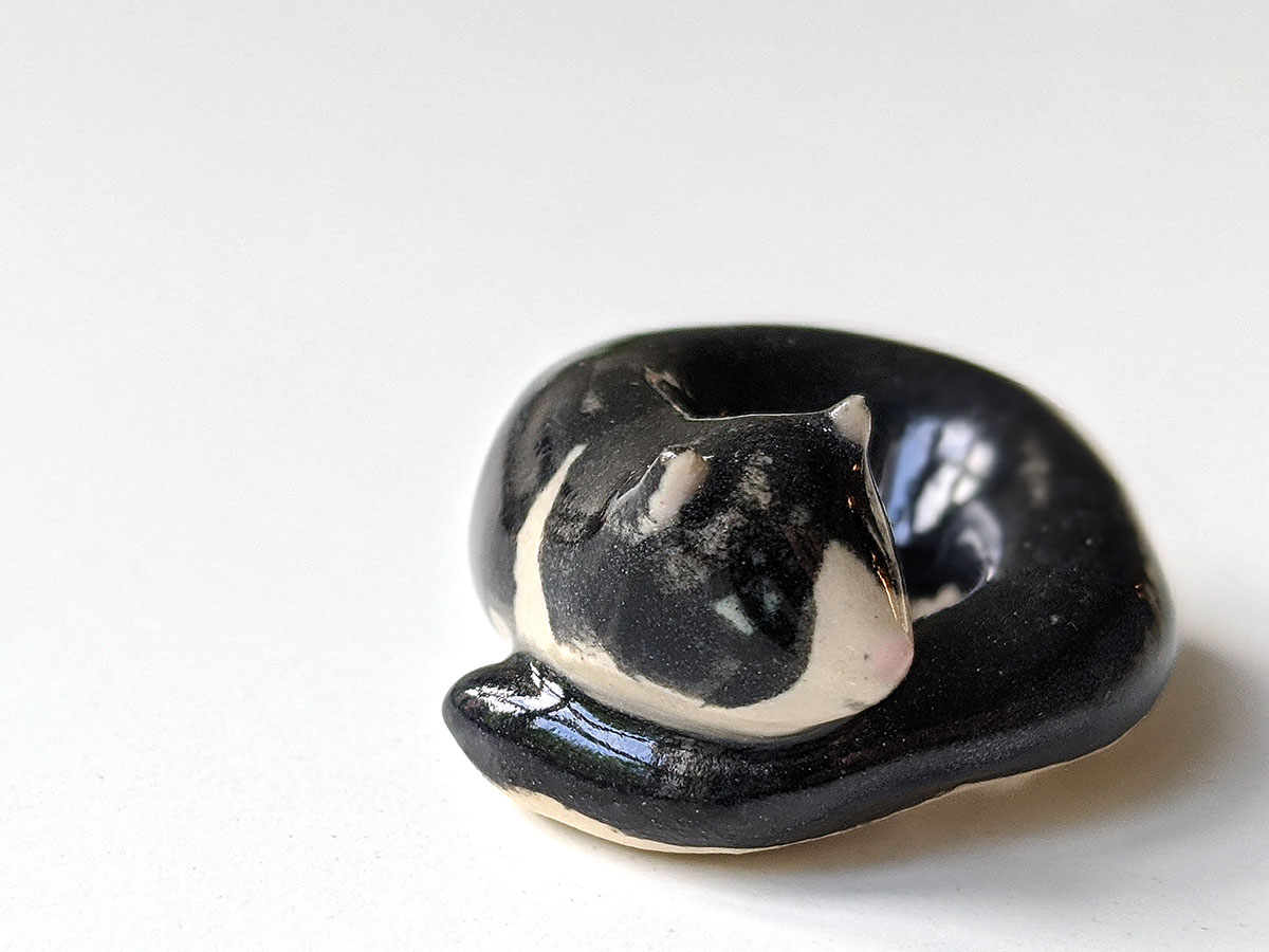 Curled tuxedo cat made of clay. Handcrafted in Montreal, this is a unique piece. About 5 cm wide.