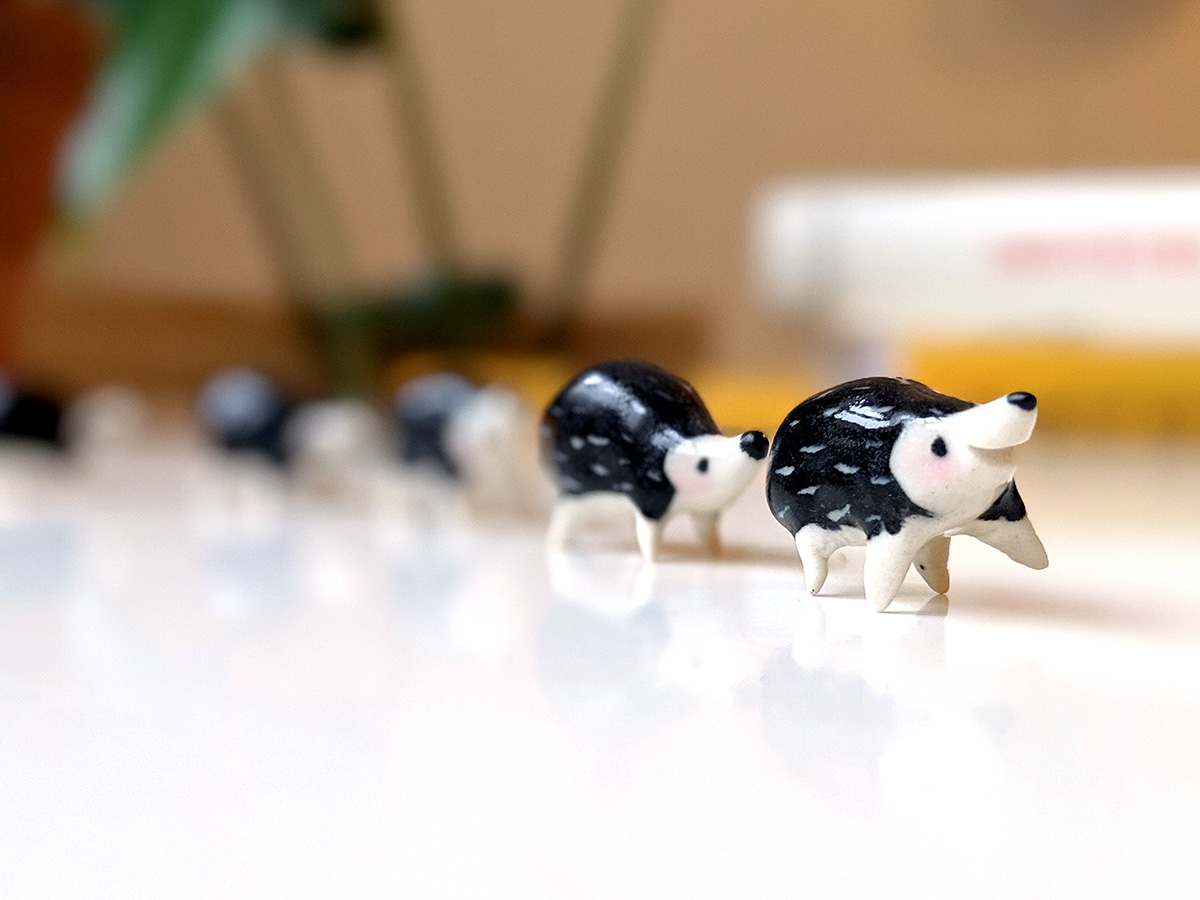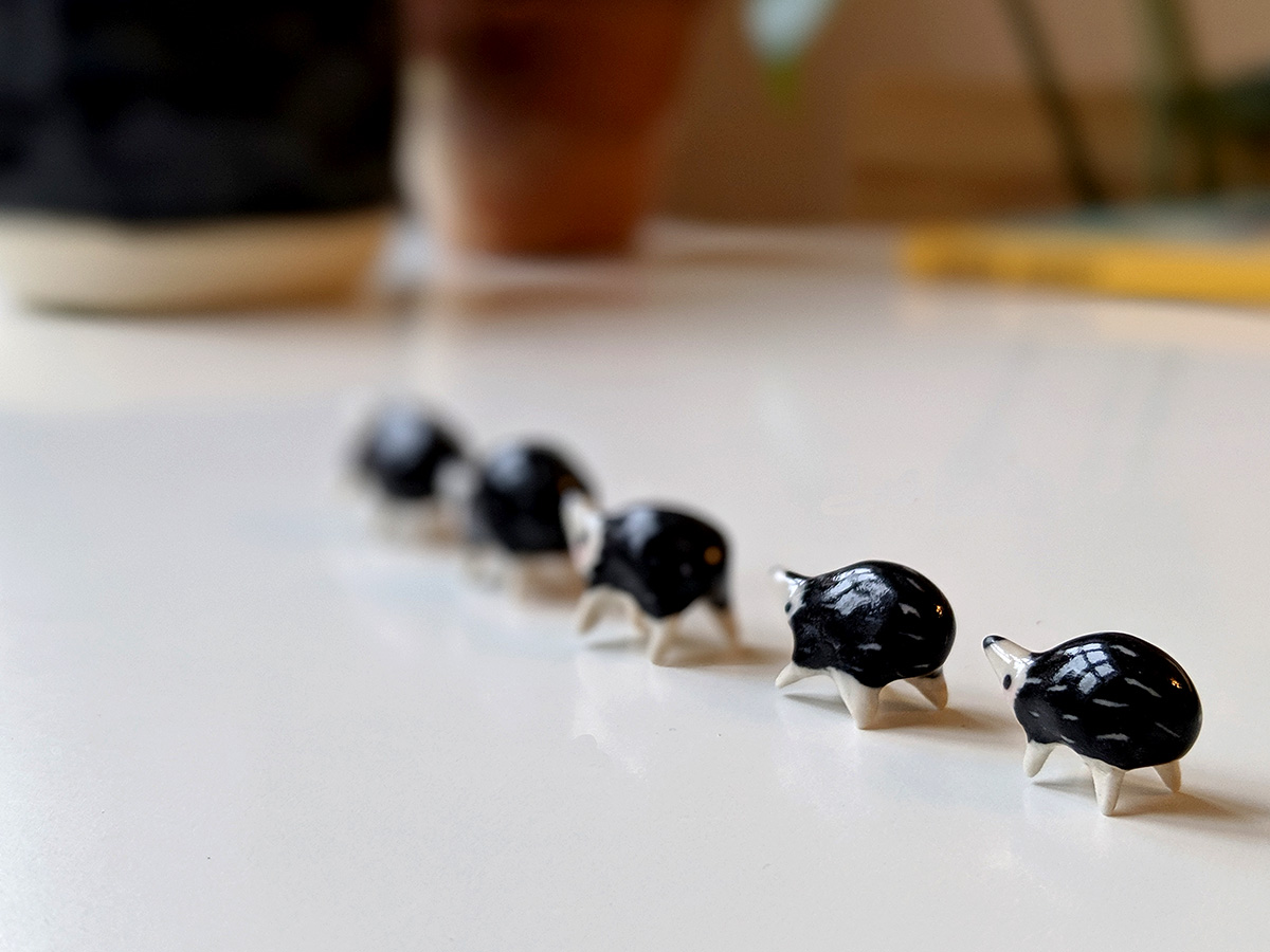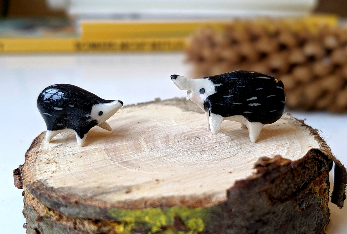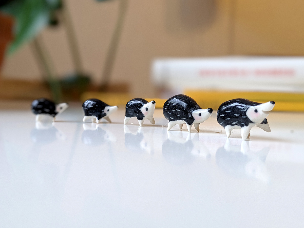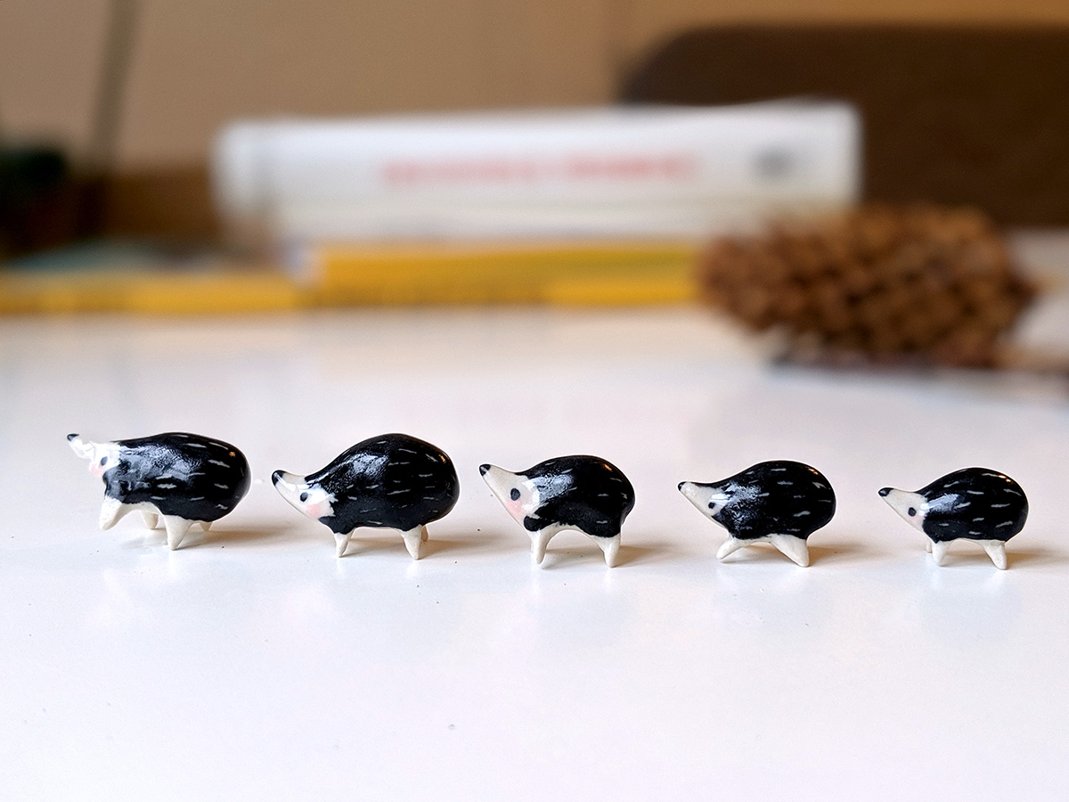 Petite famille de 5 hérissons en céramique dont un qui est vraiment très content. Chacun fait 1,5 cm de long environ. Les 5 hérissons sont vendus ensemble.