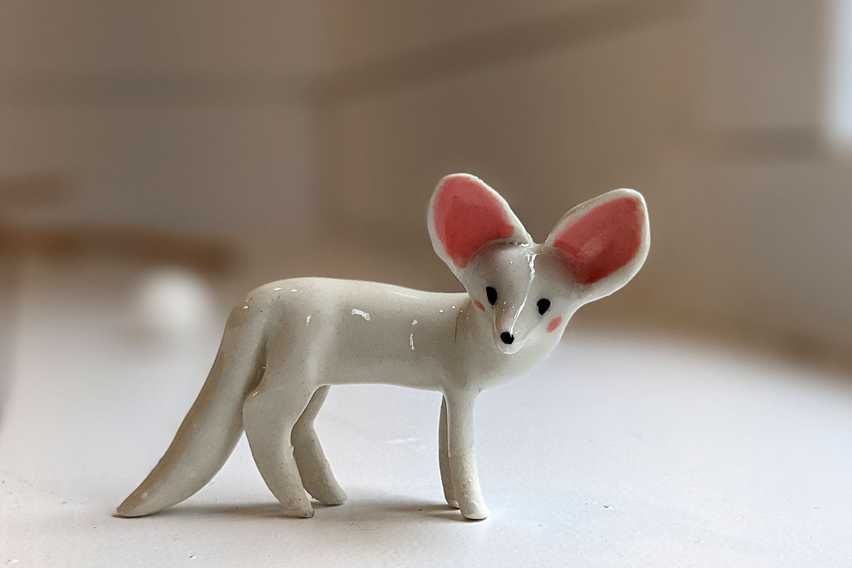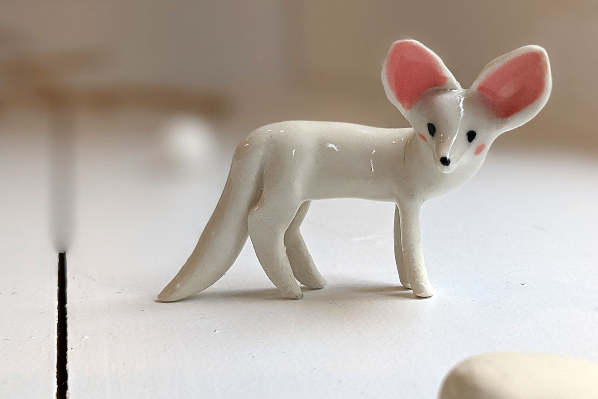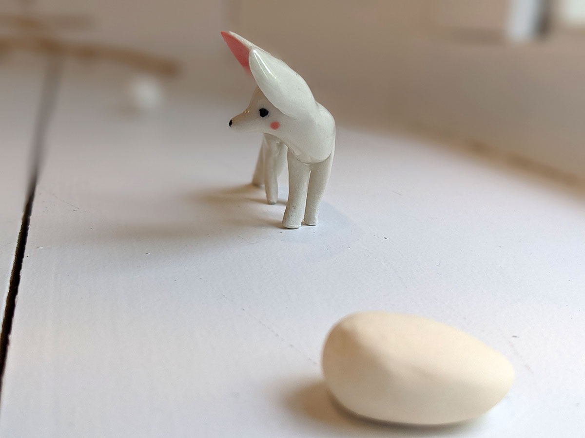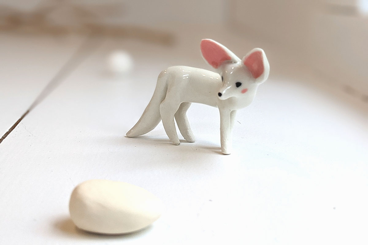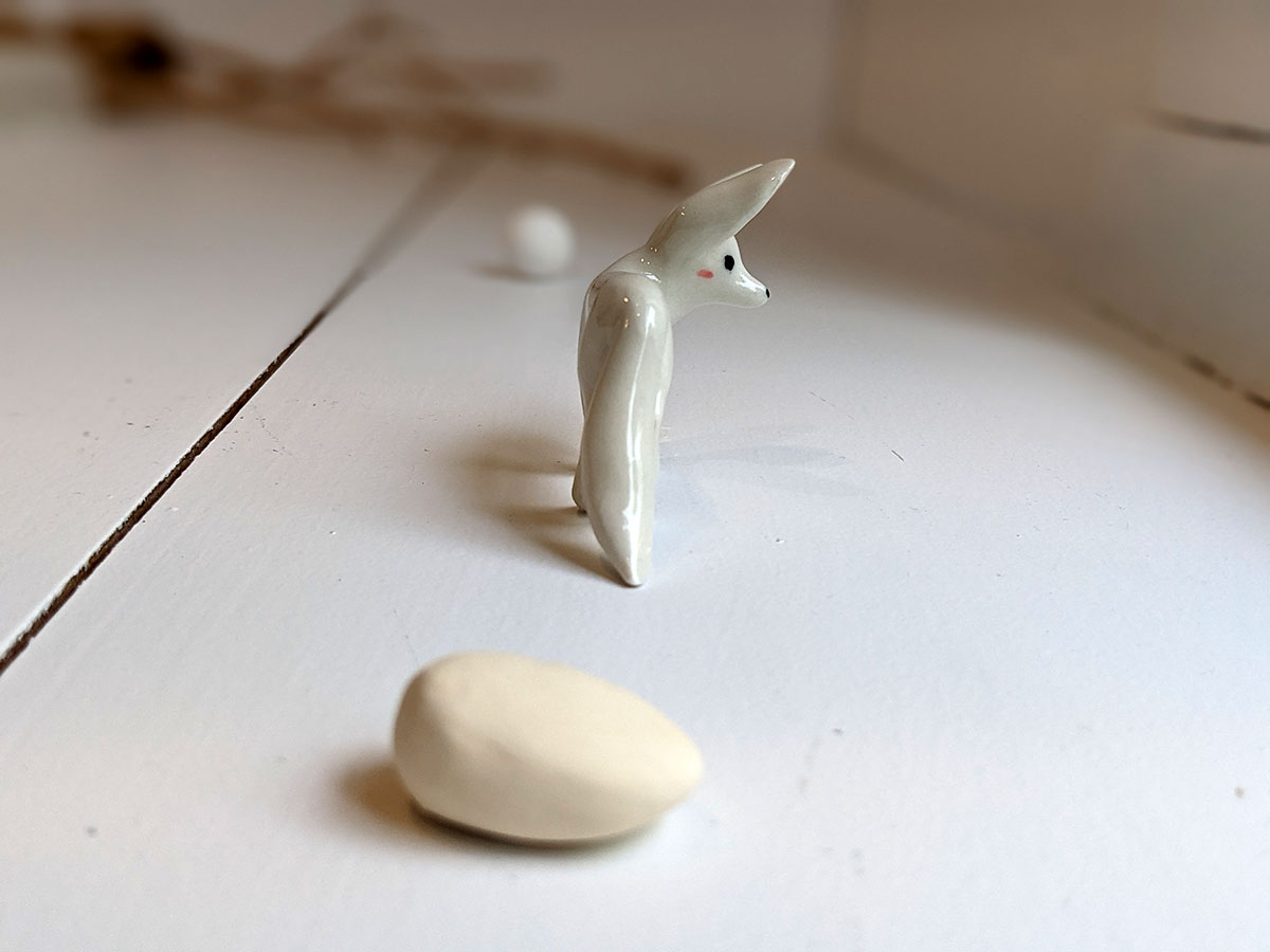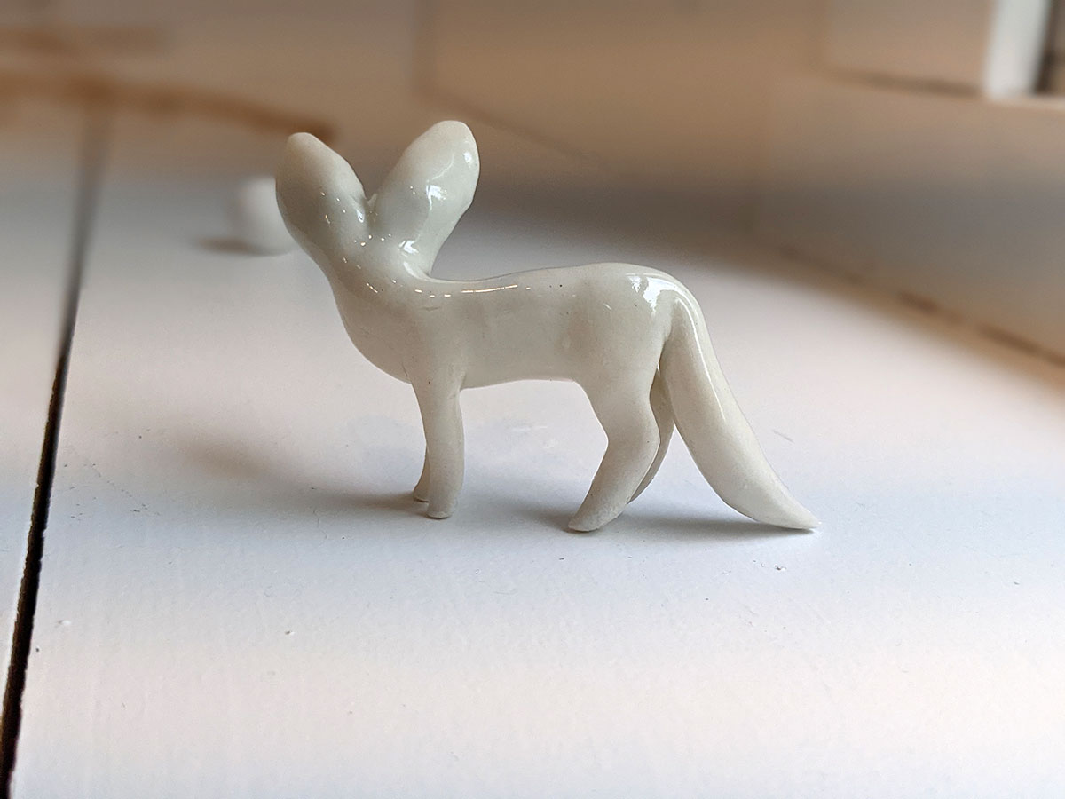 Tiny White Fennec Fox porcelain figurine, standing, about 6-7 cm high. One of a kind. This piece of porcelain art comes in a custom illustrated box. It is handmade in Montréal.