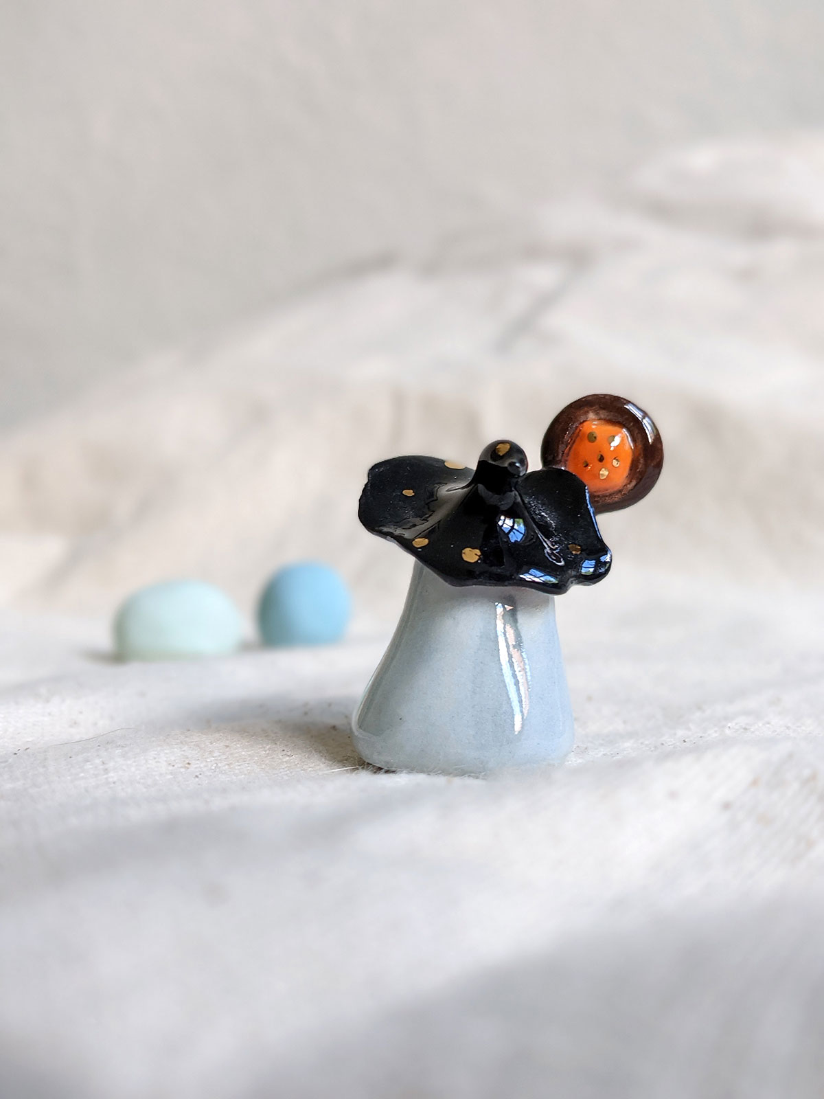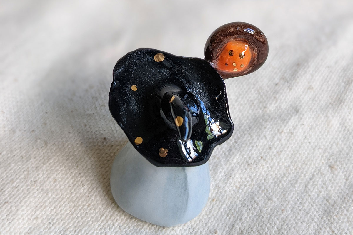 Petite figurine de petit nage hamster, faite de porcelaine, nacre et or. Le dessous du chapeau est nacré sur le dessous avec un motif d’étoiles d’or sur le dessus. Créée et réalisée à la main à Montréal. Environ 4-5 cm de haut.