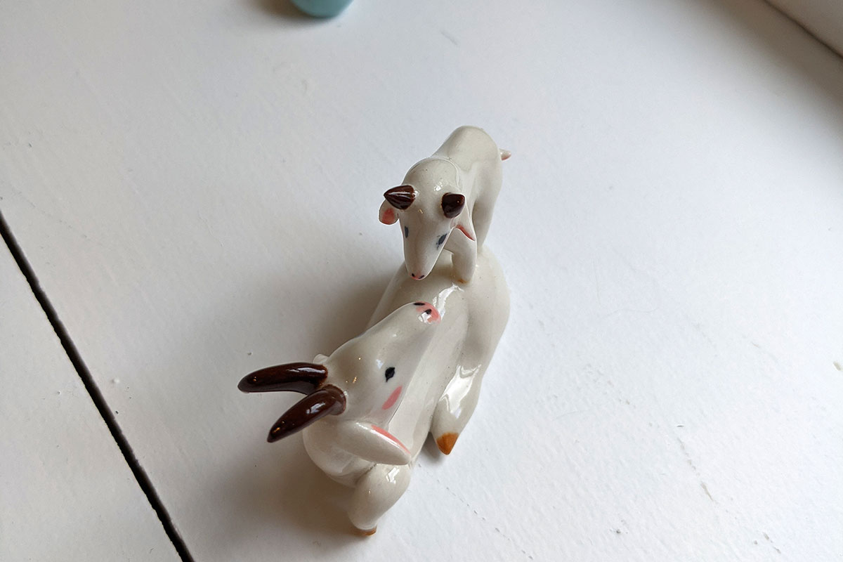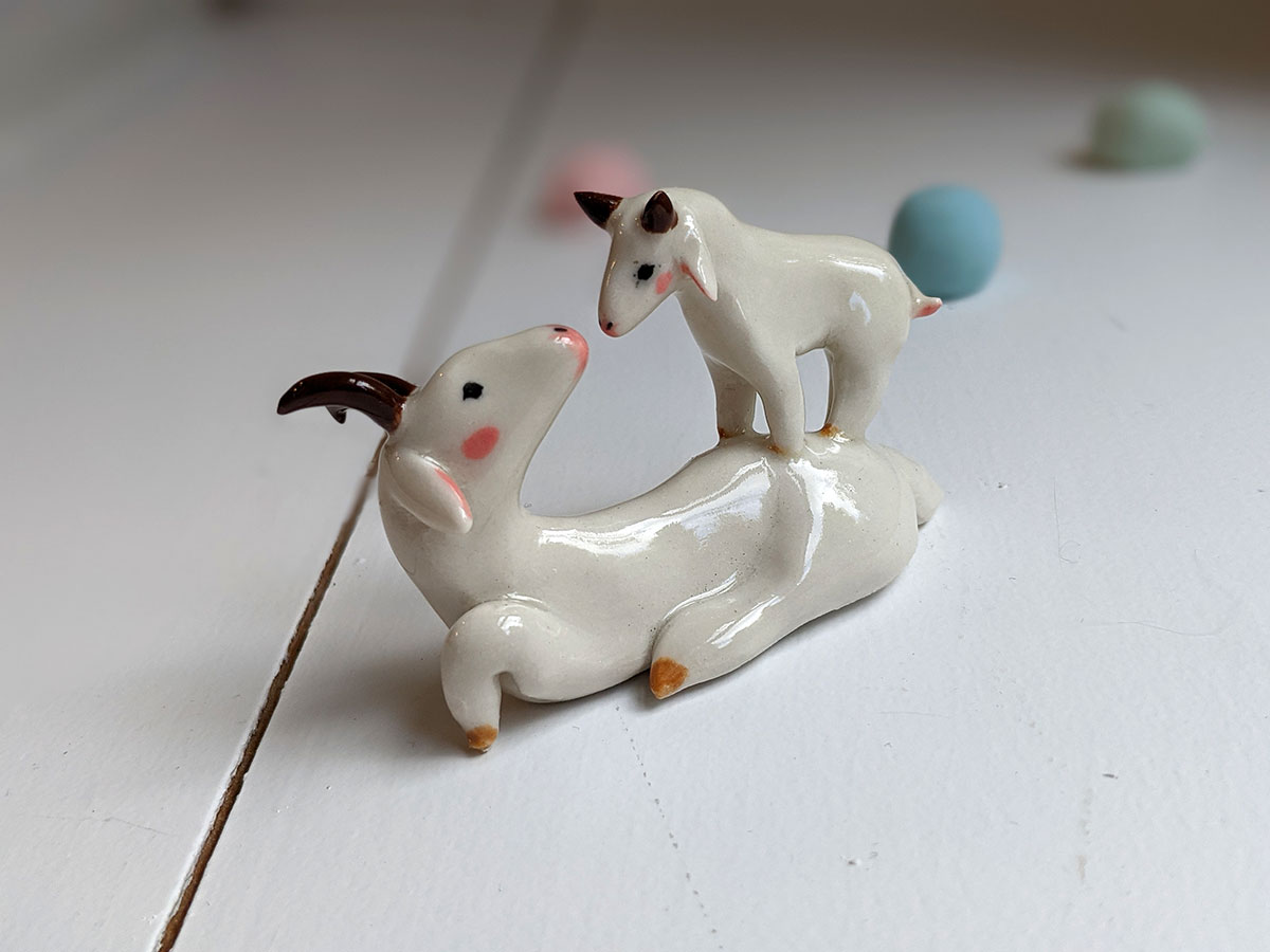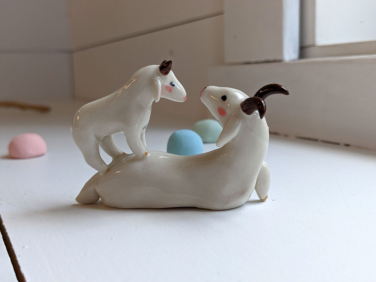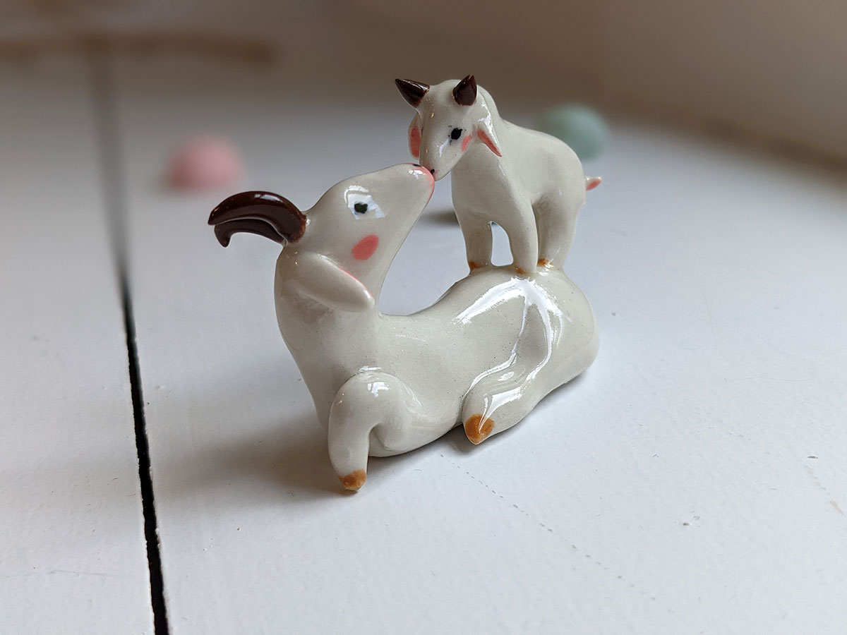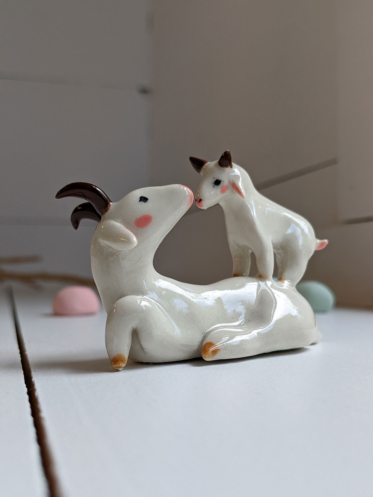 Goat mom and her little one, porcelain figurine made in Montréal. This one of a kind piece of décor is about 7 cm long.