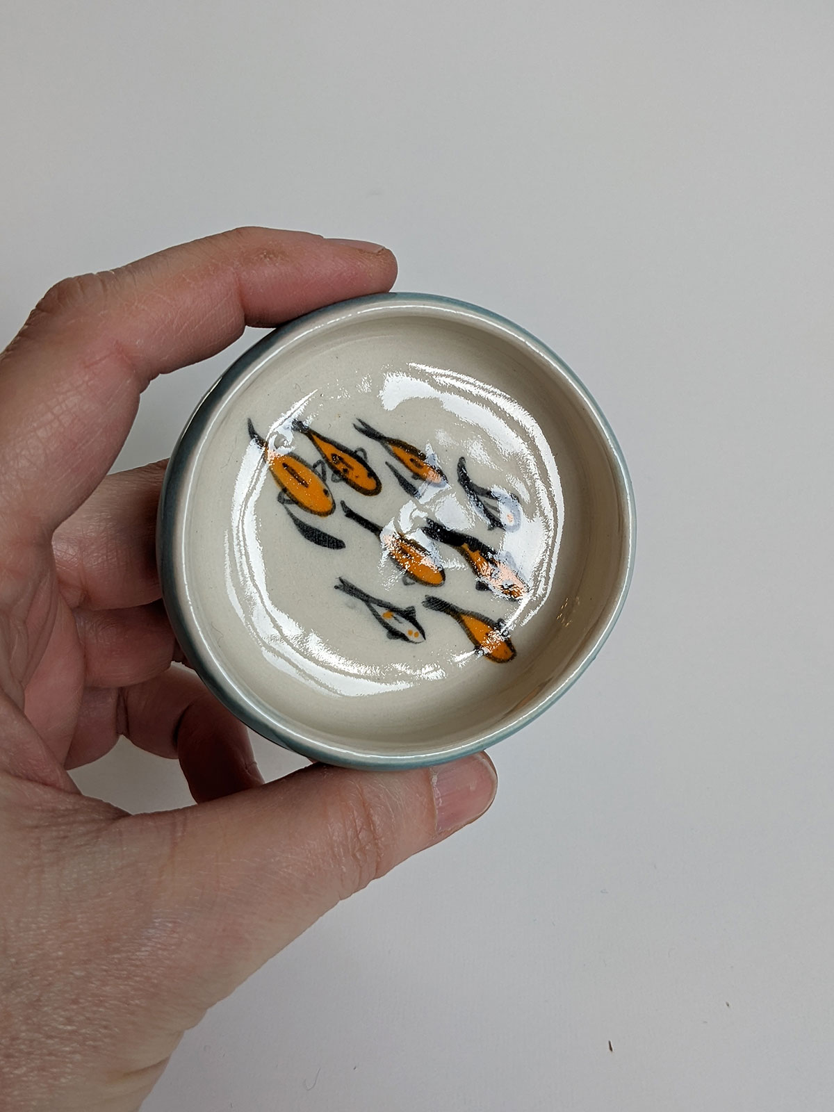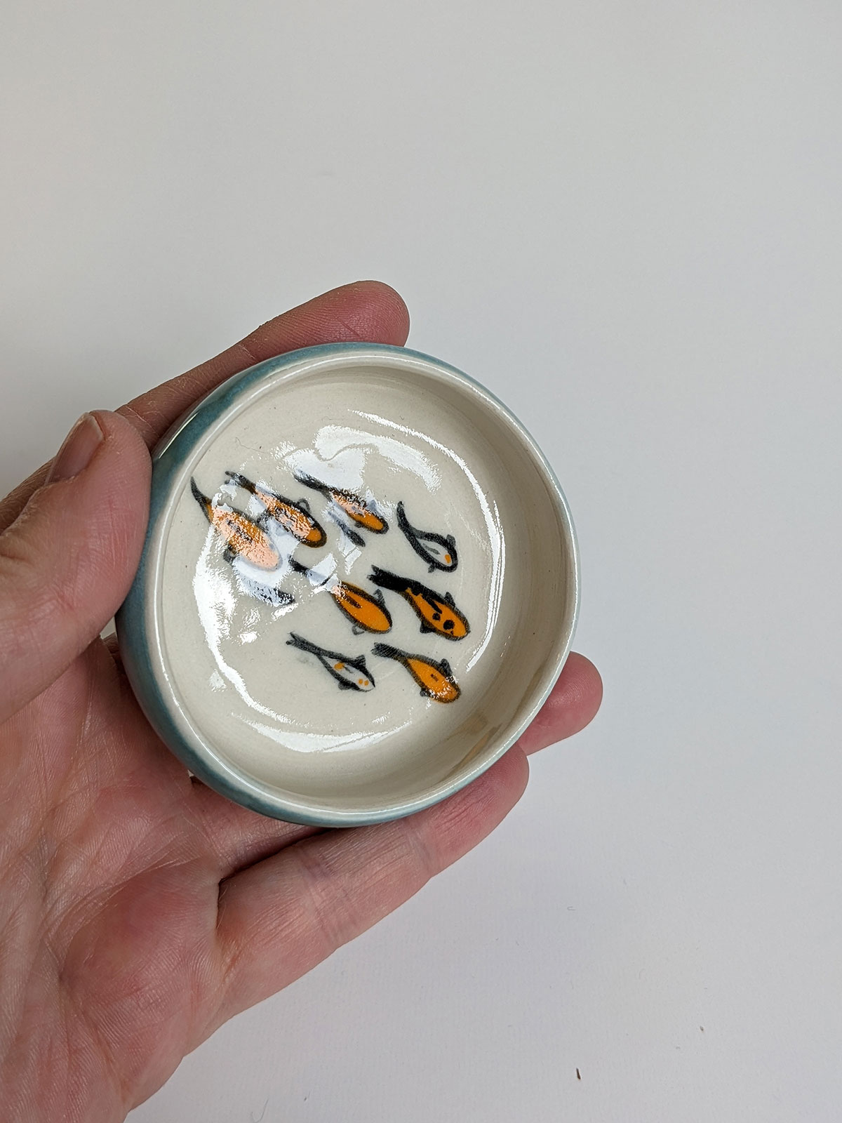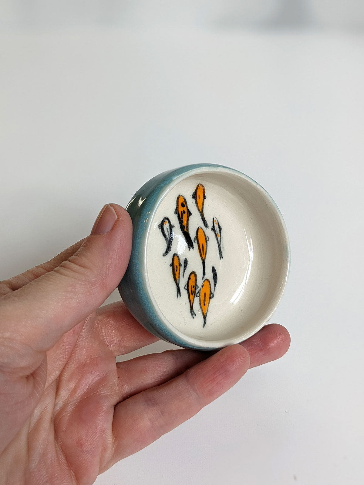 Tiny porcelain cup painted witha koi fish pond inside and a storm blue glaze outside. It’s a very small cup, about 2 cm high and 6.5 cm wide. The glazes are all foodsafe. Handmade pottery from Montréal, Québec.