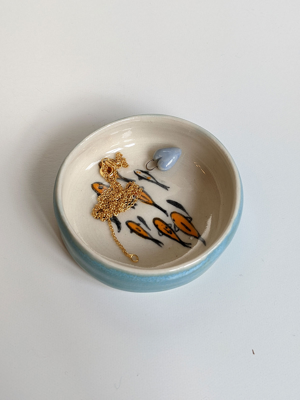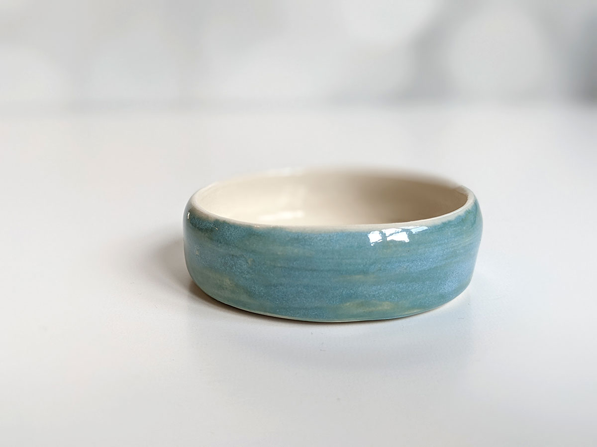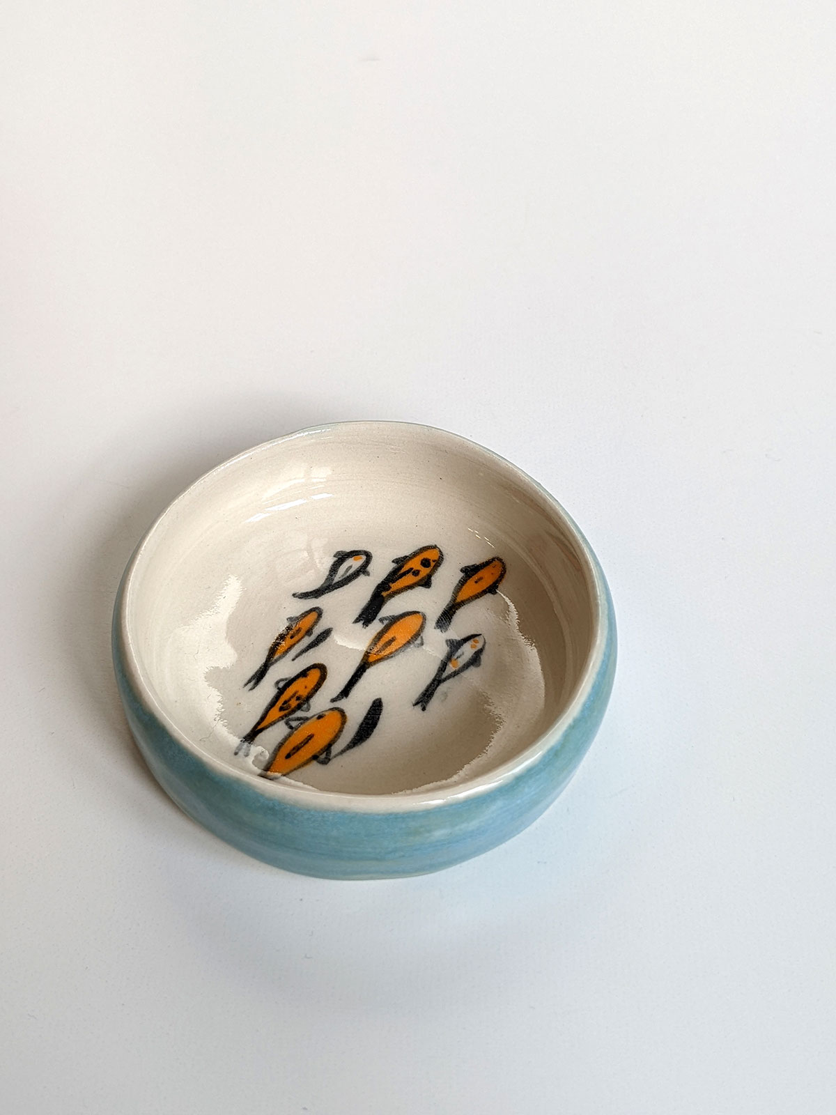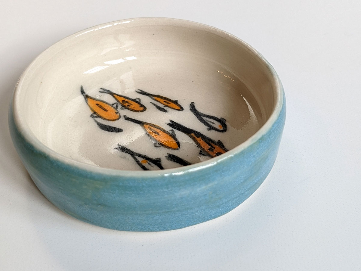 Tiny porcelain cup painted witha koi fish pond inside and a storm blue glaze outside. It’s a very small cup, about 2 cm high and 6.5 cm wide. The glazes are all foodsafe. Handmade pottery from Montréal, Québec.