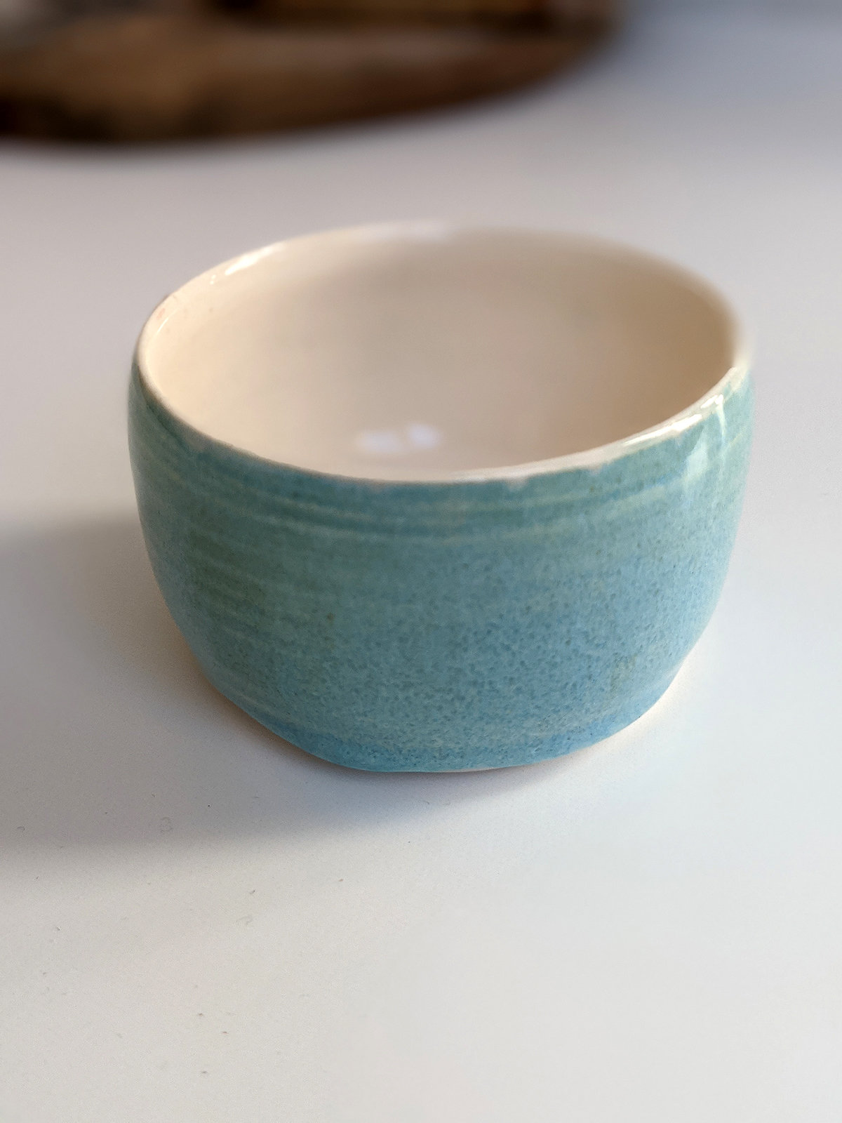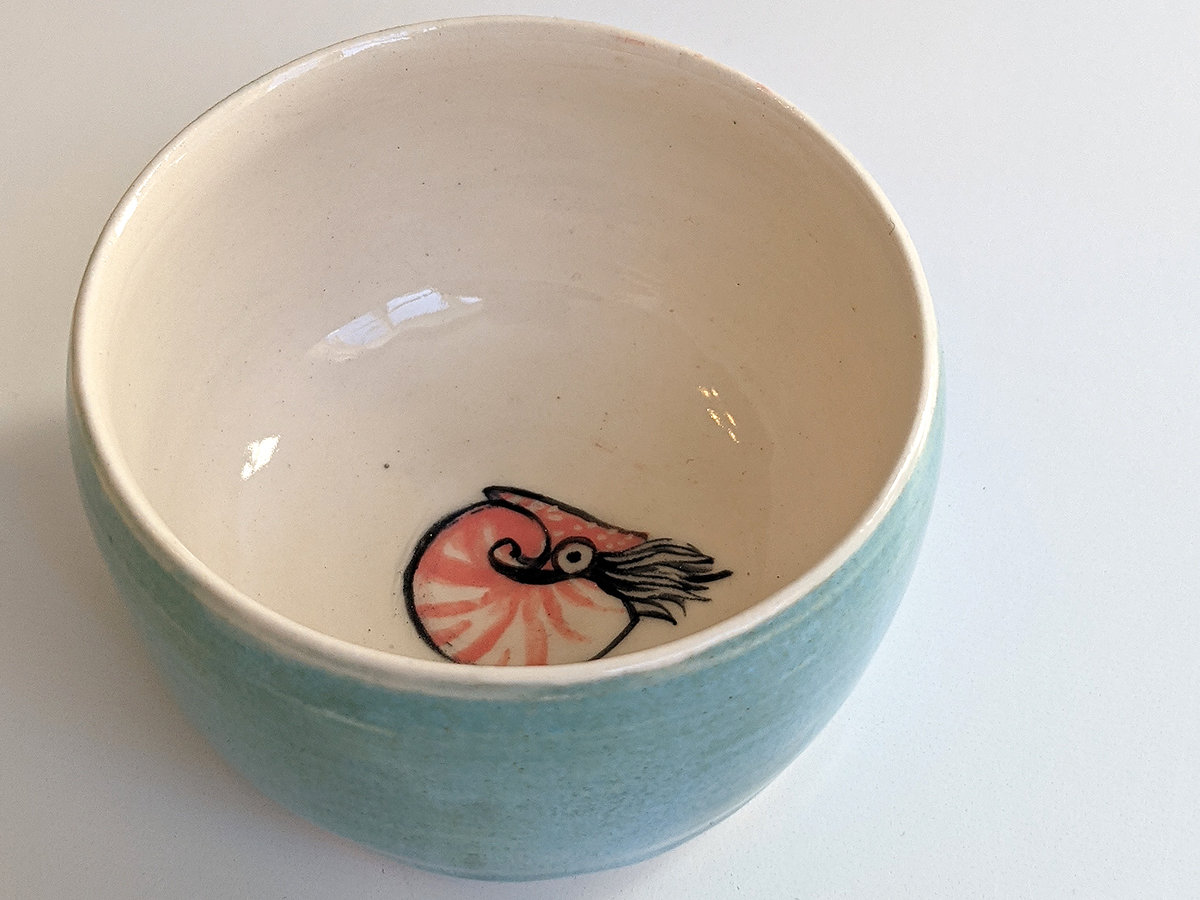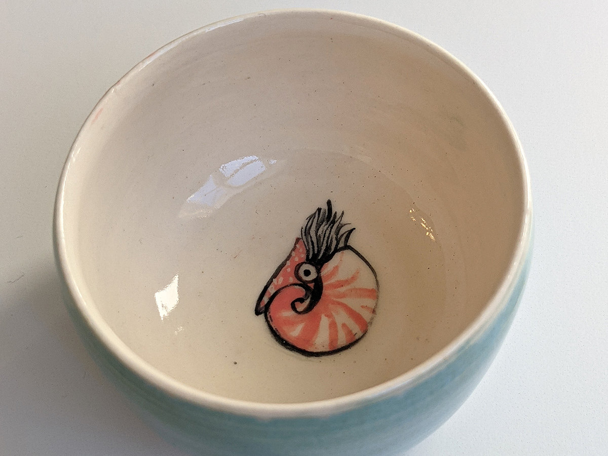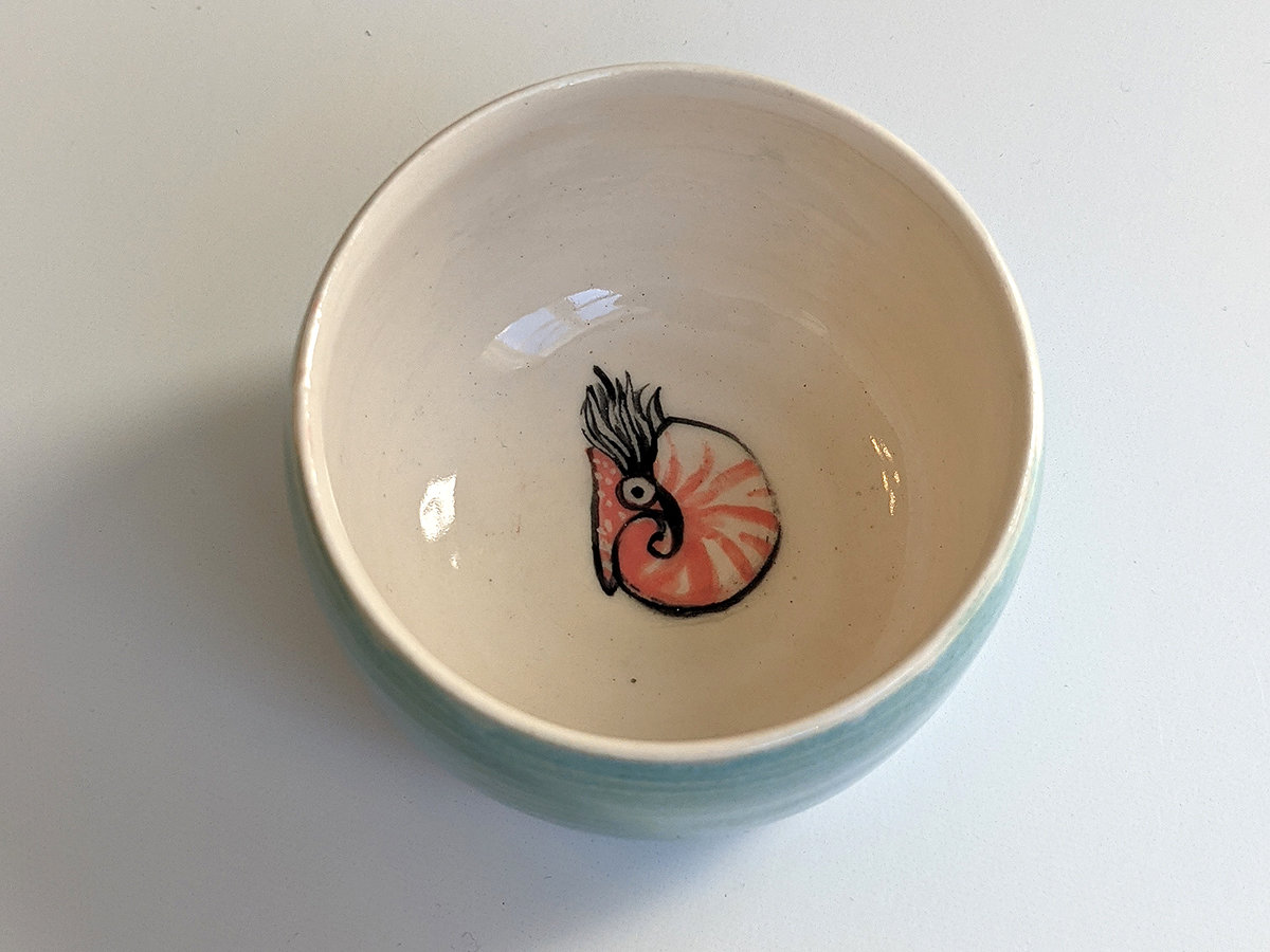 Small porcelain tumbler painted with  a nautilus inside and a blue glaze outside. It’s a tiny tumbler, about 4.5 cm high and 7 cm wide. The glazes are all foodsafe. Handmade pottery from Montréal, Québec.