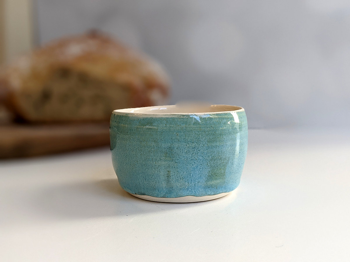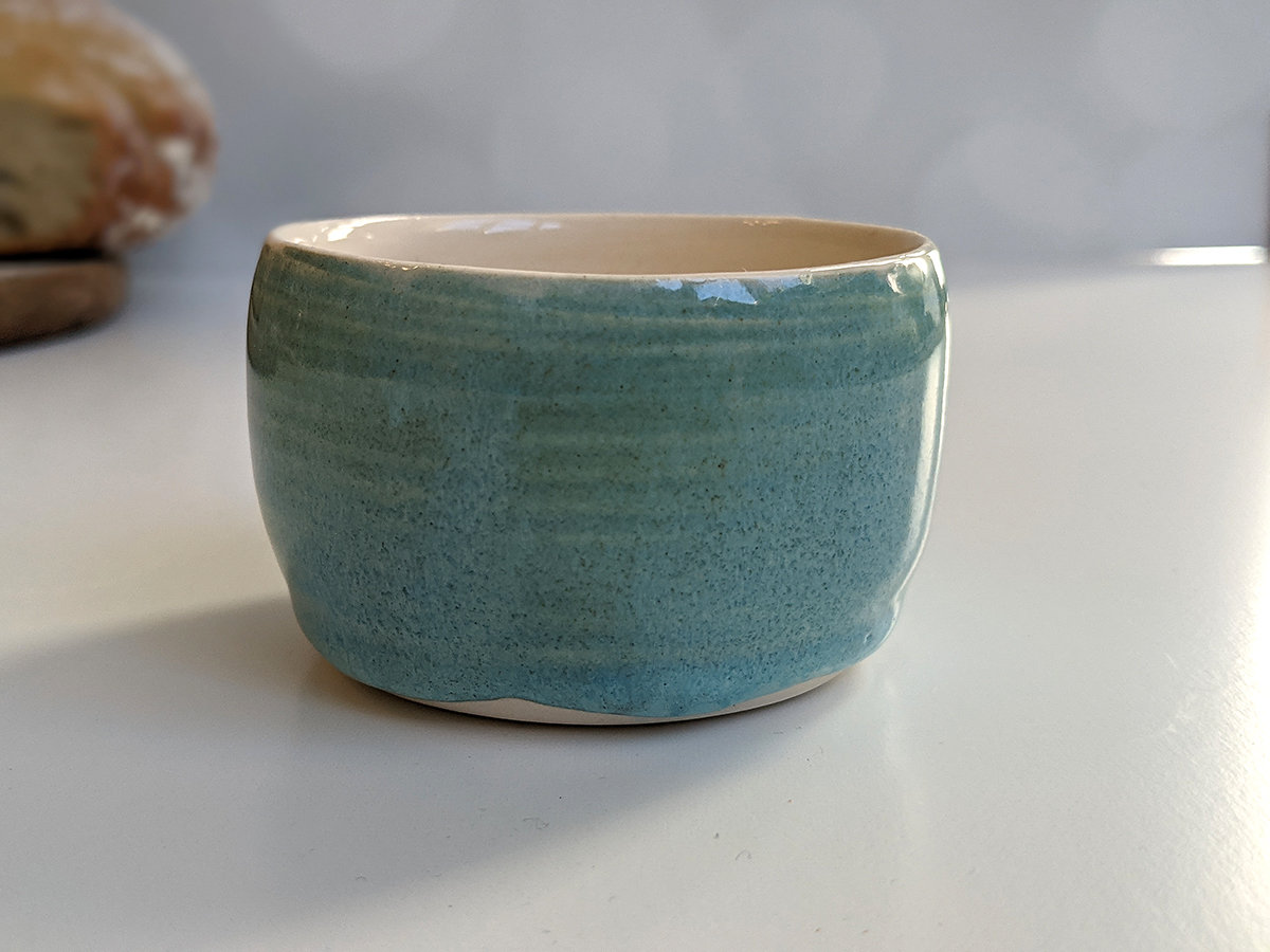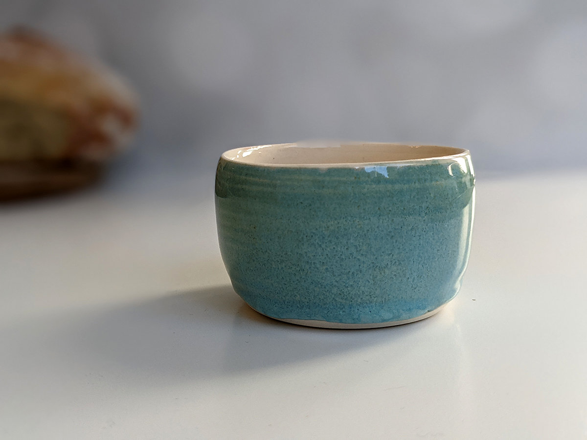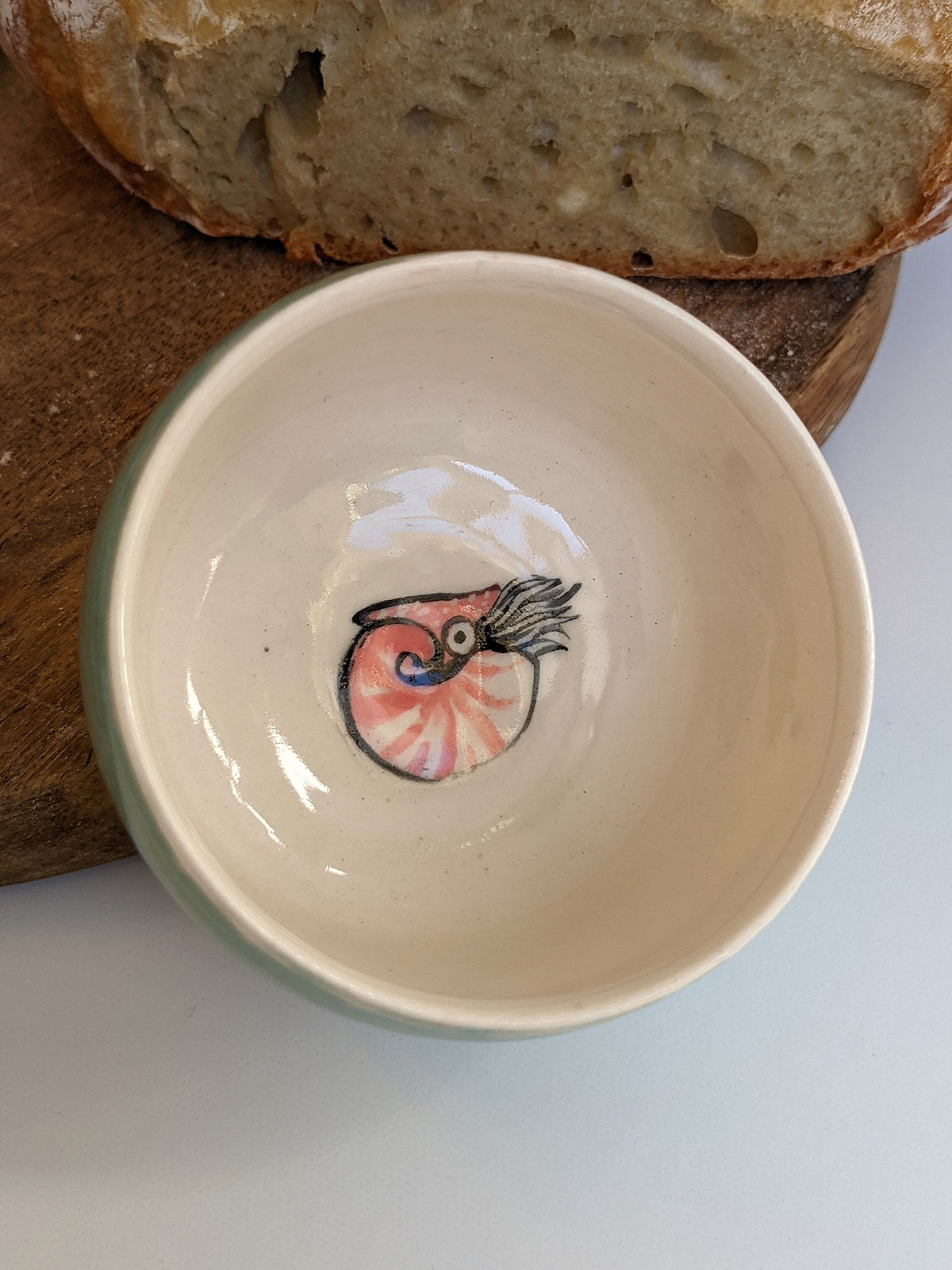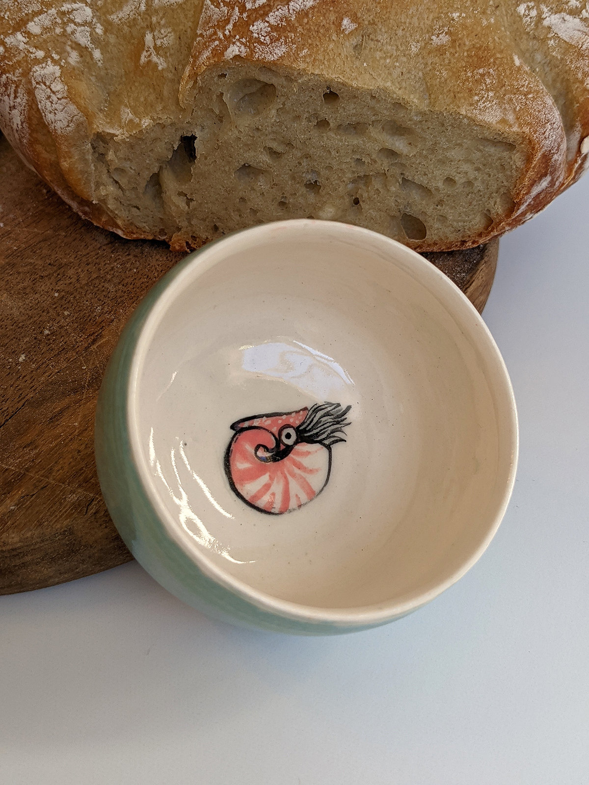 Small porcelain tumbler painted with  a nautilus inside and a blue glaze outside. It’s a tiny tumbler, about 4.5 cm high and 7 cm wide. The glazes are all foodsafe. Handmade pottery from Montréal, Québec.