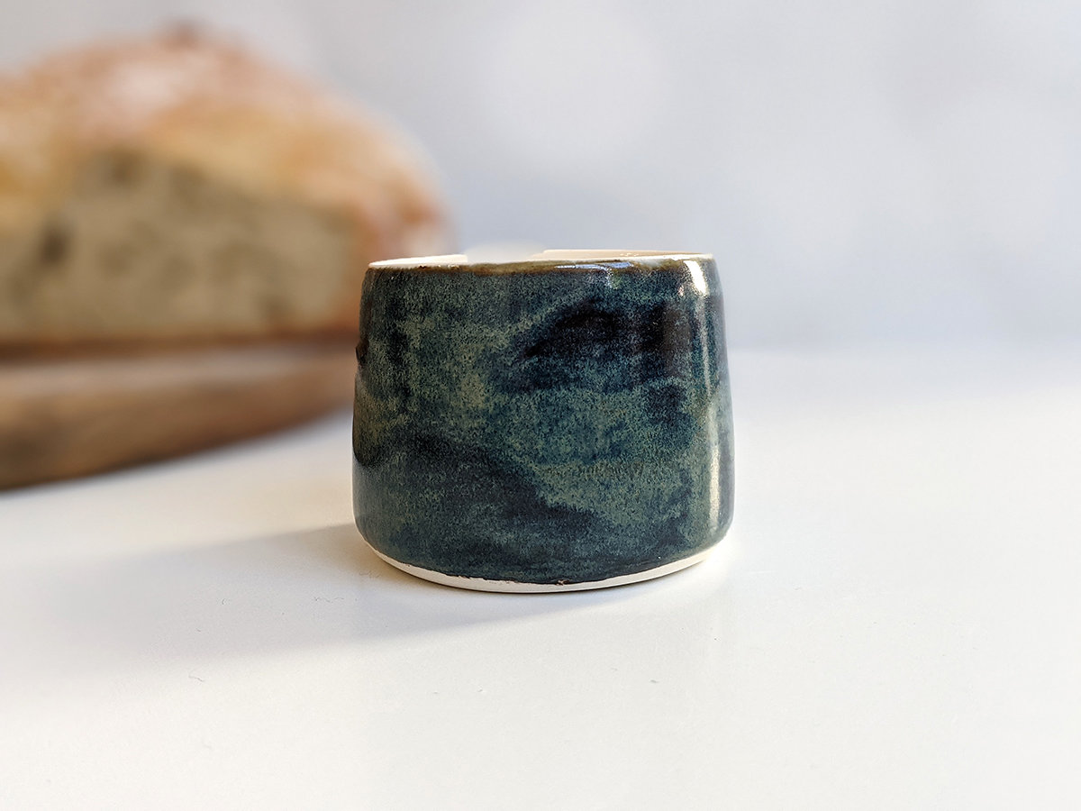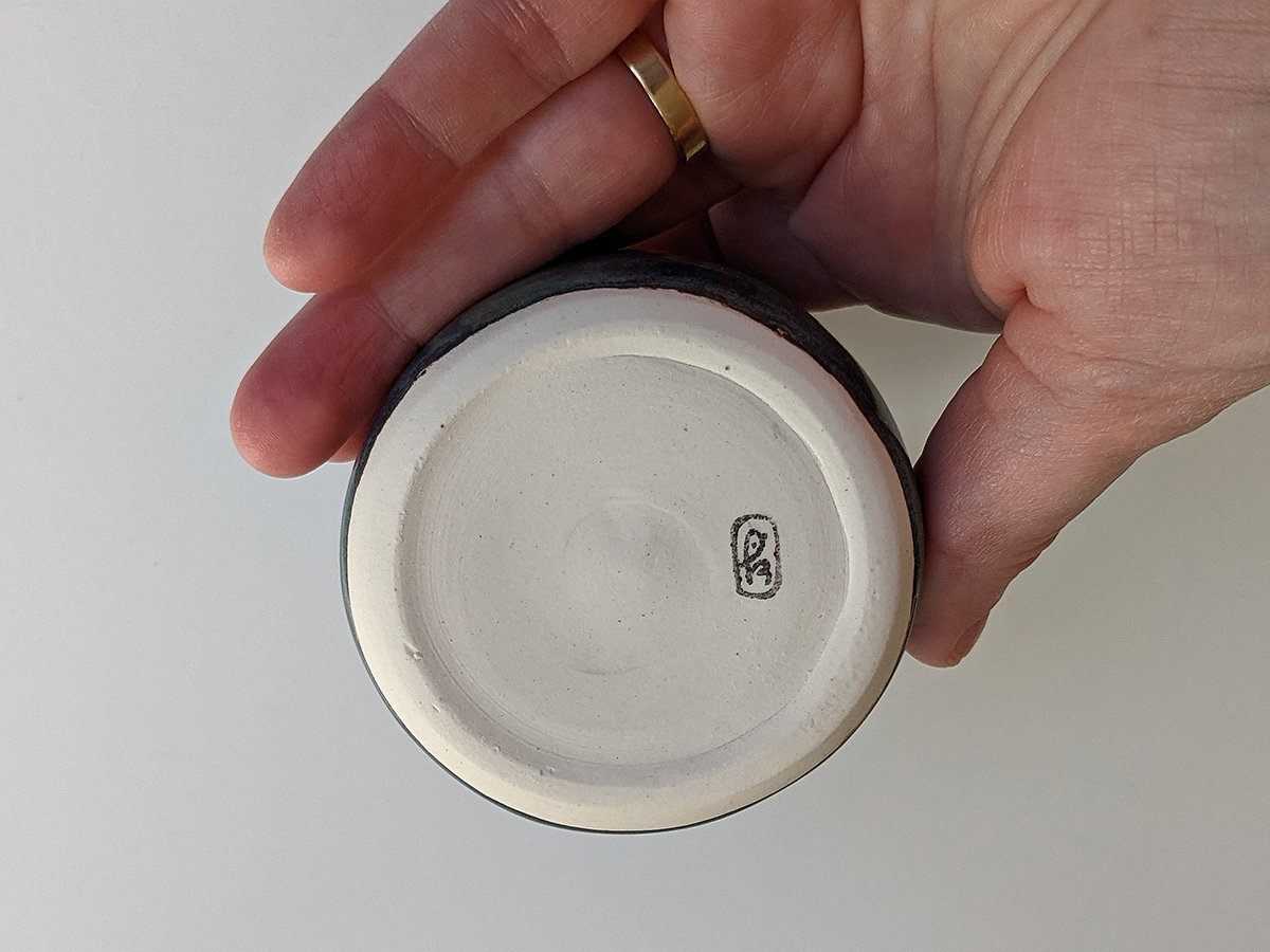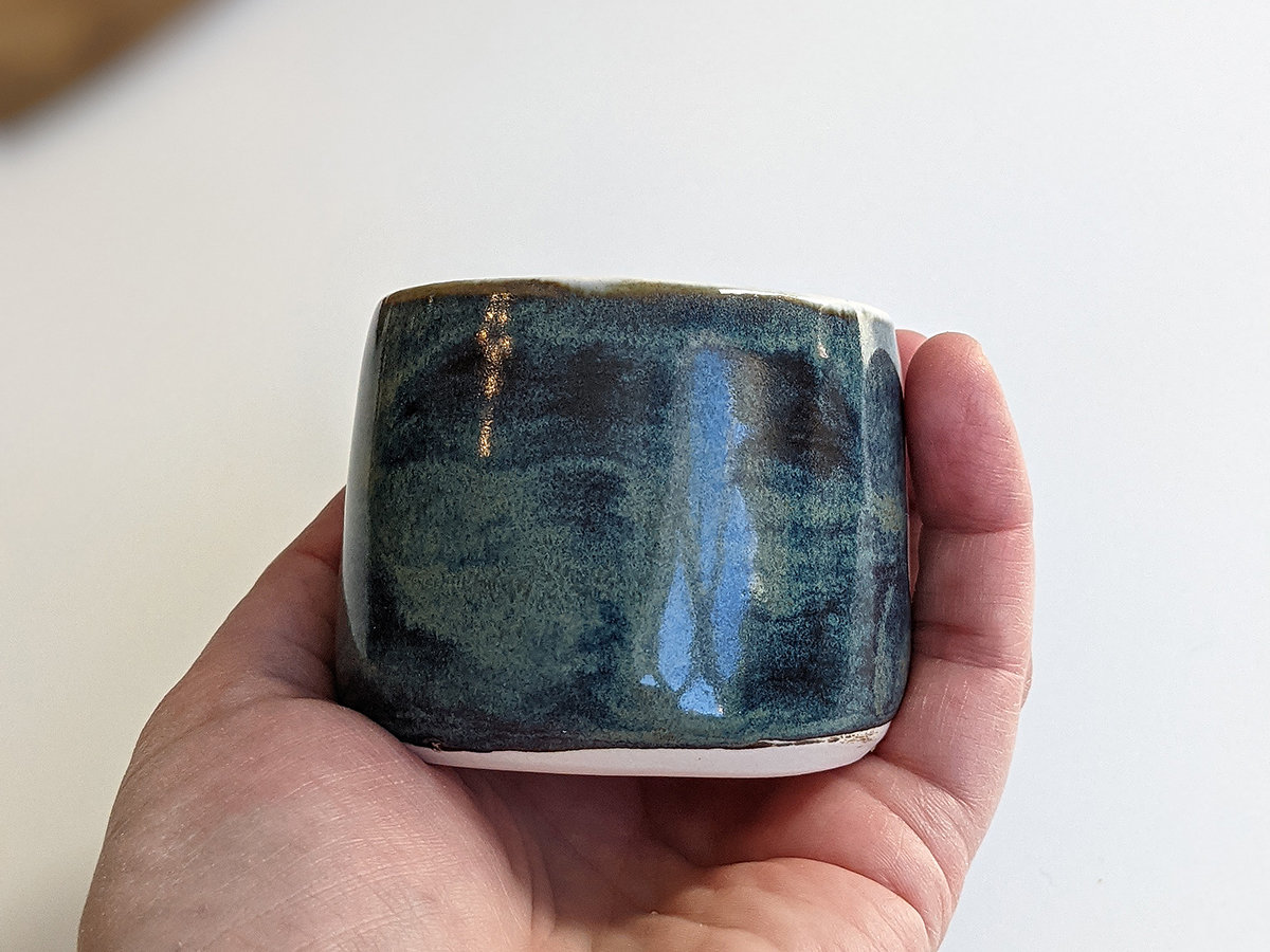 Small porcelain tumbler painted with rays, inside and a stormy sky glaze outside. It’s a tiny tumbler, about 5 cm high and 5.5 cm wide, just right for an expresso or holding tiny things.