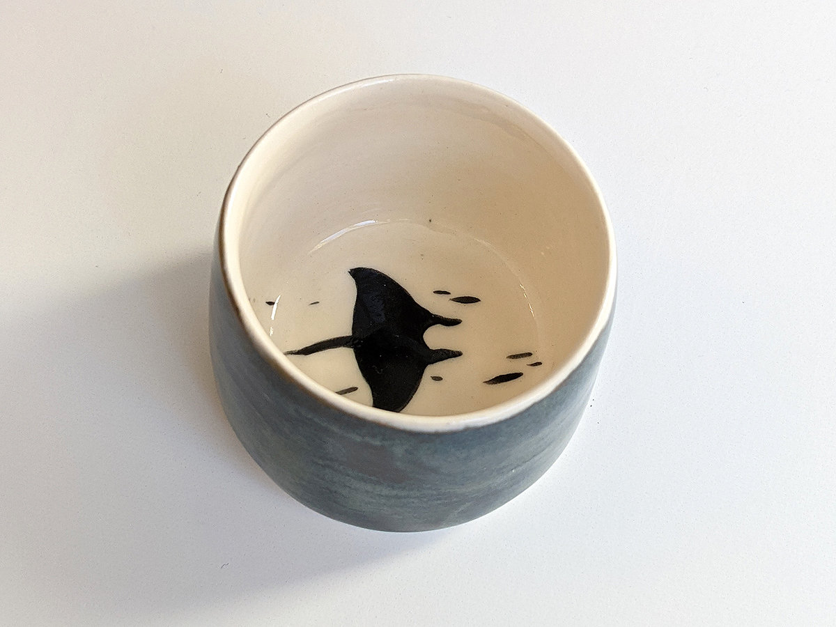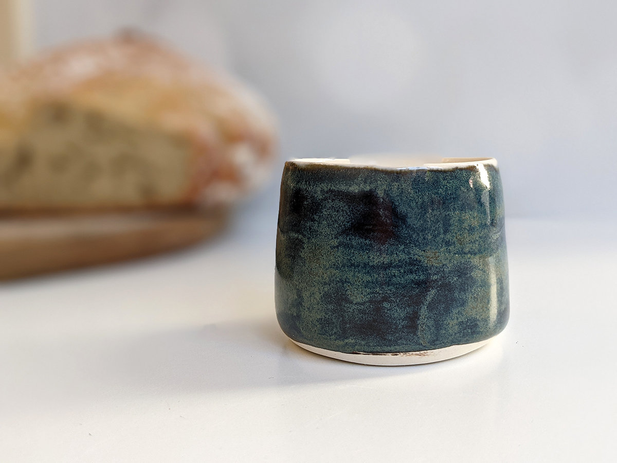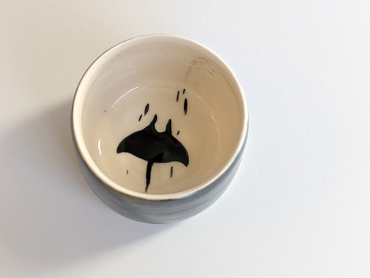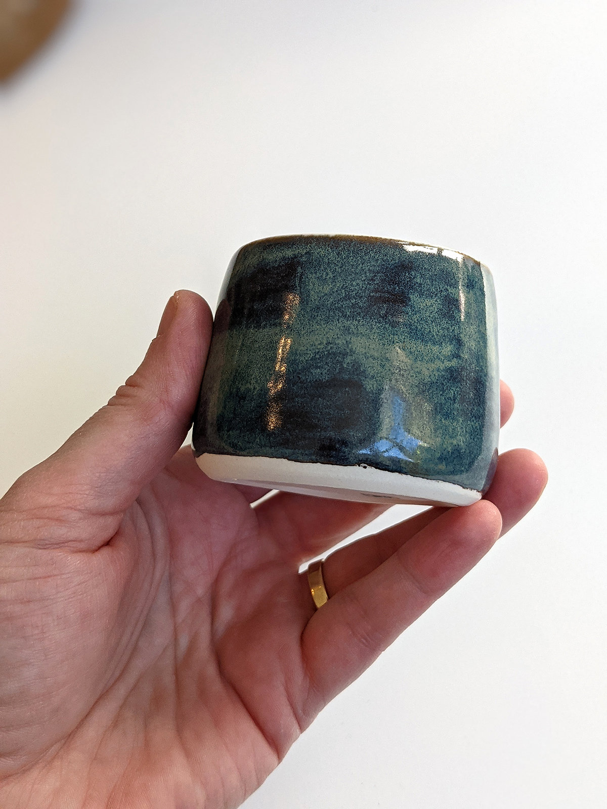 Small porcelain tumbler painted with rays, inside and a stormy sky glaze outside. It’s a tiny tumbler, about 5 cm high and 5.5 cm wide, just right for an expresso or holding tiny things.
