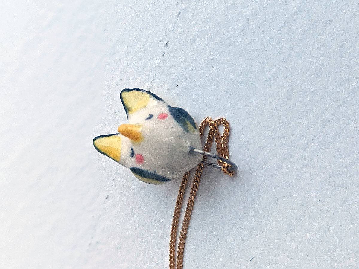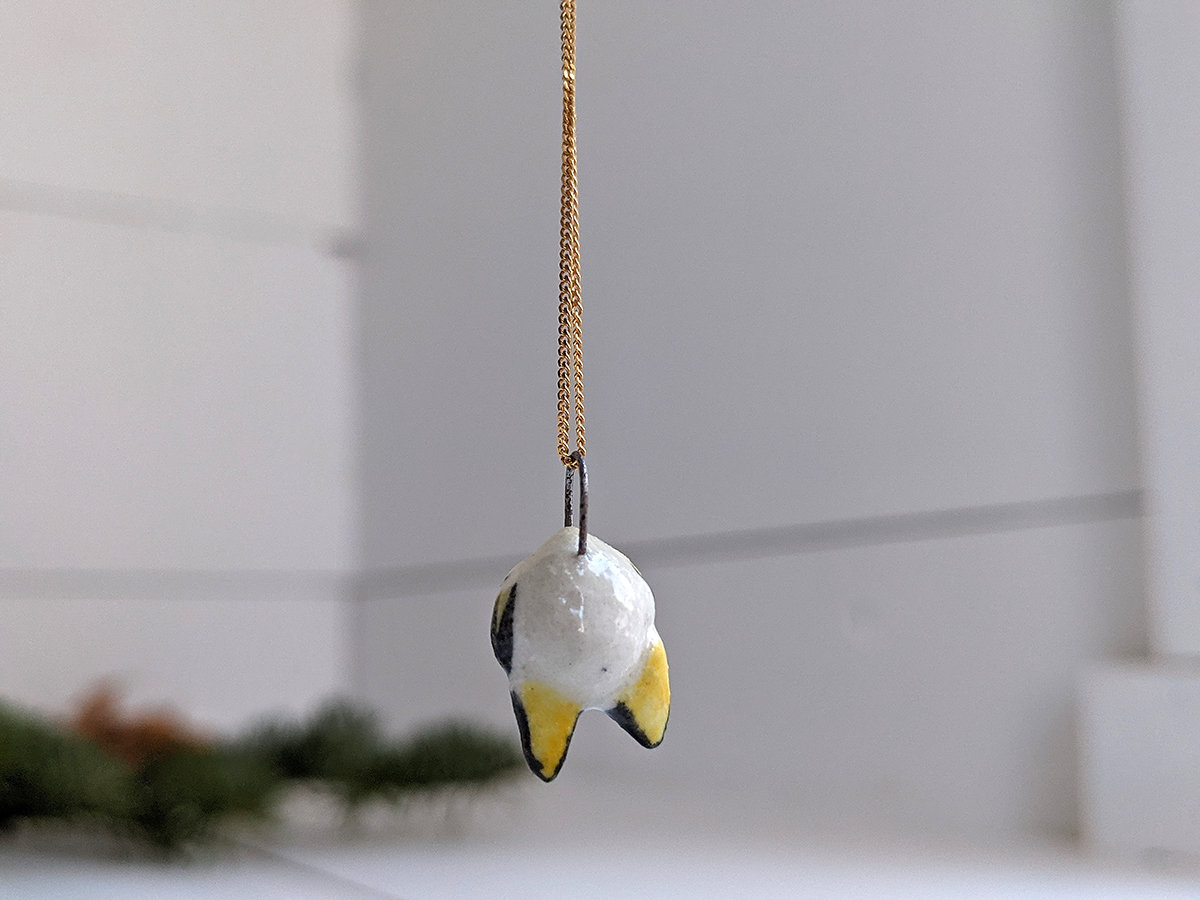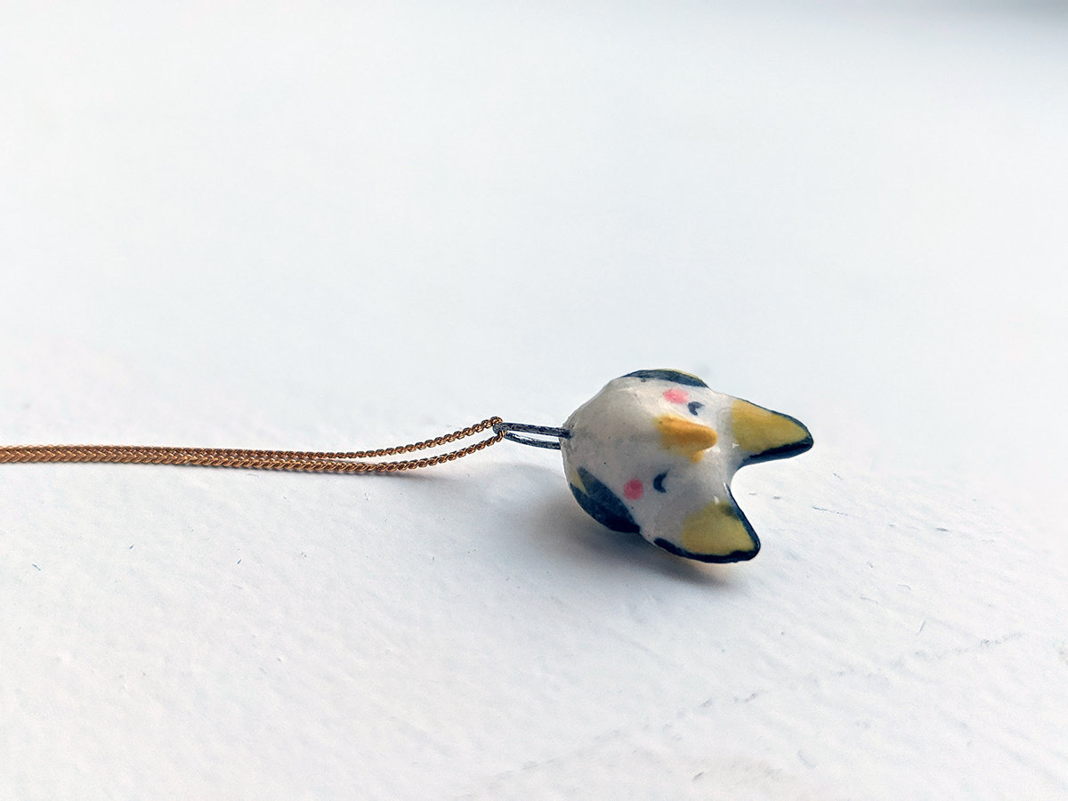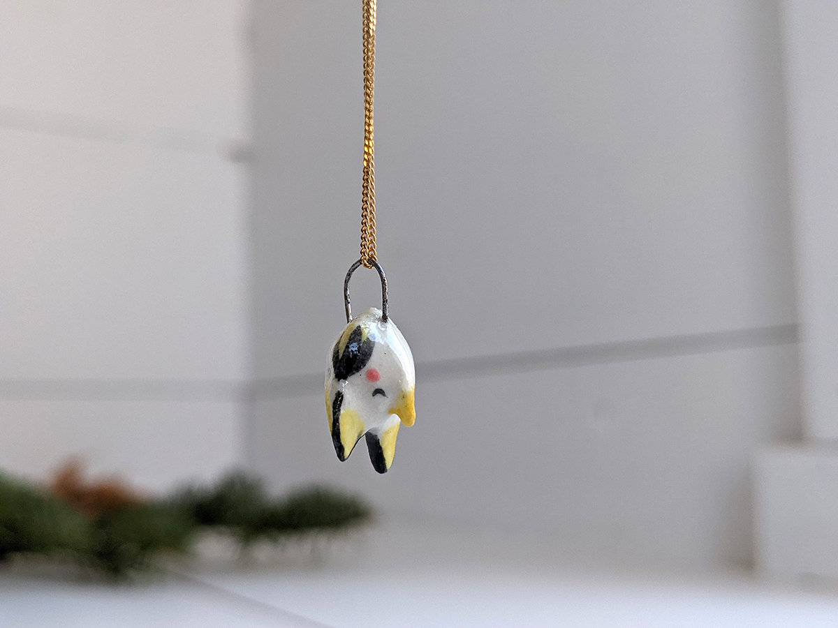 Tiny Honduran White bat pendant, wrapped into its wings, Yellow and white with pink details. Pendant only, chain is not included.