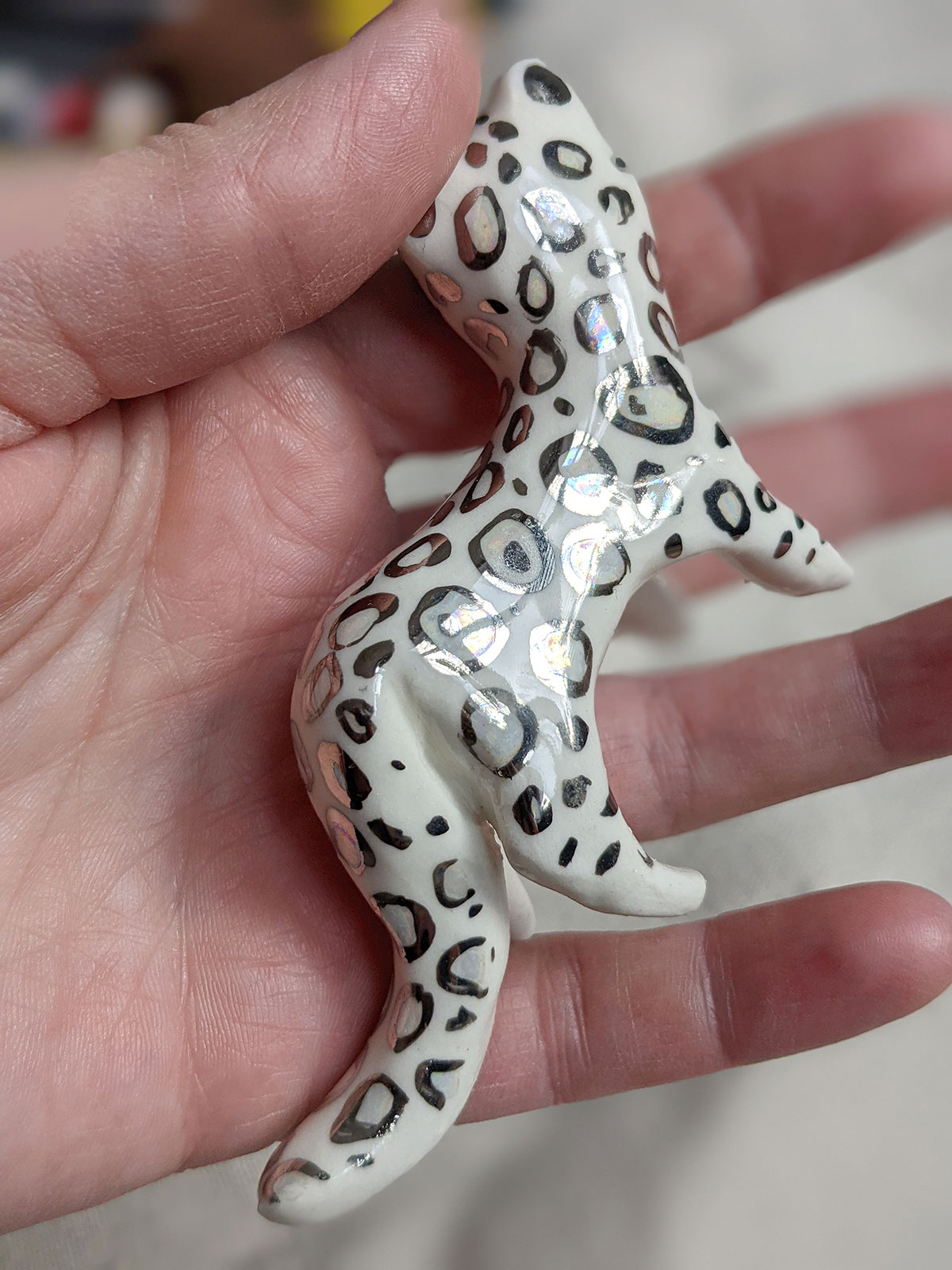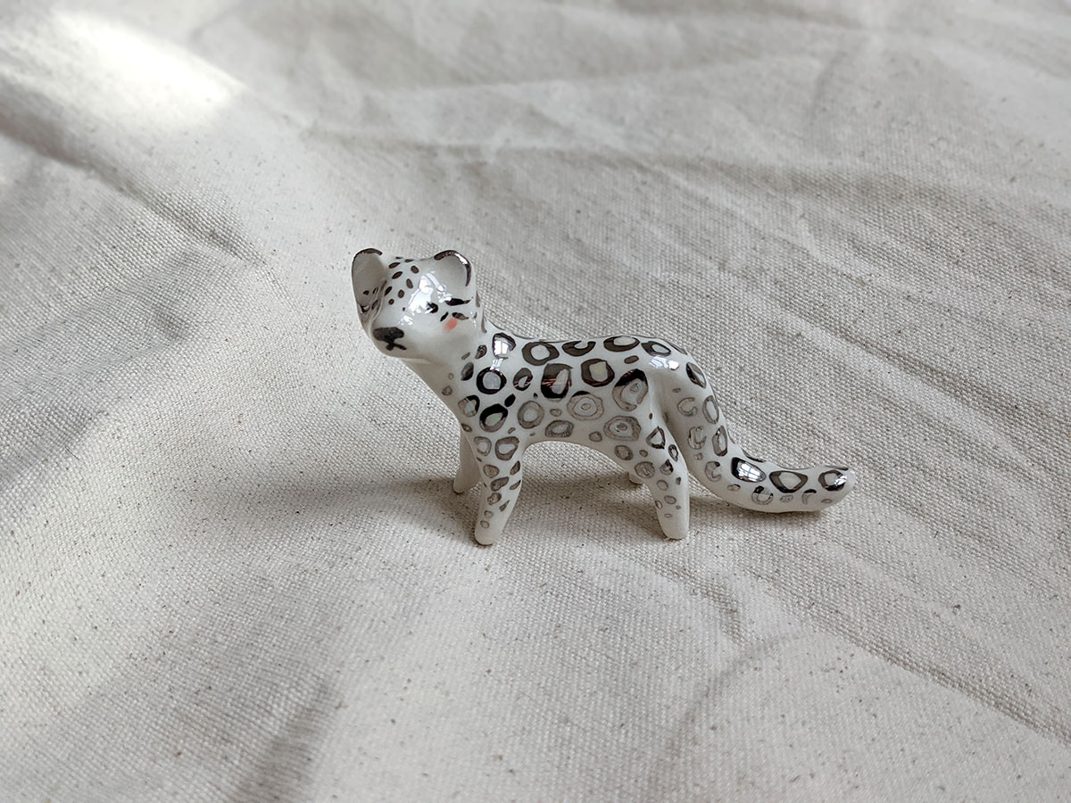 Léopard des neiges en porcelaine décoré d’or blanc et de nacre dans les ocelles. Environ 7 cm de long. Pièce unique.