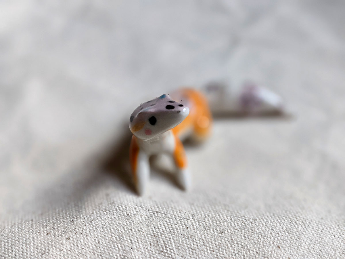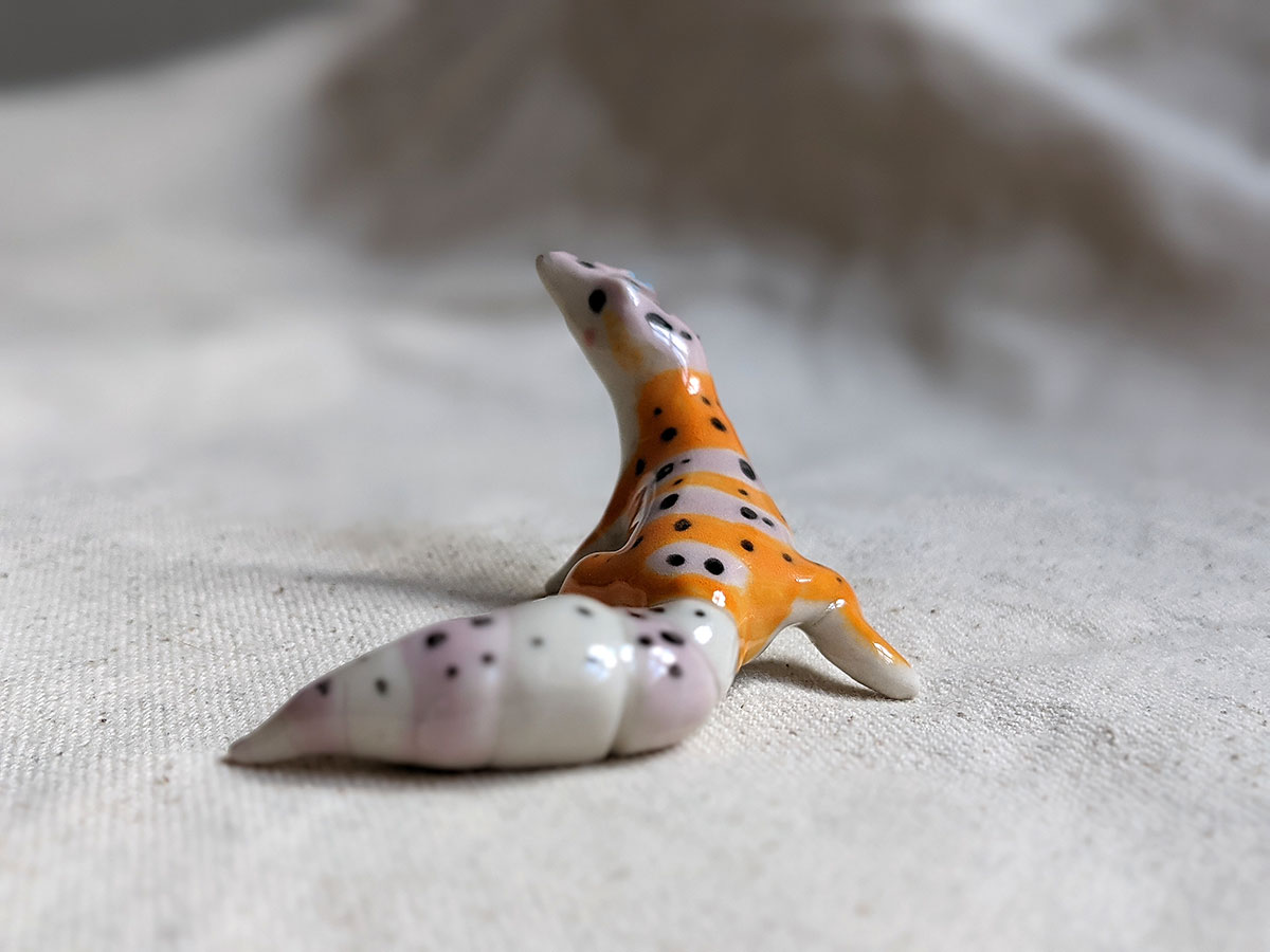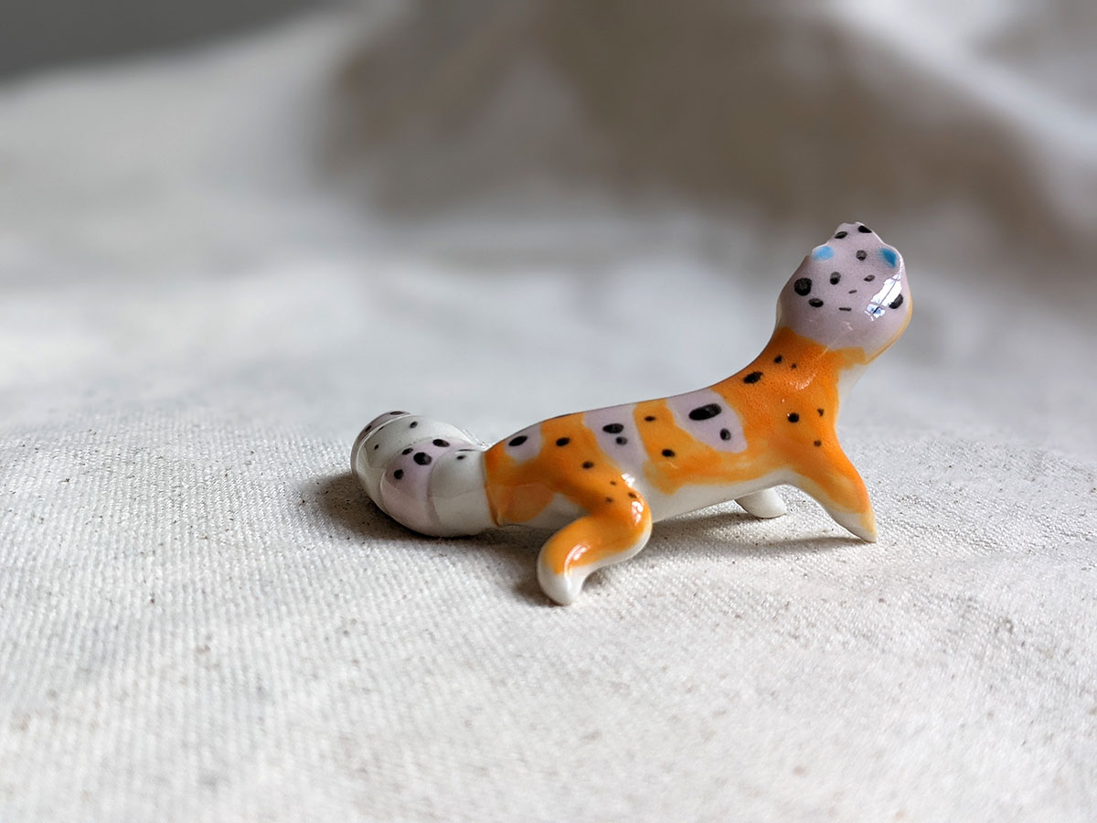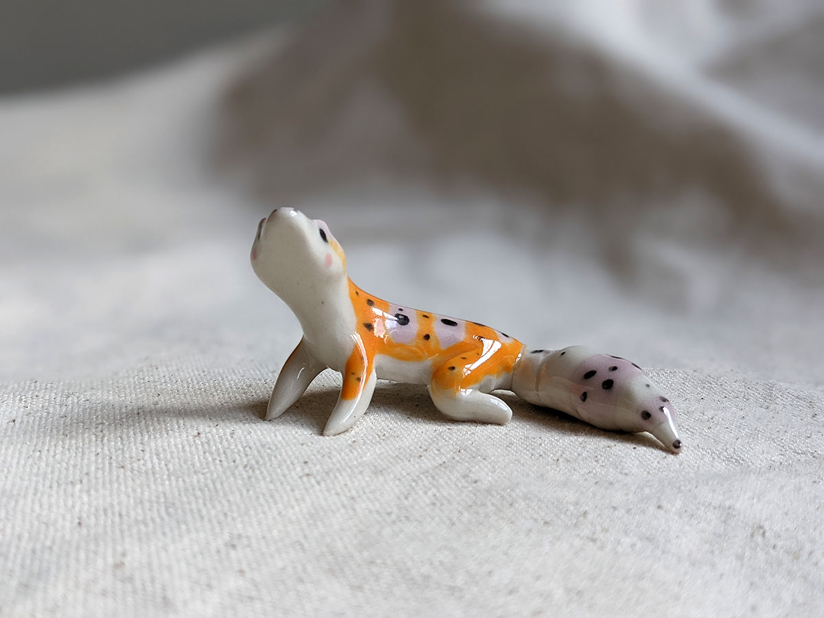 Leopard gecko figurine in porcelain, about 7 cm long. One of a kind.