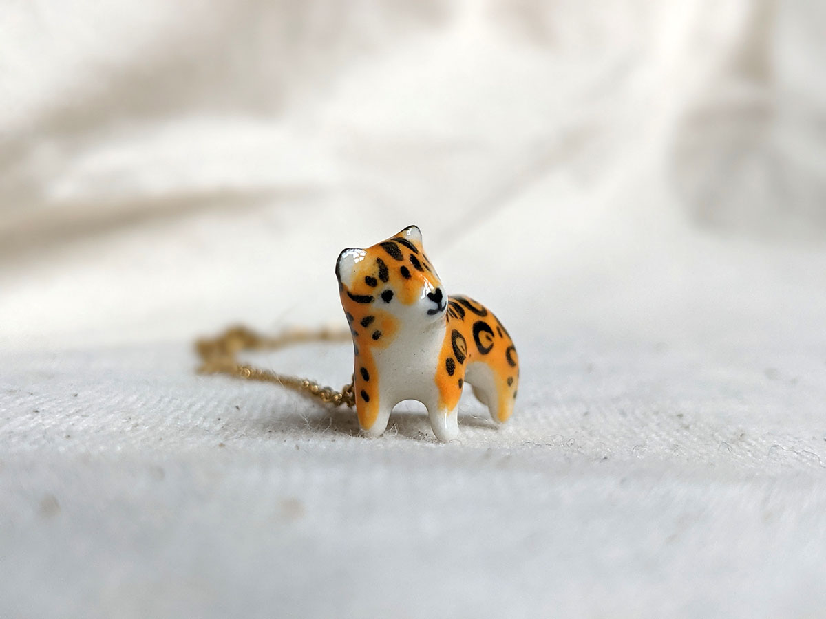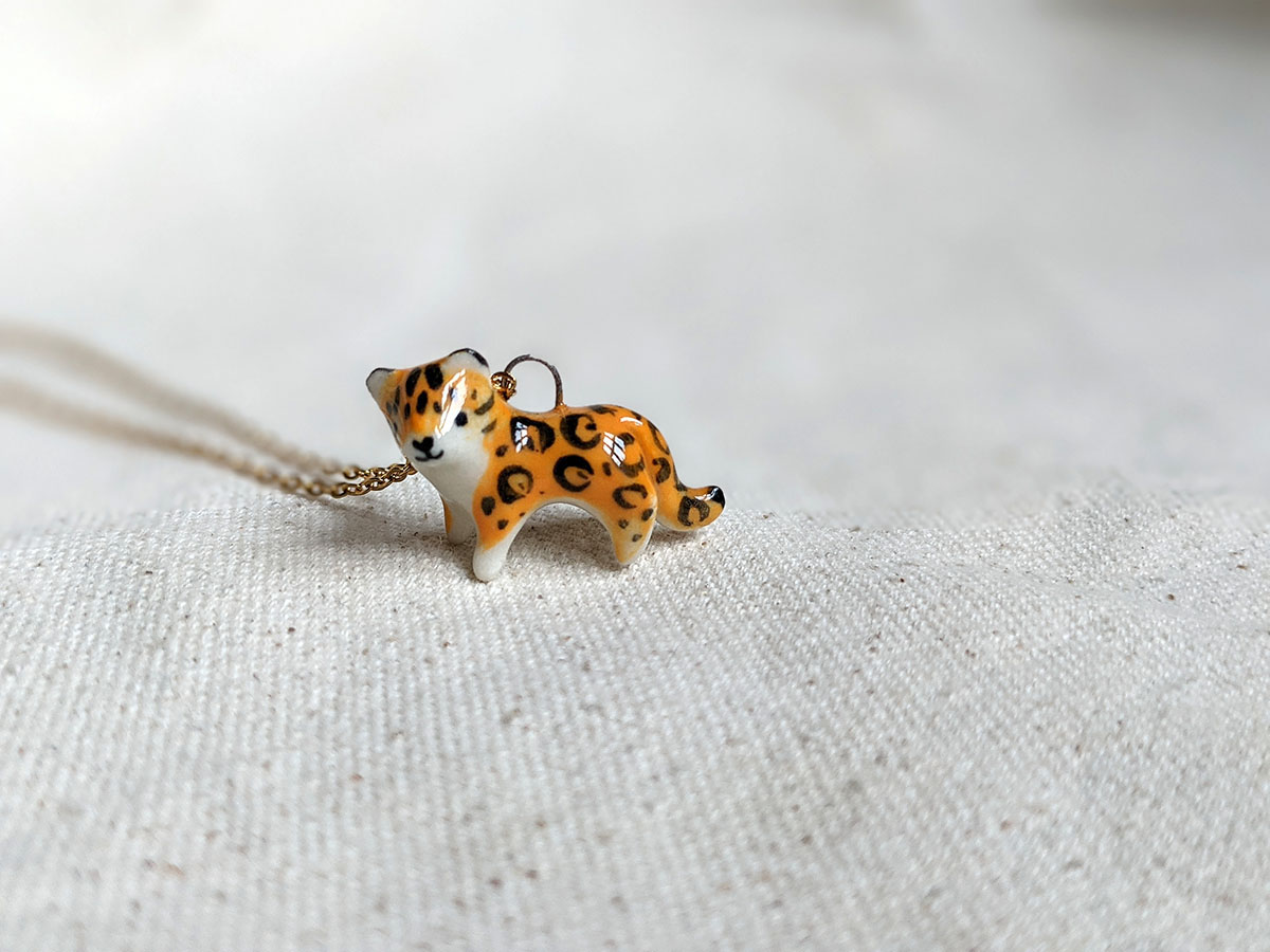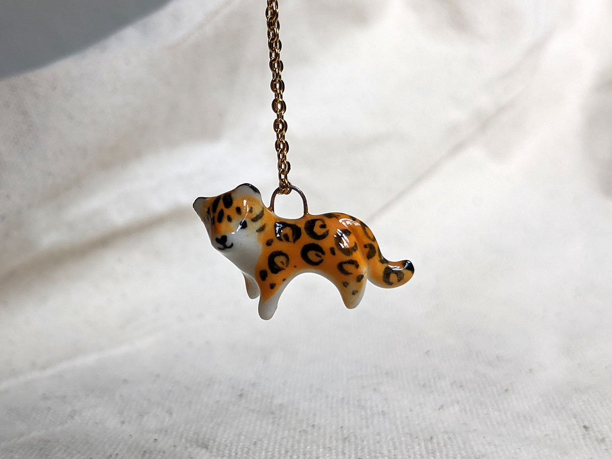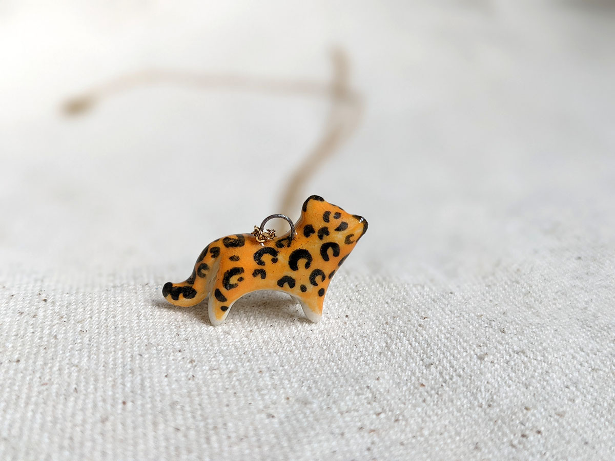 Tiny Leopard porcelain pendant; one of a kind piece of jewelry, about 2 cm long. It is handcrafted and fired in Montréal, Québec. Chain sold separately.