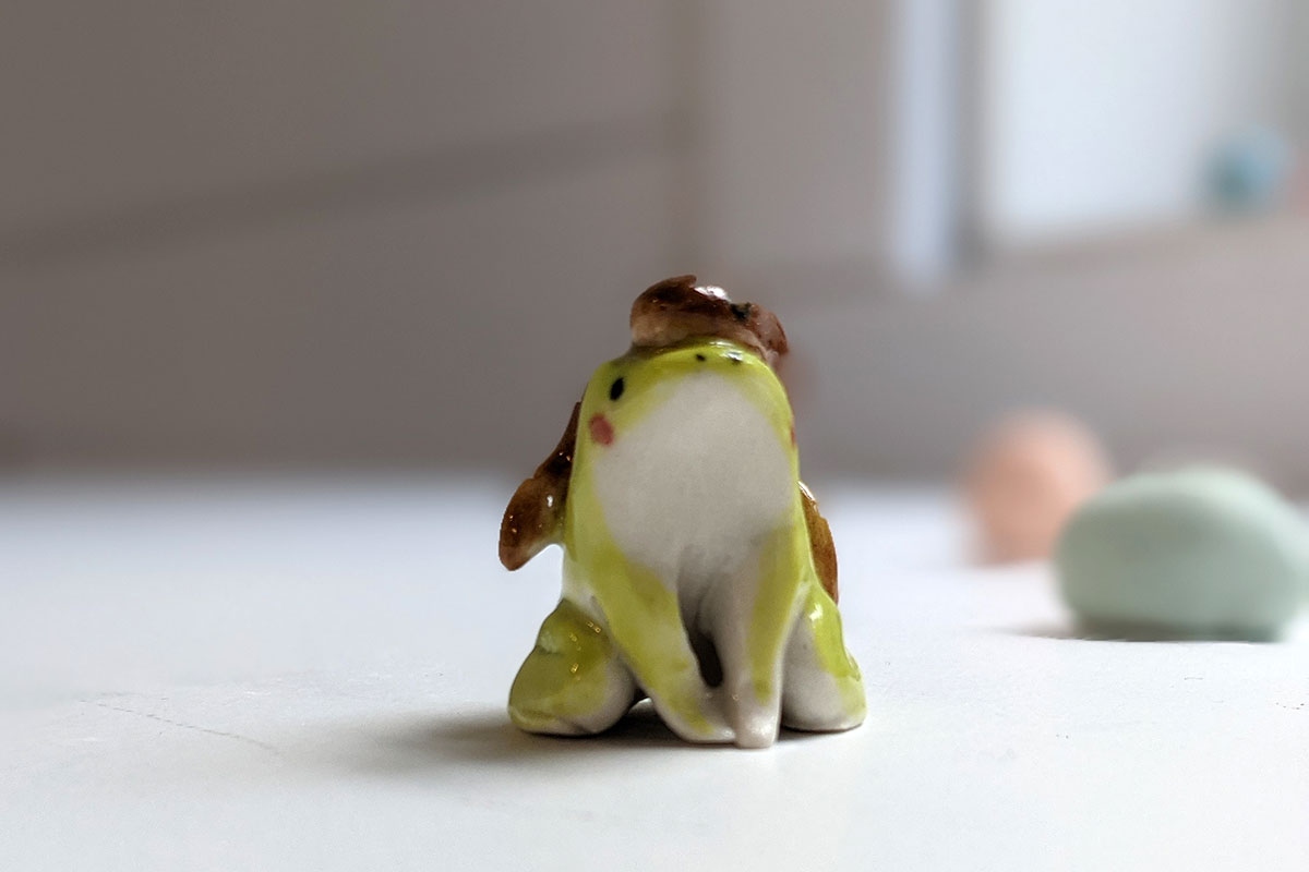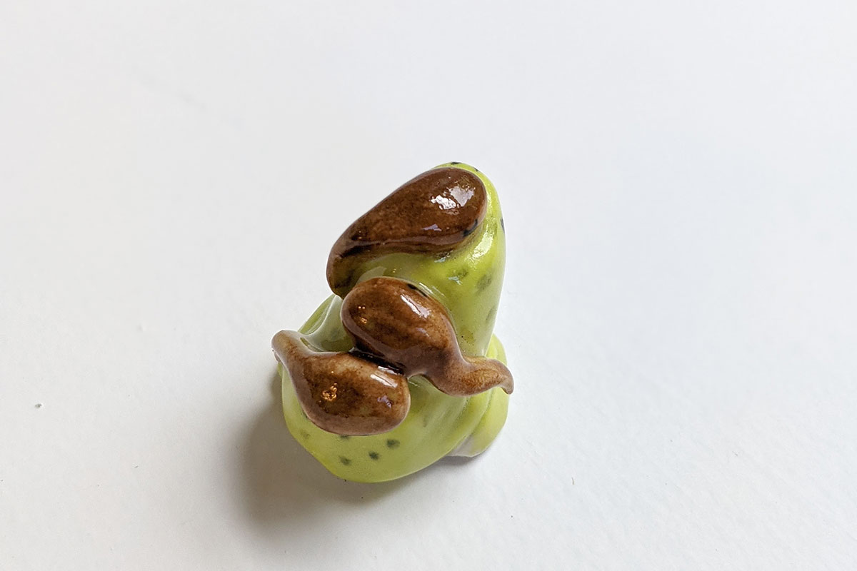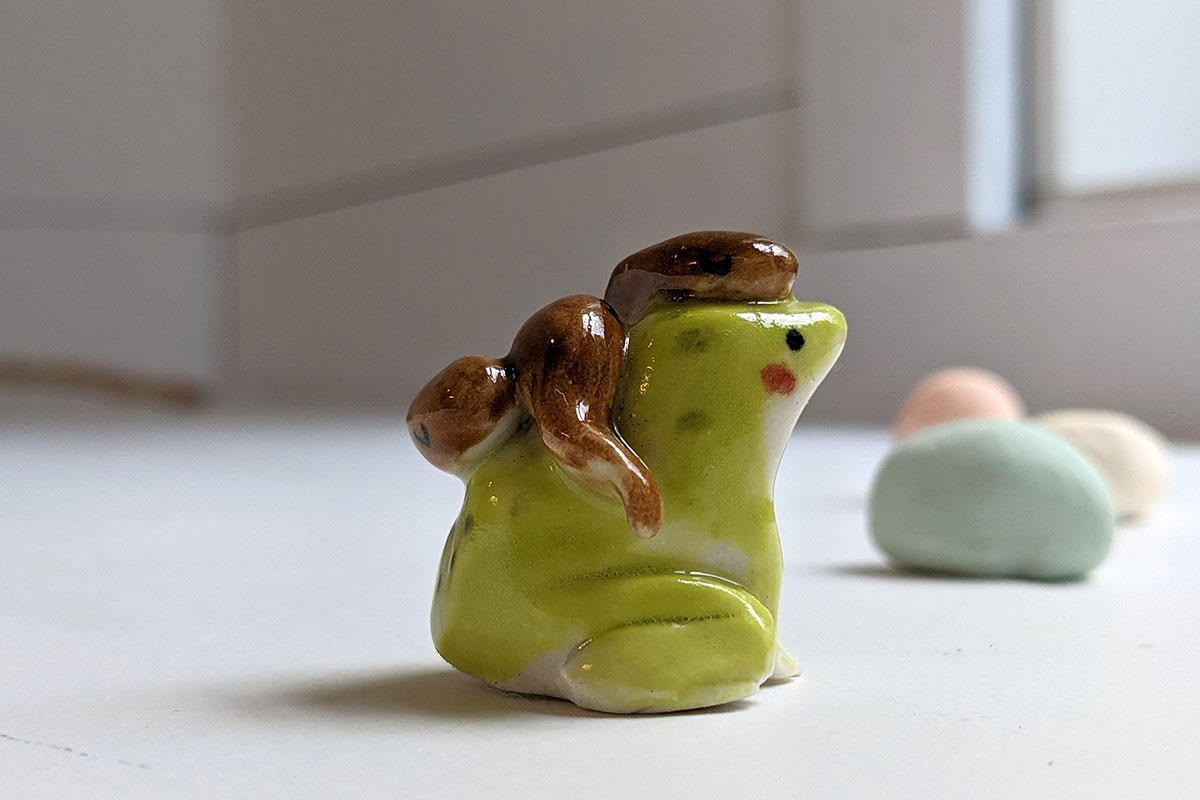 Maman grenouille portant ses têtards sur son dos. Figurine en porcelaine unique, sculptée et peinte à Montréal.