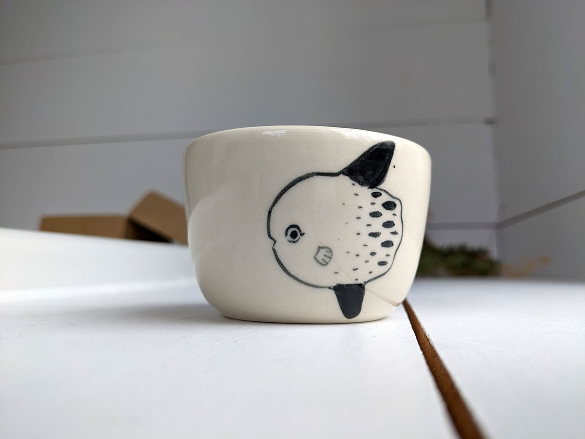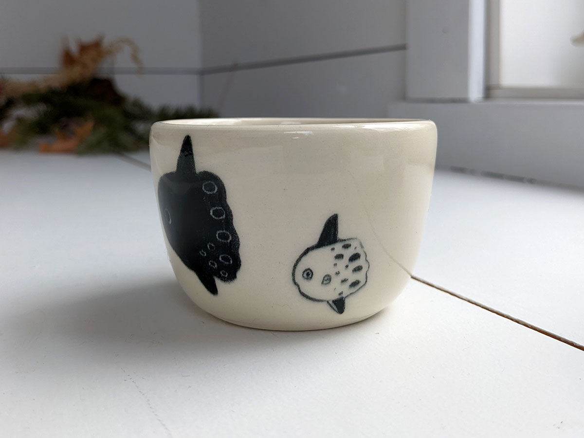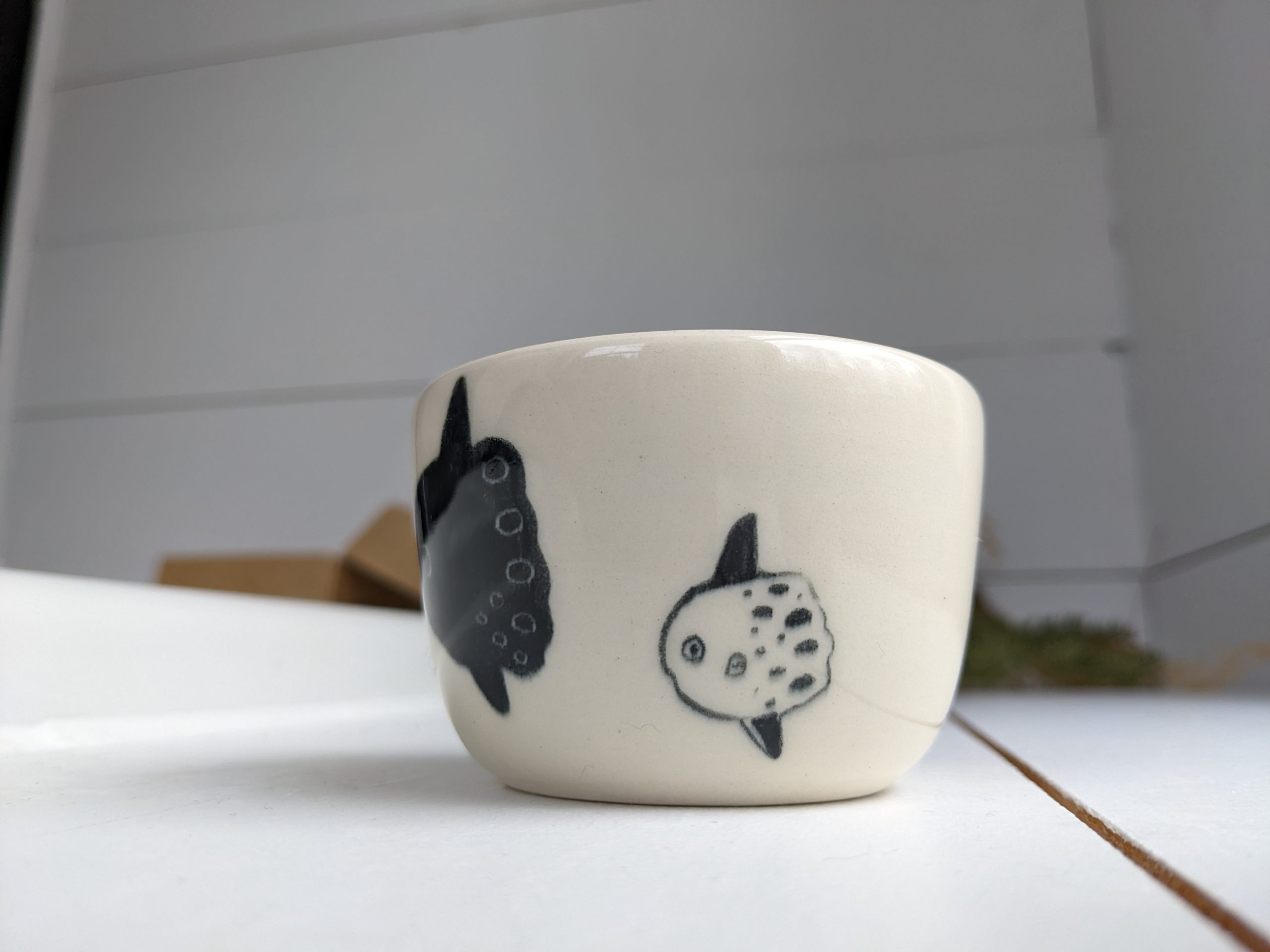 Small porcelain tumbler with a sunfish decor. It’s in white porcelain and clear glaze. Food safe, this tiny tumbler is 5 cm wide and 8 cm high. Handmade pottery from Montréal, Québec.
