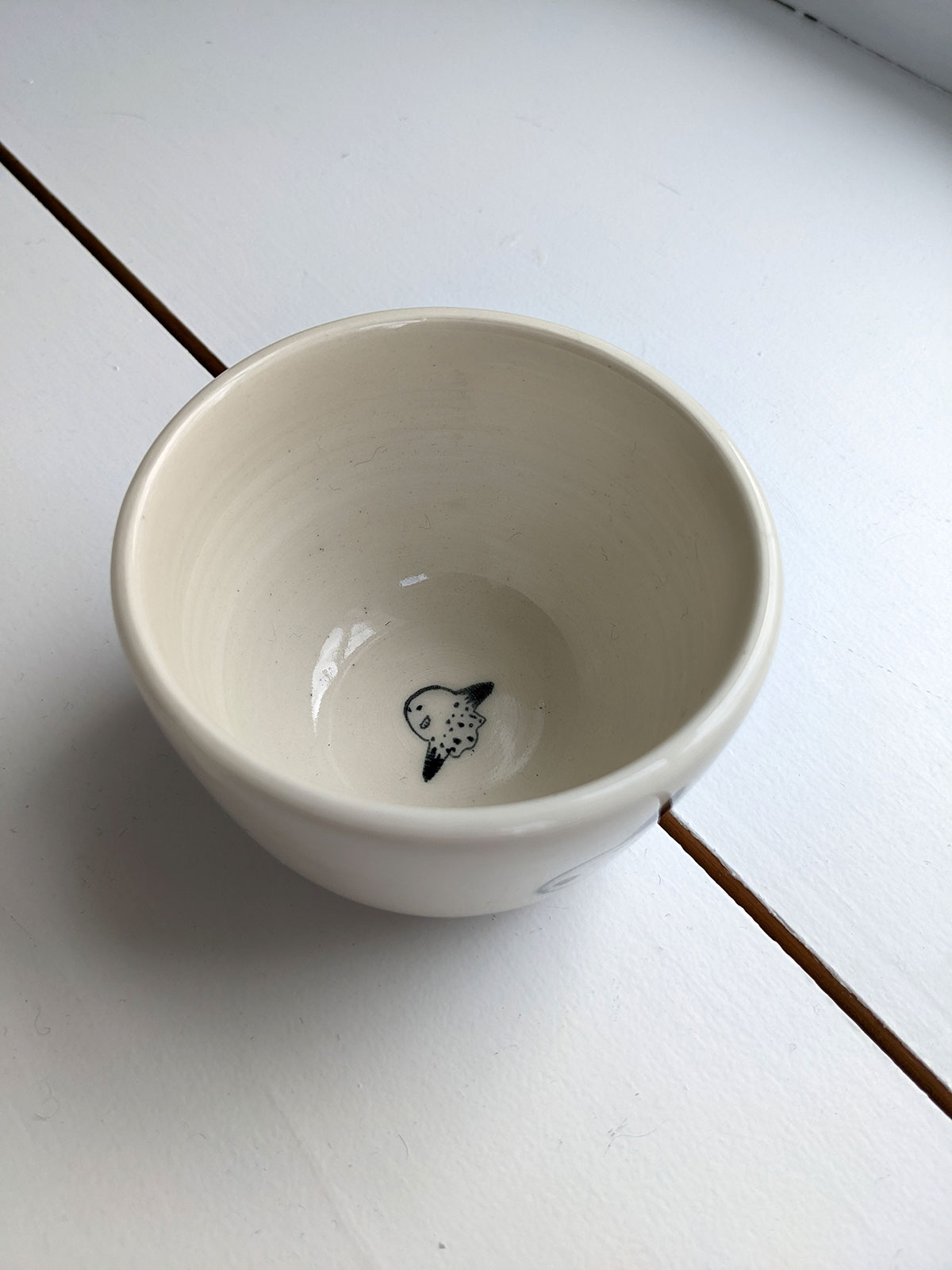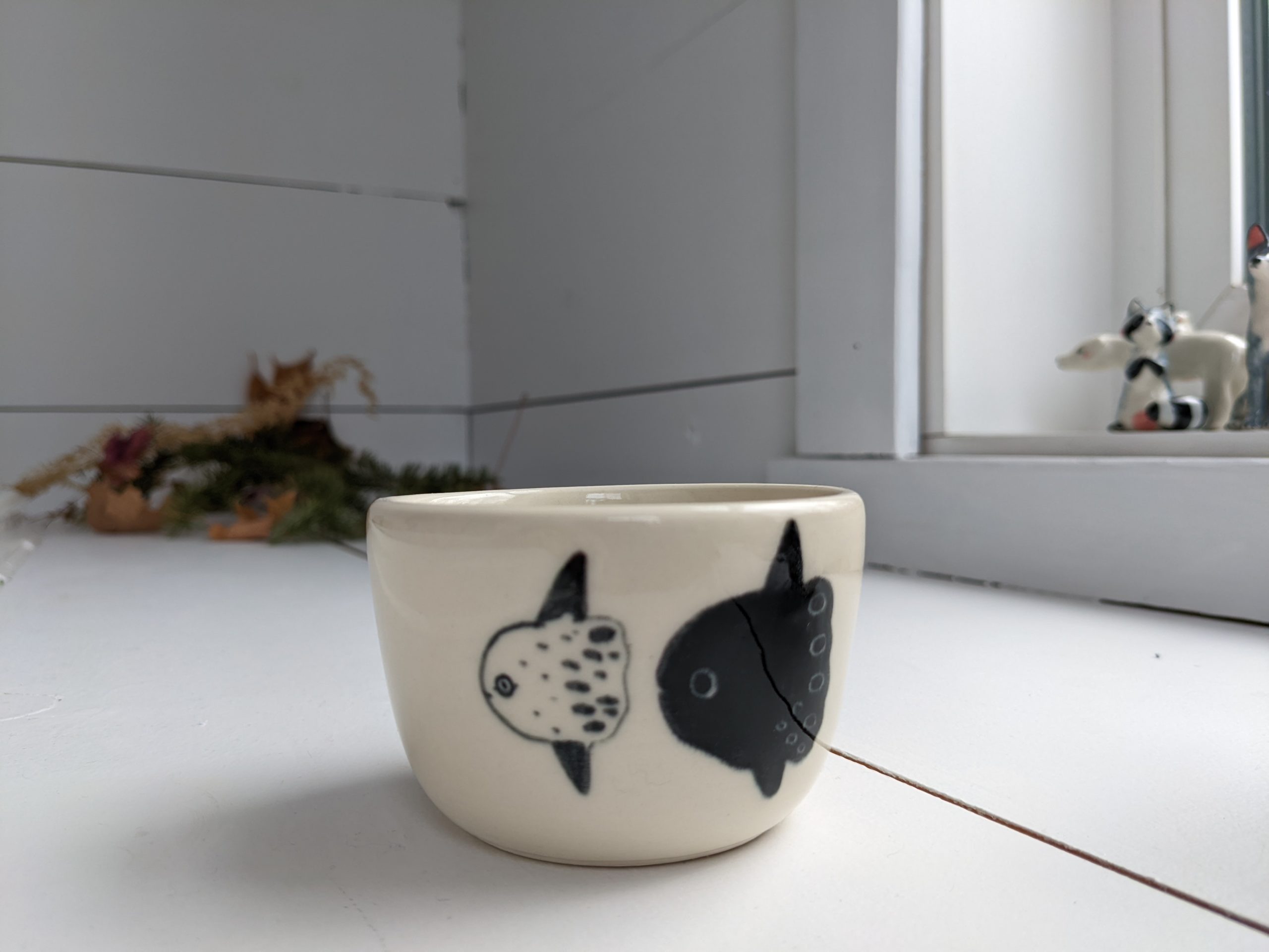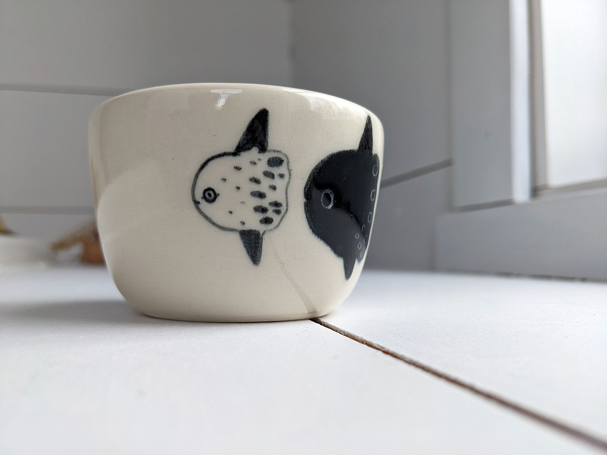 Small porcelain tumbler with a sunfish decor. It’s in white porcelain and clear glaze. Food safe, this tiny tumbler is 5 cm wide and 8 cm high. Handmade pottery from Montréal, Québec.