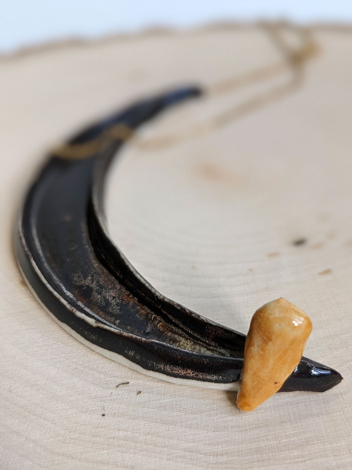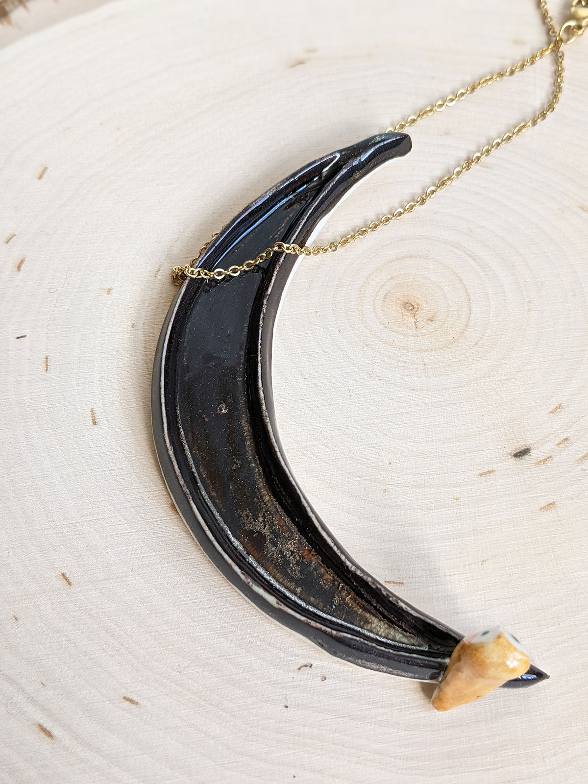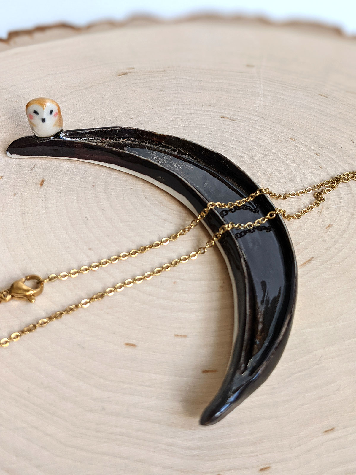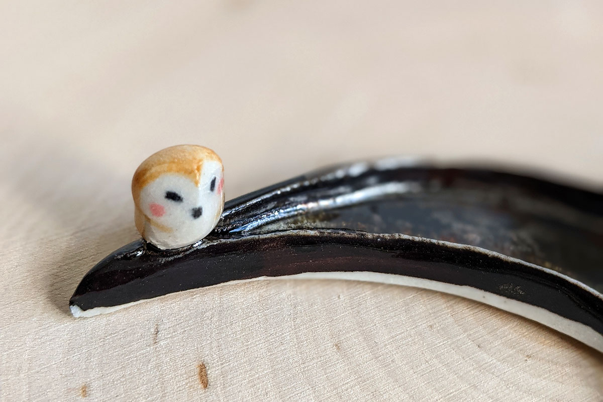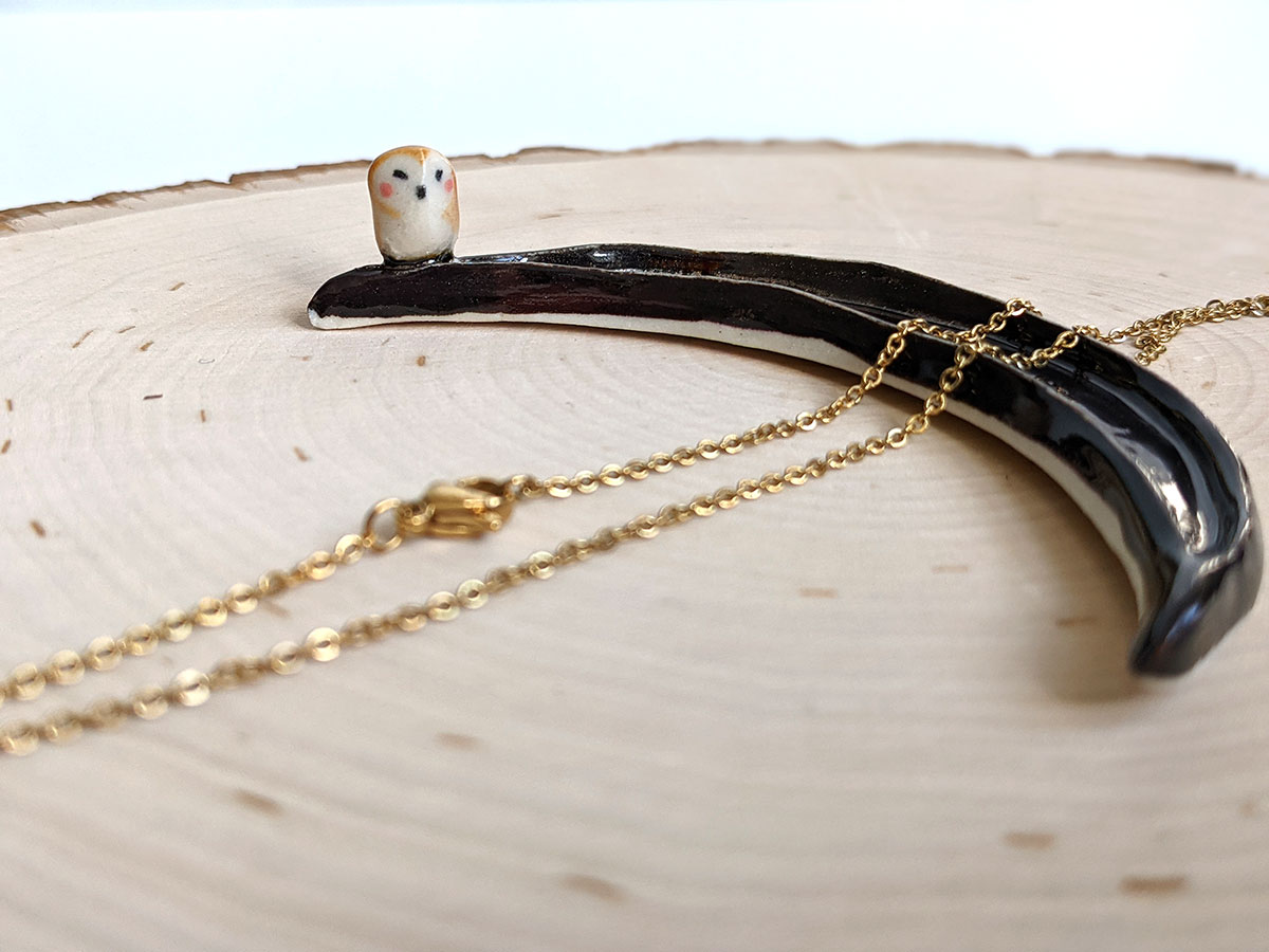 Small moon shaped jewelry dish with a barn owl, the glaze has little golden speckles on a warm black background. Handcrafted in Montréal, this one of a kind piece is about 8 cm long.