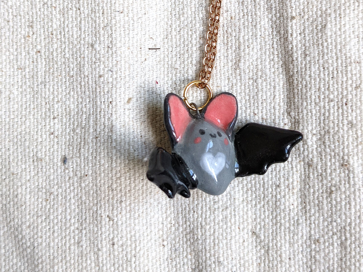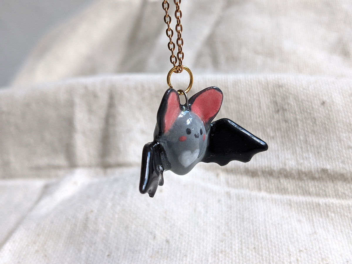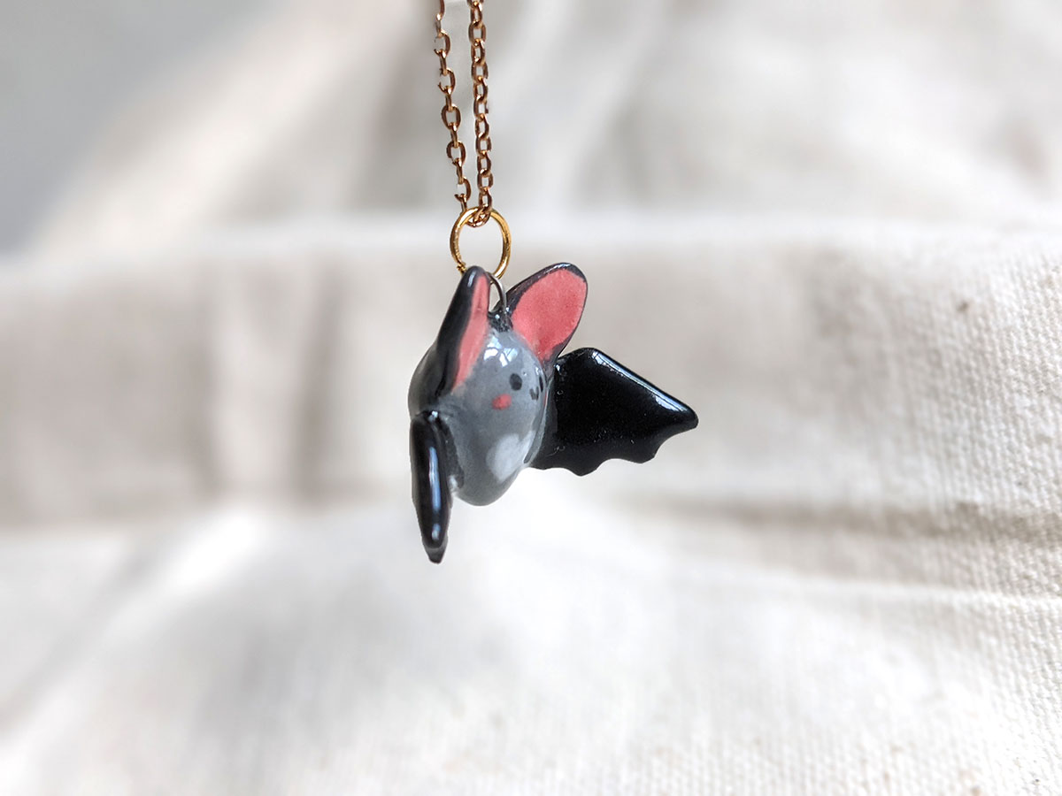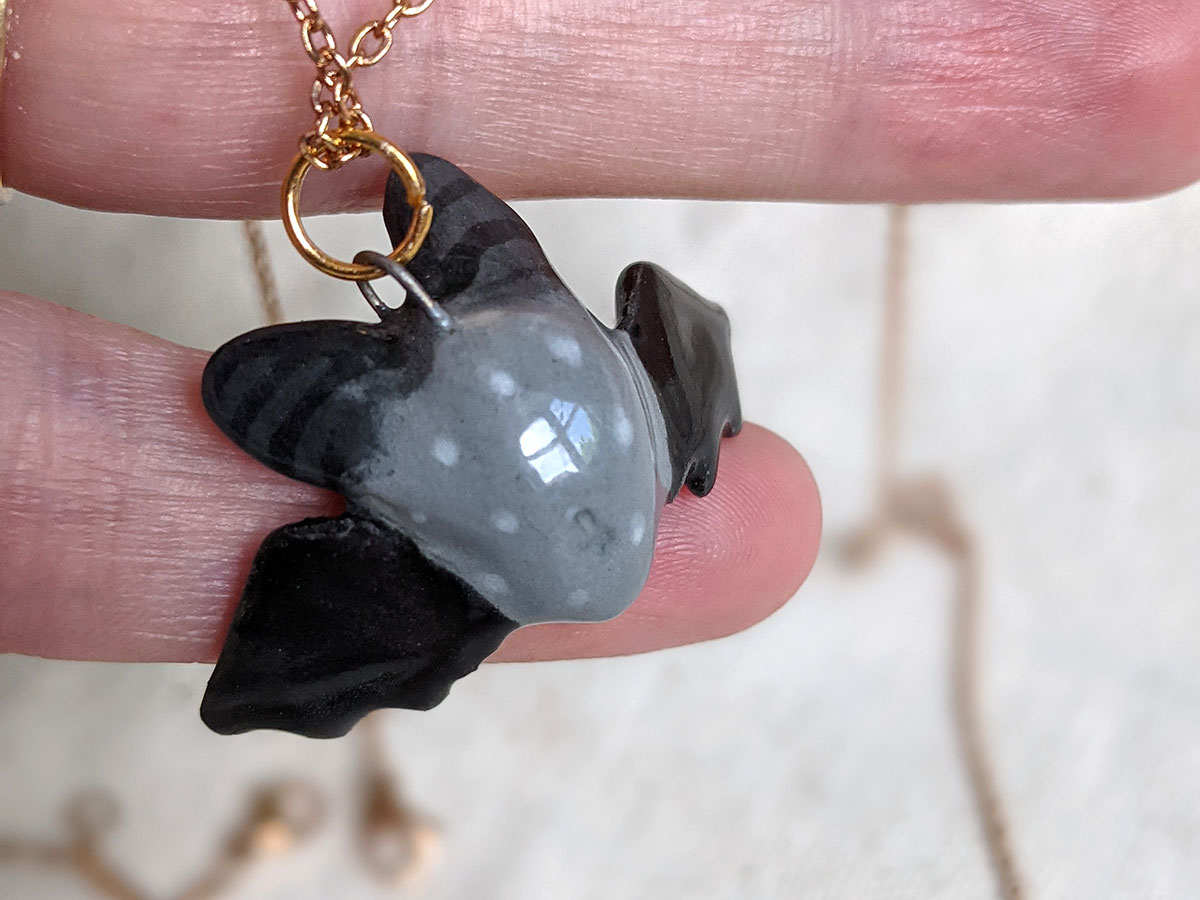 Petite chauve souris en céramique grise et noire. Pendentif unique, chaîne non inclue.