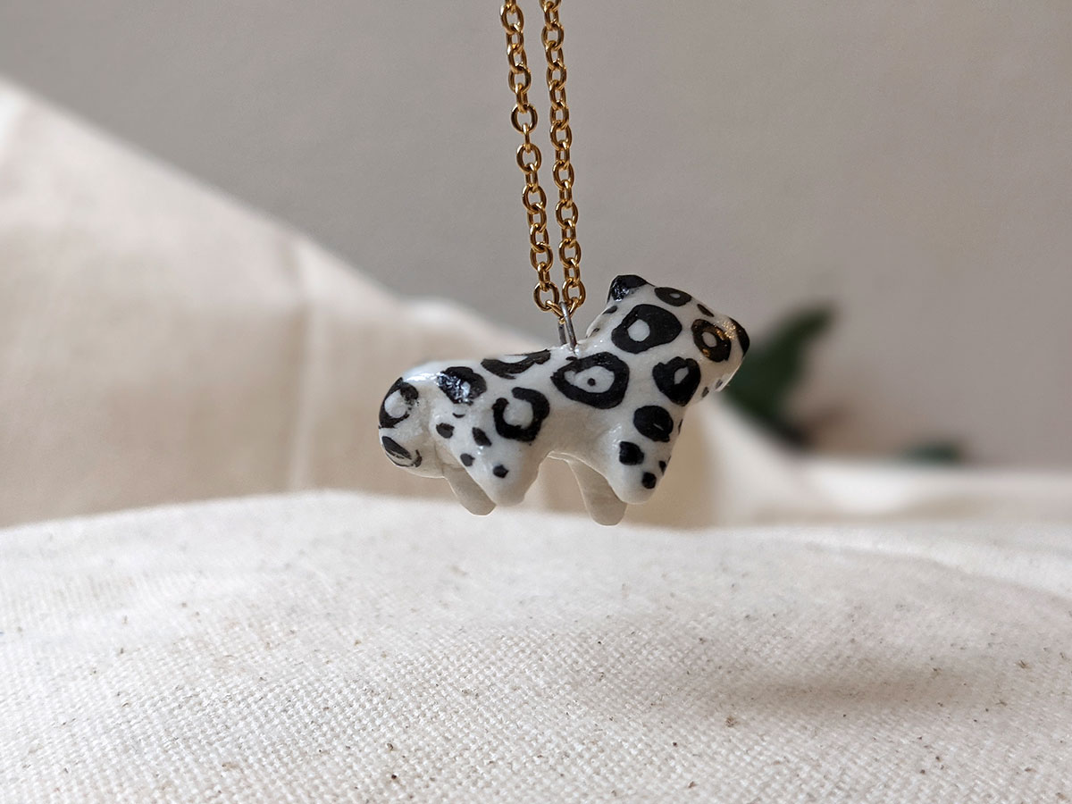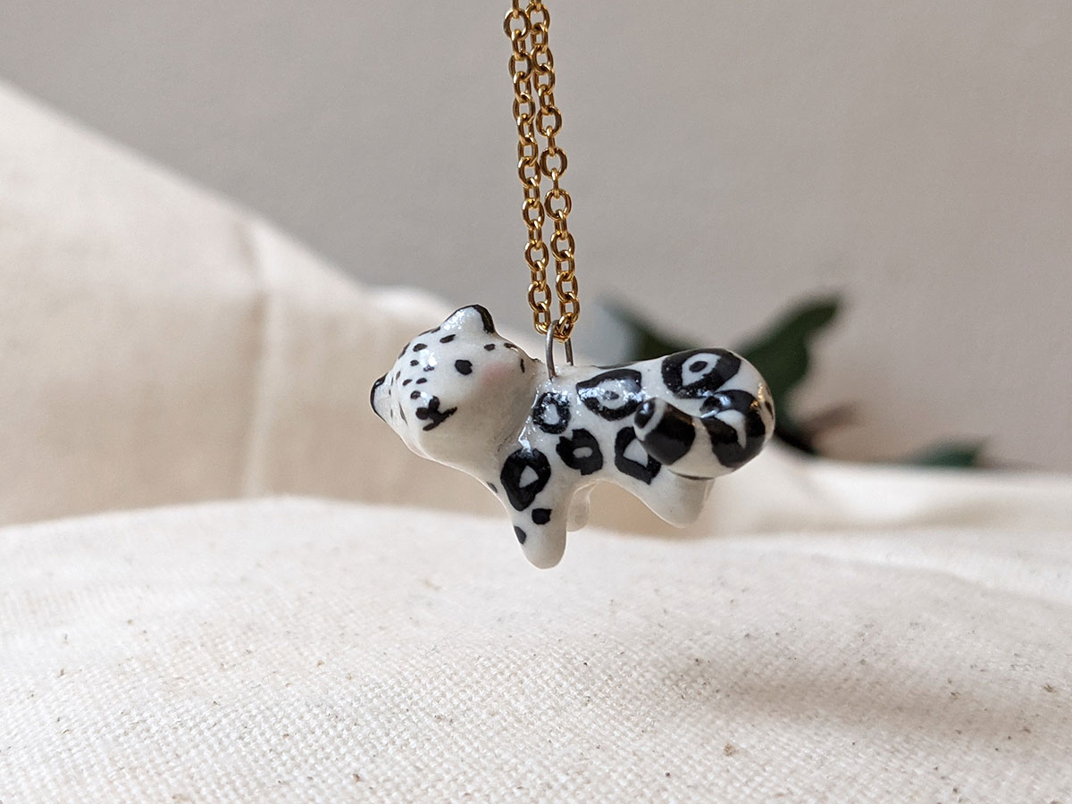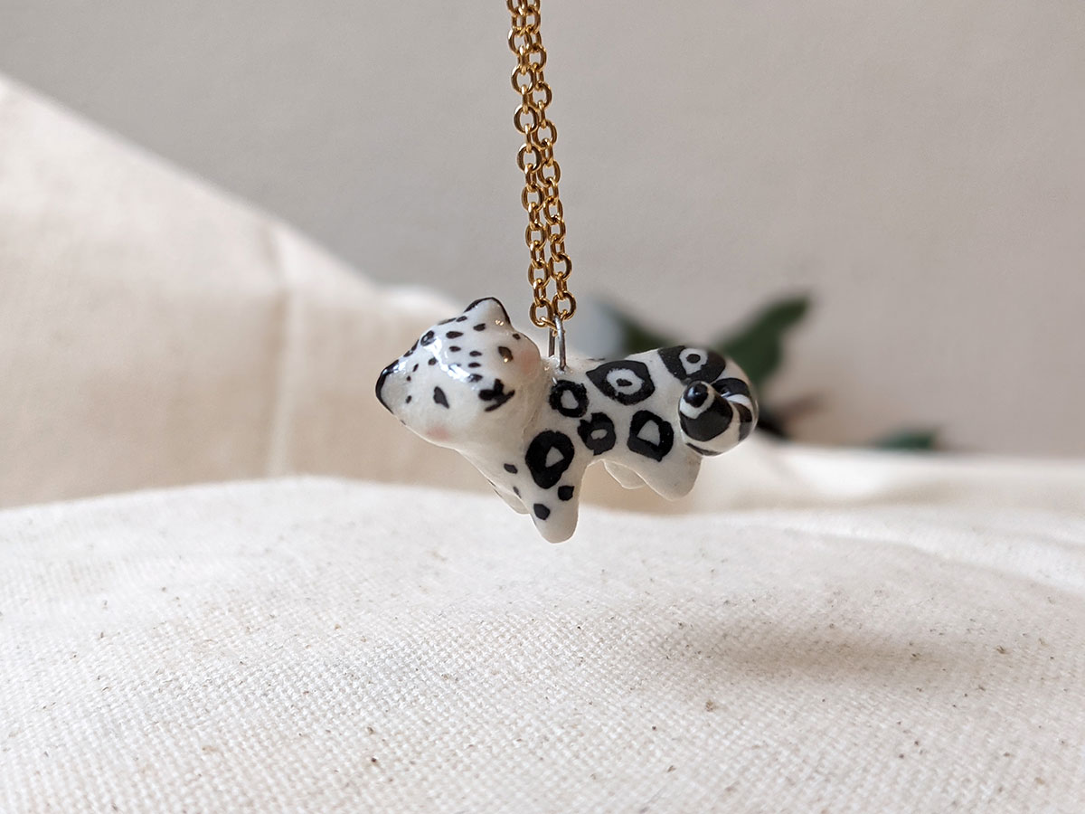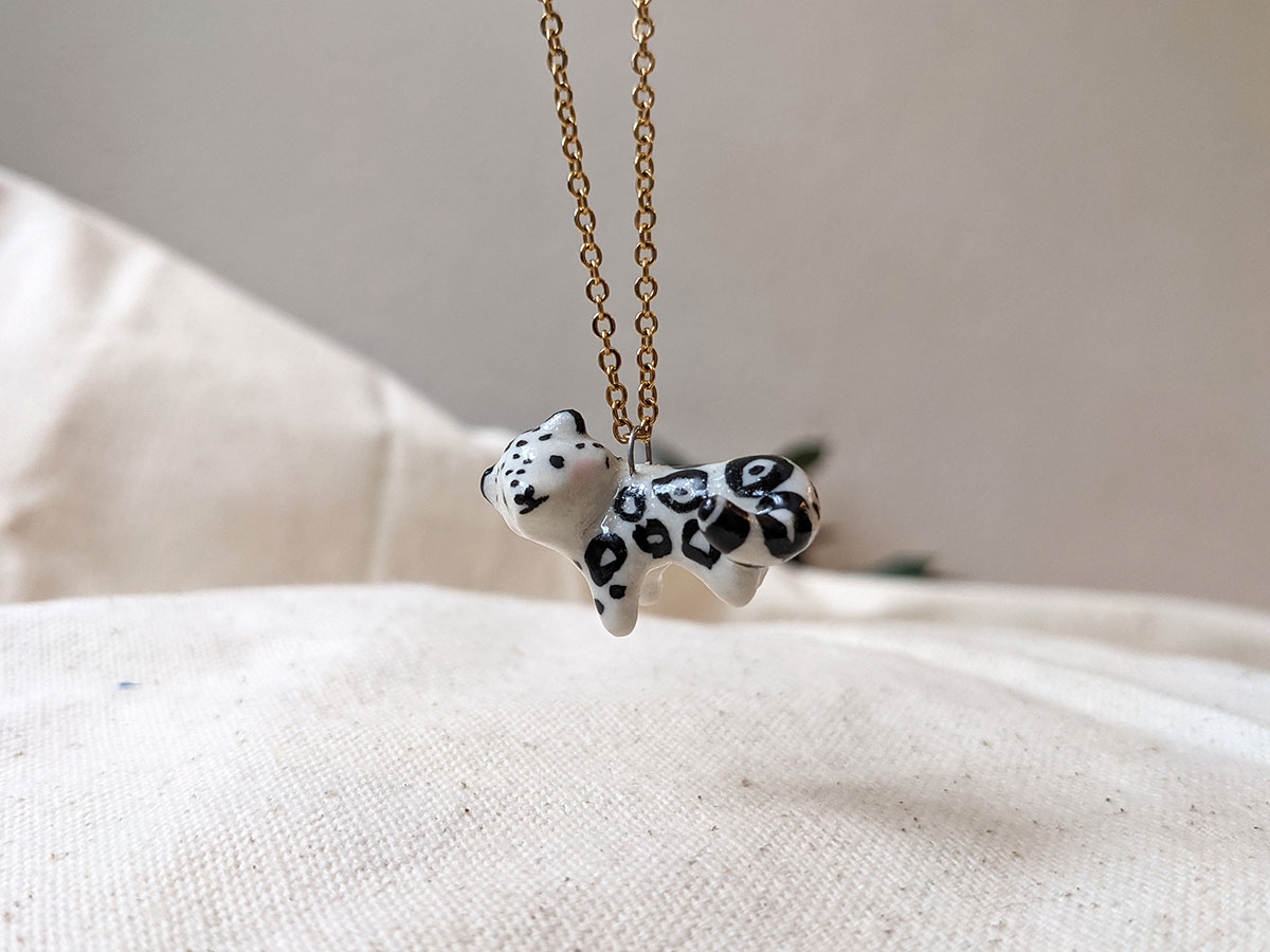 Pendentif de léopard des neiges en porcelaine. Environ 2-3 cm de haut. Pièce unique, boîte illustrée inclue. Chaîne vendue séparément