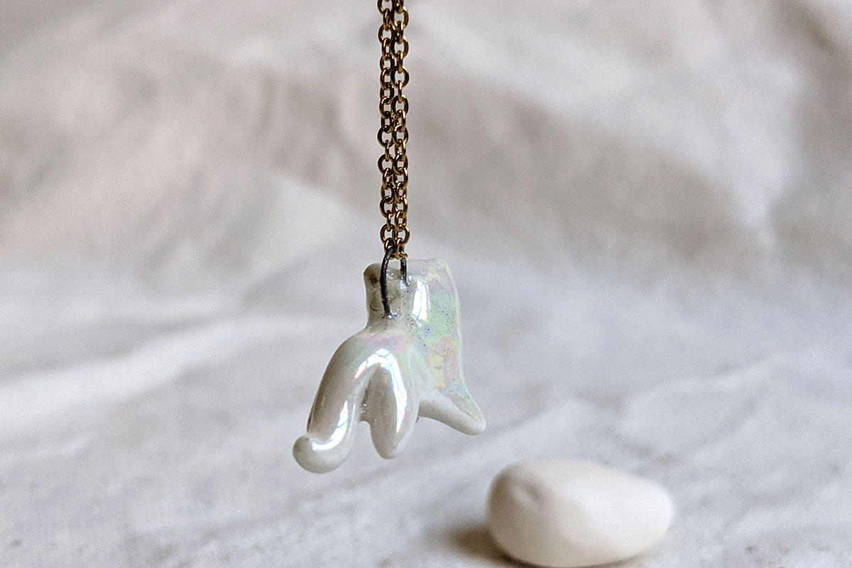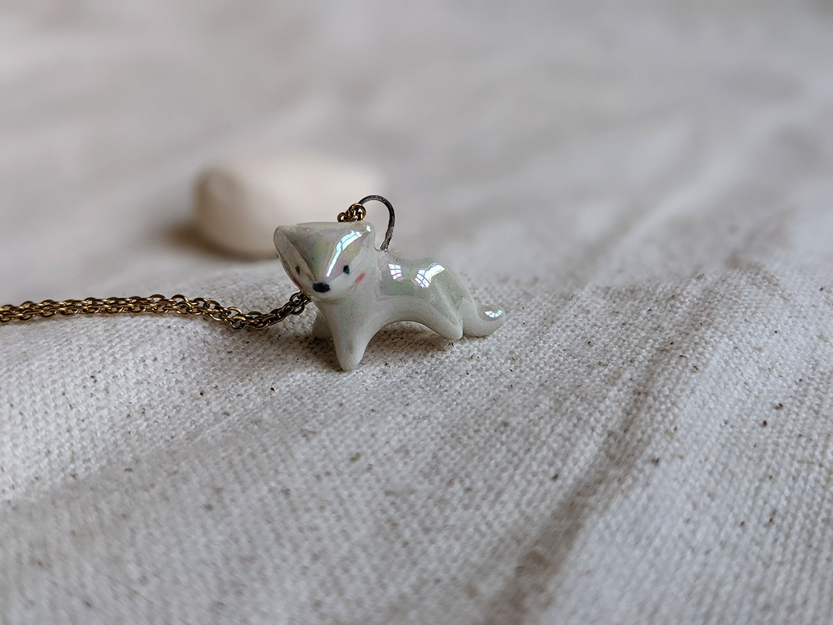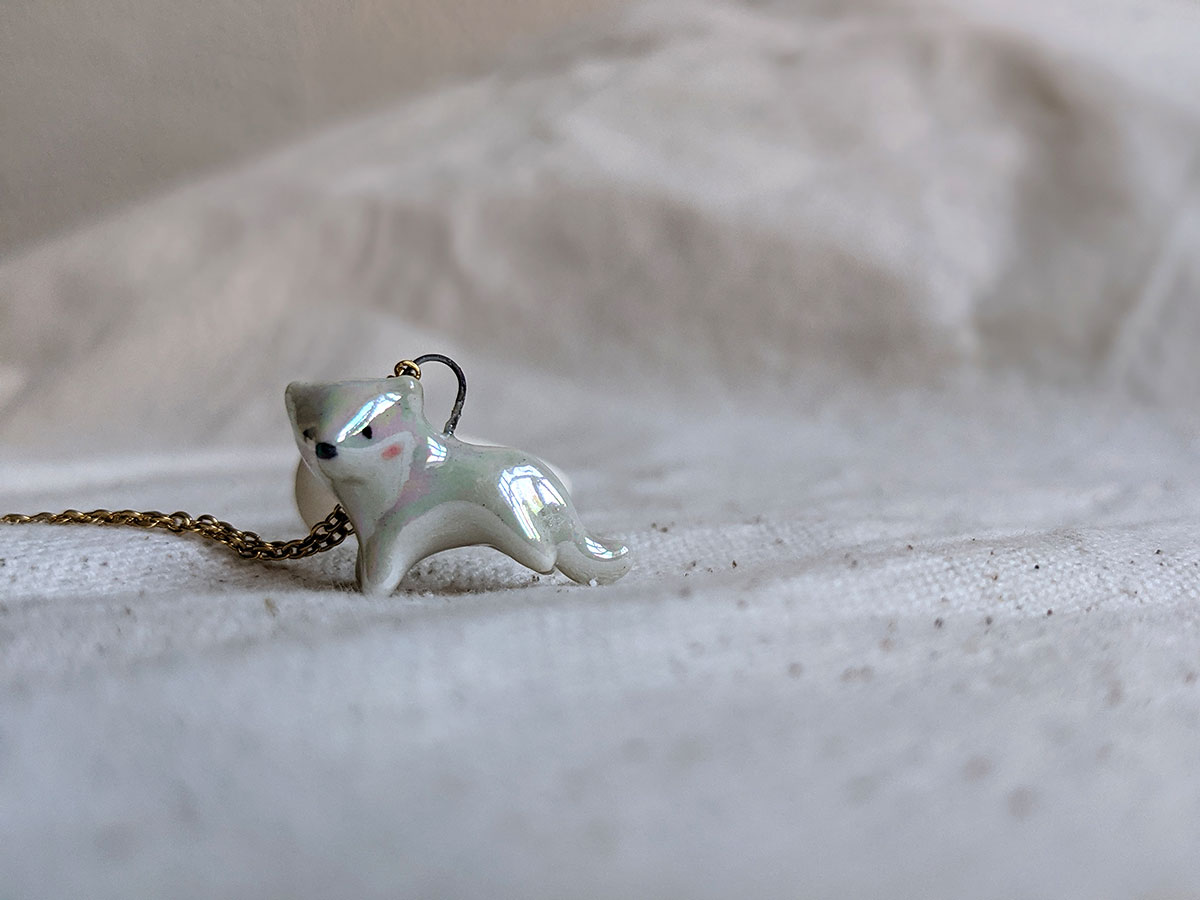 Pendentif en porcelaine de panthère blanche entièrement nacrée. Ce petit pendentif d’environ 2 cm de large a été entièrement réalisé à la main à Montréal. Chaîne vendue séparément.